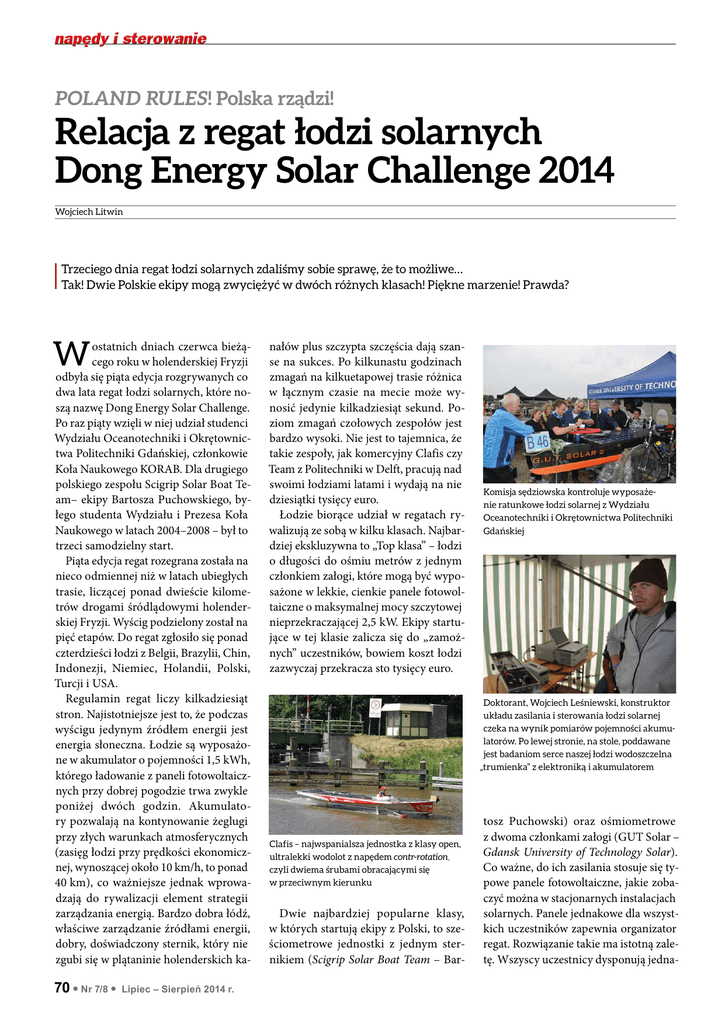 POLAND RULES! Polska rządzi! Relacja z regat łodzi solarnych Dong Energy Solar Challenge 2014 Wojciech Litwin Trzeciego dnia regat łodzi solarnych zdaliśmy sobie sprawę, że to możliwe… Tak! Dwie Polskie ekipy mogą zwyciężyć w dwóch różnych klasach! Piękne marzenie! Prawda? W ostatnich dniach czerwca bieżącego roku w holenderskiej Fryzji odbyła się piąta edycja rozgrywanych co dwa lata regat łodzi solarnych, które noszą nazwę Dong Energy Solar Challenge. Po raz piąty wzięli w niej udział studenci Wydziału Oceanotechniki i Okrętownictwa Politechniki Gdańskiej, członkowie Koła Naukowego KORAB. Dla drugiego polskiego zespołu Scigrip Solar Boat Team– ekipy Bartosza Puchowskiego, byłego studenta Wydziału i Prezesa Koła Naukowego w latach 2004–2008 – był to trzeci samodzielny start. Piąta edycja regat rozegrana została na nieco odmiennej niż w latach ubiegłych trasie, liczącej ponad dwieście kilometrów drogami śródlądowymi holenderskiej Fryzji. Wyścig podzielony został na pięć etapów. Do regat zgłosiło się ponad czterdzieści łodzi z Belgii, Brazylii, Chin, Indonezji, Niemiec, Holandii, Polski, Turcji i USA. Regulamin regat liczy kilkadziesiąt stron. Najistotniejsze jest to, że podczas wyścigu jedynym źródłem energii jest energia słoneczna. Łodzie są wyposażone w akumulator o pojemności 1,5 kWh, którego ładowanie z paneli fotowoltaicznych przy dobrej pogodzie trwa zwykle poniżej dwóch godzin. Akumulatory pozwalają na kontynowanie żeglugi przy złych warunkach atmosferycznych (zasięg łodzi przy prędkości ekonomicznej, wynoszącej około 10 km/h, to ponad 40 km), co ważniejsze jednak wprowadzają do rywalizacji element strategii zarządzania energią. Bardzo dobra łódź, właściwe zarządzanie źródłami energii, dobry, doświadczony sternik, który nie zgubi się w plątaninie holenderskich ka- 70 l Nr 7/8 l Lipiec – Sierpień 2014 r. nałów plus szczypta szczęścia dają szanse na sukces. Po kilkunastu godzinach zmagań na kilkuetapowej trasie różnica w łącznym czasie na mecie może wynosić jedynie kilkadziesiąt sekund. Poziom zmagań czołowych zespołów jest bardzo wysoki. Nie jest to tajemnica, że takie zespoły, jak komercyjny Clafis czy Team z Politechniki w Delft, pracują nad swoimi łodziami latami i wydają na nie dziesiątki tysięcy euro. Łodzie biorące udział w regatach rywalizują ze sobą w kilku klasach. Najbardziej ekskluzywna to „Top klasa” – łodzi o długości do ośmiu metrów z jednym członkiem załogi, które mogą być wyposażone w lekkie, cienkie panele fotowoltaiczne o maksymalnej mocy szczytowej nieprzekraczającej 2,5 kW. Ekipy startujące w tej klasie zalicza się do „zamożnych” uczestników, bowiem koszt łodzi zazwyczaj przekracza sto tysięcy euro. Komisja sędziowska kontroluje wyposażenie ratunkowe łodzi solarnej z Wydziału Oceanotechniki i Okrętownictwa Politechniki Gdańskiej Doktorant, Wojciech Leśniewski, konstruktor układu zasilania i sterowania łodzi solarnej czeka na wynik pomiarów pojemności akumulatorów. Po lewej stronie, na stole, poddawane jest badaniom serce naszej łodzi wodoszczelna „trumienka” z elektroniką i akumulatorem Clafis – najwspanialsza jednostka z klasy open, ultralekki wodolot z napędem contr-rotation, czyli dwiema śrubami obracającymi się w przeciwnym kierunku Dwie najbardziej popularne klasy, w których startują ekipy z Polski, to sześciometrowe jednostki z jednym sternikiem (Scigrip Solar Boat Team – Bar- tosz Puchowski) oraz ośmiometrowe z dwoma członkami załogi (GUT Solar – Gdansk University of Technology Solar). Co ważne, do ich zasilania stosuje się typowe panele fotowoltaiczne, jakie zobaczyć można w stacjonarnych instalacjach solarnych. Panele jednakowe dla wszystkich uczestników zapewnia organizator regat. Rozwiązanie takie ma istotną zaletę. Wszyscy uczestnicy dysponują jedna- Nasza łódź – zawsze łatwa do rozpoznania nawet z daleka dzięki banderze na dziobie kowym źródłem energii o mocy szczytowej 1000 Wp w klasie łodzi jedno- i 1250 Wp w klasie dwuosobowych. Polskie zespoły pierwsze dotarły na miejsce zmagań i ciągu dwóch dni zmontowały swoje łodzie solarne, które miały za sobą ciężką podróż na przyczepach po nie zawsze idealnych drogach. Aby wziąć udział w zmaganiach, jednostki musiały przejść złożoną, kilkuetapową kontrolę techniczną. Komisja sędziowska dokonała między innymi pomiarów pojemności akumulatorów. Już w pierwszych dniach regat nie obeszło się bez dramatycznych przeżyć. Podczas obowiązkowego dla sterników testu pływackiego mało nie utonęły trzy osoby. Kluczowa okazała się interwencja Bartosza Puchowskiego, który wraz z kolegą z zespołu wykazał się refleksem i zimną krwią. Płynąc wpław pomiędzy łodziami motorowymi, uratował jednego z tonących. Już następnego dnia doszło do poważnej awarii na jednej z łodzi. Prawdopodobnie w wyniku przeładowania akumulatora doszło do poważnego pożaru. W ciągu kilku minut jedna z łodzi doszczętnie spłonęła. Łódź z Politechniki Gdańskiej już podczas pierwszych startów pokazała swoje wysokie możliwości. Odniesiono zwycięstwo w prologu, a potem kolejno w dwóch pierwszych etapach zmagań. Gdańska łódź zajmowała pierwsze miejsce w klasie łodzi dwuosobowych z przewagą ponad pięćdziesięciu minut nad ekipami z Holandii. Co więcej, w klasyfikacji generalnej, w której sklasyfikowano wszystkie łodzie, zespół był na ósmym miejscu na trzydzieści pięć ciągle ścigających się jednostek. Był to dobry wynik, bo należy pamiętać, że w regatach brało udział kilka łodzi z top klasy. Kolejne dni zmagań wymagały znacznego wysiłku. Z samego rana likwidowano bazę, wodowano łódź, potem następowała pogoń za płynącą jednostką, tak aby w razie potrzeby udzielić jej pomocy technicznej. Po południu należało wyciąg