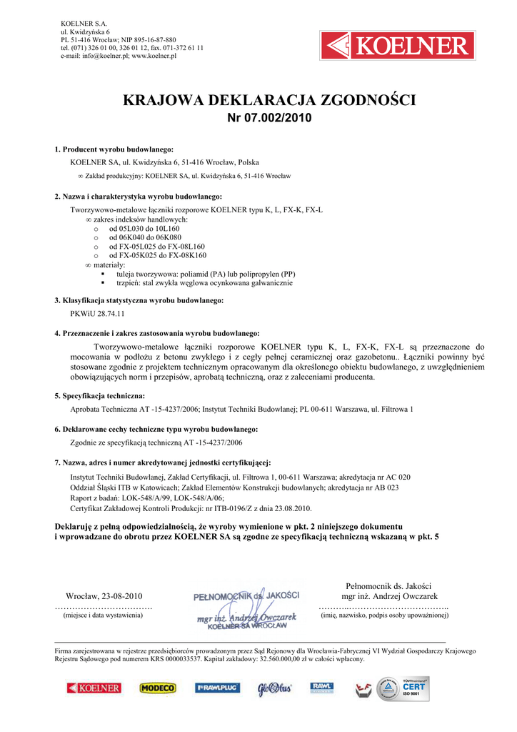 KOELNER S.A. ul. Kwidzyńska 6 PL 51-416 Wrocław; NIP 895-16-87-880 tel. (071) 326 01 00, 326 01 12, fax. 071-372 61 11 e-mail: [email protected]; www.koelner.pl KRAJOWA DEKLARACJA ZGODNOŚCI Nr 07.002/2010 1. Producent wyrobu budowlanego: KOELNER SA, ul. Kwidzyńska 6, 51-416 Wrocław, Polska • Zakład produkcyjny: KOELNER SA, ul. Kwidzyńska 6, 51-416 Wrocław 2. Nazwa i charakterystyka wyrobu budowlanego: Tworzywowo-metalowe łączniki rozporowe KOELNER typu K, L, FX-K, FX-L • zakres indeksów handlowych: o od 05L030 do 10L160 o od 06K040 do 06K080 o od FX-05L025 do FX-08L160 o od FX-05K025 do FX-08K160 • materiały: tuleja tworzywowa: poliamid (PA) lub polipropylen (PP) trzpień: stal zwykła węglowa ocynkowana galwanicznie 3. Klasyfikacja statystyczna wyrobu budowlanego: PKWiU 28.74.11 4. Przeznaczenie i zakres zastosowania wyrobu budowlanego: Tworzywowo-metalowe łączniki rozporowe KOELNER typu K, L, FX-K, FX-L są przeznaczone do mocowania w podłoŜu z betonu zwykłego i z cegły pełnej ceramicznej oraz gazobetonu.. Łączniki powinny być stosowane zgodnie z projektem technicznym opracowanym dla określonego obiektu budowlanego, z uwzględnieniem obowiązujących norm i przepisów, aprobatą techniczną, oraz z zaleceniami producenta. 5. Specyfikacja techniczna: Aprobata Techniczna AT -15-4237/2006; Instytut Techniki Budowlanej; PL 00-611 Warszawa, ul. Filtrowa 1 6. Deklarowane cechy techniczne typu wyrobu budowlanego: Zgodnie ze specyfikacją techniczną AT -15-4237/2006 7. Nazwa, adres i numer akredytowanej jednostki certyfikującej: Instytut Techniki Budowlanej, Zakład Certyfikacji, ul. Filtrowa 1, 00-611 Warszawa; akredytacja nr AC 020 Oddział Śląski ITB w Katowicach; Zakład Elementów Konstrukcji budowlanych; akredytacja nr AB 023 Raport z badań: LOK-548/A/99, LOK-548/A/06; Certyfikat Zakładowej Kontroli Produkcji: nr ITB-0196/Z z dnia 23.08.2010. Deklaruję z pełną odpowiedzialnością, Ŝe wyroby wymienione w pkt. 2 niniejszego dokumentu i wprowadzane do obrotu przez KOELNER SA są zgodne ze specyfikacją techniczną wskazaną w pkt. 5 Wrocław, 23-08-2010 ……………………………. Pełnomocnik ds. Jakości mgr inŜ. Andrzej Owczarek ………..…………………………….. (miejsce i data wystawienia) (imię, nazwisko, podpis osoby upowaŜnionej) Firma zarejestrowana w rejestrze przedsiębiorców prowadzonym przez Sąd Rejonowy dla Wrocławia-Fabrycznej VI Wydział Gospodarczy Krajowego Rejestru Sądowego pod numerem KRS 0000033537. Kapitał zakładowy: 32.560.000,00 zł w całości wpłacony.