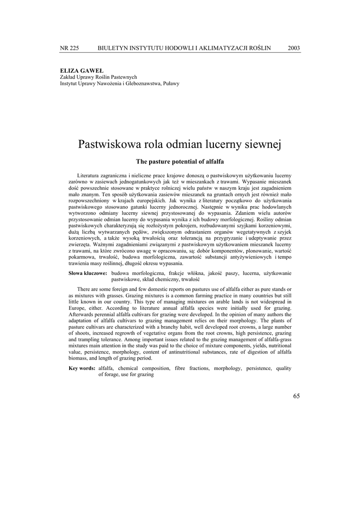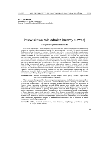NR 225 BIULETYN INSTYTUTU HODOWLI I AKLIMATYZACJI ROŚLIN 2003 ELIZA GAWEŁ Zakład Uprawy Roślin Pastewnych Instytut Uprawy Nawożenia i Gleboznawstwa, Puławy Pastwiskowa rola odmian lucerny siewnej The pasture potential of alfalfa Literatura zagraniczna i nieliczne prace krajowe donoszą o pastwiskowym użytkowaniu lucerny zarówno w zasiewach jednogatunkowych jak też w mieszankach z trawami. Wypasanie mieszanek dość powszechnie stosowane w praktyce rolniczej wielu państw w naszym kraju jest zagadnieniem mało znanym. Ten sposób użytkowania zasiewów mieszanek na gruntach ornych jest również mało rozpowszechniony w krajach europejskich. Jak wynika z literatury początkowo do użytkowania pastwiskowego stosowano gatunki lucerny jednorocznej. Następnie w wyniku prac hodowlanych wytworzono odmiany lucerny siewnej przystosowanej do wypasania. Zdaniem wielu autorów przystosowanie odmian lucerny do wypasania wynika z ich budowy morfologicznej. Rośliny odmian pastwiskowych charakteryzują się rozłożystym pokrojem, rozbudowanymi szyjkami korzeniowymi, dużą liczbą wytwarzanych pędów, zwiększonym odrastaniem organów wegetatywnych z szyjek korzeniowych, a także wysoką trwałością oraz tolerancją na przygryzanie i udeptywanie przez zwierzęta. Ważnymi zagadnieniami związanymi z pastwiskowym użytkowaniem mieszanek lucerny z trawami, na które zwrócono uwagę w opracowaniu, są: dobór komponentów, plonowanie, wartość pokarmowa, trwałość, budowa morfologiczna, zawartość substancji antyżywieniowych i tempo trawienia masy roślinnej, długość okresu wypasania. Słowa kluczowe: budowa morfologiczna, frakcje włókna, jakość paszy, lucerna, użytkowanie pastwiskowe, skład chemiczny, trwałość There are some foreign and few domestic reports on pastures use of alfalfa either as pure stands or as mixtures with grasses. Grazing mixtures is a common farming practice in many countries but still little known in our country. This type of managing mixtures on arable lands is not widespread in Europe, either. According to literature annual alfalfa species were initially used for grazing. Afterwards perennial alfalfa cultivars for grazing were developed. In the opinion of many authors the adaptation of alfalfa cultivars to grazing management relies on their morphology. The plants of pasture cultivars are characterized with a branchy habit, well developed root crowns, a large number of shoots, increased regrowth of vegetative organs from the root crowns, high persistence, grazing and trampling tolerance. Among important issues related to the grazing management of alfalfa-grass mixtures main attention in the study was paid to the choice of mixture components, yields, nutritional value, persistence, morphology, content of antinutritional substances, rate of digestion of alfalfa biomass, and length of grazing period. Key words: alfalfa, chemical composition, fibre fractions, morphology, persistence, quality of forage, use for grazing 65 Eliza Gaweł WSTĘP Lucerna siewna cieszy się dużym uznaniem rolników głównie ze względu na wysokie plonowanie i dobrą jakość paszy, wzbogacanie gleby w azot wiązany na drodze symbiozy z bakteriami brodawkowymi (co ma szczególne znaczenie w gospodarowaniu w rolnictwie zrównoważonym) oraz jak twierdzi Talamucci (1994) jako roślina stosowana w krajach zachodniej i południowej Europy do zasiewu pól czasowo odłogowanych. W krajach śródziemnomorskich tradycyjnie stosuje się jednoroczne formy lucerny do zasiewu na pastwiska dla bydła i owiec. Ponadto praktykuje się tam wypasanie lucernika po zbiorze nasion. Nadal jednak najbardziej rozpowszechnionym sposobem wykorzystania paszy jest żywienie zwierząt zielonką lucerny dowożoną do obór bądź sianem, siano-kiszonką i kiszonką. Jak podaje Etienne (1994) w warunkach południowej Francji jednoroczne formy lucerny ze względu na małe wymagania wodne coraz częściej stosowane są do zasiewu pastwisk i zastępują popularną w tamtejszych warunkach siedliskowych koniczynę podziemną. W Hiszpanii pastwiskowo użytkowane są populacje dziko rosnące lucerny płożącej typu „mielga” wytwarzającej kłącza i stolony odporne na suszę, chłody oraz stres związany z wypasaniem. Porównanie budowy morfologicznej roślin jednorocznej Medicago polimorpha i „mielgi” oraz wieloletniej M. varia jak też M. falcata wykazało, że w warunkach wypasu symulowanego (częste koszenie) istotnie lepszą trwałością i głębiej osadzonymi, grubymi szyjkami korzeniowymi wyróżniała się „mielga” (Chaabane, Delgado Enguita, 1994). Obserwacje dziko rosnących form lucerny w warunkach wypasania zachęciło do zastosowania lucerny siewnej w badaniach pastwiskowych. W wielu rejonach świata poza tradycyjnym użytkowaniem kośnym lucerna siewna uprawiana w warunkach polowych znajduje zastosowanie jako roślina pastwiskowa (Hijano, Romero, 1996; Mauriés, 1994; Mauriés, Paillat, 1997; Van Keuren, Matches, 1998; Gaweł, 2000 a; Gaweł, 2000 b; Andrzejewska, Harasimowicz-Herman, 1997; Etienne, 1994). Istnieje nawet pogląd, że lucerna lepiej znosi wypasanie niż intensywne użytkowanie kośne. Zdaniem Louault i wsp. (1994) pozostawienie na ścierni przez zwierzęta nawet niewielkiej liczby liści zdolnych do kontynuowania procesów życiowych stwarza możliwość szybkiej odbudowy powierzchni asymilacyjnej i zwiększa trwałość roślin. Prace hodowlane w kilku krajach doprowadziły do uzyskania odmian przydatnych do wypasania. W doborze lucerny pastwiskowej znajdują się odmiany: amerykańskie, tj. Haygrazer, Magna Graze, Waygrazer oraz Maxi Graze GT — przydatna do wypasu ciągłego, francuskie: Luzelle o półwzniesionym pokroju roślin, cienkich dobrze ulistnionych łodygach i grubych szyjkach korzeniowych (Charrier, 1993; Gaweł, 1987) oraz odmiany nadające się do uprawy w rejonie Morza Sródziemnego: Crau oraz Coussouls (Nouvelles variétés....., 1998), a także węg