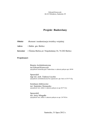 Edward Krawczyk 66-415 Kłodawa, Santocko 29 Projekt Budowlany Obiekt :Remont i modernizacja świetlicy wiejskiej Adres : Babin gm. Bielice Inwestor : Gmina Bielice,ul. Niepokalanej 34, 74-202 Bielice Projektanci: Branża Architektoniczna inż Edward Krawczyk specjalność konstrukcyjno- budowlana w zakresie pełnym upr. 88/84 Sprawdził: mgr inż. arch .Tadeusz Łuczko specjalność architektoniczna bez ograniczeń ,upr. bud. nr 253/71/Zg Instalacje elektryczne: inż. Stanisław Siemaszko specjalność inst. elektr.w zakresie pełnym nr upr.30/77.Gw Sprawdził: inż. Jerzy Mingałło specjalność inst. elektr.w zakresie pełnym nr upr. 24/78/Gw Santocko, 31 lipca 2012 r. Zawartość opracowania: Branża budowlana I. Spis stron opracowania: 1. Strona tytułowa .........................................................................................str. 1 2. Zawartość opracowania.............................................................................str. 2 3.Projekt budowlany tom I– Projekt zagospodarowania terenu...........str. 3 3. 1. Decyzja o warunkach zabudowy..........................................................str. 4 3. 2. Opis techniczny.................................................................................... str.5-6 3. 3. Informacja BIOZ .................................................................................str. 7-8 3. 3. Zaświadczenia z LOIIB w Gorzowie Wlkp.......................................... str. 9-12 3. 4. Uprawnienia bud. ................................................................................. str.13-16 3. 5. Oświadczenie ....................................................................................... str. 17 II Spis rysunków i projektów rys.1.Projekt zagospodarowania terenu ....................................................str. 18 4.Projekt architektoniczo-budowlany...................................................... str. 19 4.1. Zawartość opracowania...........................................................................str. 20 4.2. Ocena stanu technicznego.......................................................................str.21-22 4.3 Opis techniczny arch.-konstr. ............................................................... str. 23-24 4.4. Opis techniczny do projektu wykonawczego.........................................str. 25 Inwentaryzacja istniejącego budynku świetlicy rys.1. Rzut parteru .......................................................................................str..26 rys.2. Rzut dachu...........................................................................................str. 27 rys.3. Elewacje...............................................................................................str. 28 Część archit-budowlana rys.A1. Rzut parteru........................................................................................str.29 rys.A2. Rzut dachu......................................................................................... str.30 rys.A3. Elewacje.............................................................................................str. 31 Część elektryczna 1. Strona tytułowa...........................................................................................str. 32 2. Opis techniczny z obliczeniami..................................................................str. 333. Rysunki techniczne ....................................................................................str. Opis techniczny 1. Temat i zakres opracowania Tematem opracowania jest projekt techniczny architektury zagospodarowania działki budynku świetlicy wiejskiej w Babinie gm. Bielice, dz. nr 111 2. Podstawy opracowania 2.1. Zlecenie i uzgodnienia z inwestorem 2.2. Wizja lokalna w terenie,i uzgodnienia z inwestorem, 2.3. Mapa sytuacyjno-wysokościowa 1:500 2.4.Aktualne przepisy i normy 2.5. Decyzja o warunkach zabudowy z U. Gminy Bielice 2.6. Rozporządzenie ministra spraw wewnętrznych i administracji z 3 lipca 2003r w sprawie szczegółowego zakresu i formy projektu budowlanego (Dz. U. nr 120) 2.7. Warunki geotechniczne. Zgodnie z rozporządzeniem Ministra Spraw Wewn. i Administr. w sprawie ustalenia geotechnicznych warunków posadowienia obiektów budowlanych z dnia 24 września 1998 r. (dz. u. 126 poz. 836) § 7 pkt 1,-posadowienie budynków zaliczano do pierwszej kategorii geotechn. obejmującej proste warunki gruntowe. nie ma konieczności wykonywania opinii geotechnicznej. Pod projektowany budynek nie były wykonywane doły próbne i techniczne badania podłoża gruntowego z uwagi na to,że zakres robót remontowych nie obejmuje fundamentów,a sam budynek nie ma oznak złego posadowienia. 3. Lokalizacja i opis działki Działka stanowi własność inwestora. położona jest w Babinie gm. Bielice nr dz.111 , posiada uzbrojenie energetyczne i sanitarne i jest zabudowana budynkiem parterowym z częścią kuchenno-sanitarną oraz pomieszczeniami remizy Ochotniczej Straży Pożarnej. Teren działki powierzchniowo płaski całkowicie objęty zagospodarowaniem. 4. Przeznaczenie i program użytkowy budynku Budynek parterowy bez poddasza użytkowego o zwartej bryle z dachem kopertowym, trójspadowym, o nachyleniu 5% ,pokrytym papą .Konstrukcja budynku o ścianach murowanych z cegły . Obiekt wybudowany w latach przedwojennych ub. wieku. W przyziemiu budynku zasadniczego znajduje się sala główna świetlicy. Do szczytu w części tylnej w latach powojennych ,wykonano dobudówkę ,z kuchnią i zapleczem gospodarczym , oraz częścią sanitarną w celu stworzenia lepszych warunków dla rozbudowanej świetlicy wiejskiej. Również do tylnej elewacji podłużnej dobudowany został budynek na potrzeby remizy OSP. Pomieszczenie remizy nie jest objęte projektem. Budynek świetlicy nie jest ogrzewany. Zakres inwestycji obejmuje wewnętrzne roboty remontowe w branży budowlanej i elektrycznej z montażem podlicznika, ocieplenie elewacji budynku szczytu przedniego i tylnego, oraz el