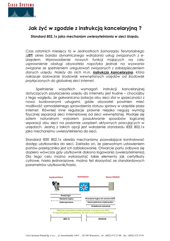 Jak żyć w zgodzie z instrukcją kancelaryjną ? Standard 802.1x jako mechanizm uwierzytelniania w sieci Urzędu. Czas ostatnich miesięcy to w Jednostkach Samorządu Terytorialnego (JST) okres bardzo dynamicznego wdrażania usług związanych z eUrzędem. Wprowadzenie nowych funkcji mających na celu usprawnienie obsługi obywatela napotyka jednak na wyzwania związane ze spełnieniem uregulowań związanych z zabezpieczeniem danych urzędu. Należy do nich m.in. instrukcja kancelaryjna, która nakazuje izolowanie środowisk wewnętrznych urzędów od środowisk przyłączonych do globalnej sieci internet. Spełnienie wszystkich wymagań instrukcji kancelaryjnej dotyczących przyłaczenia urzędu do internetu jest trudne – chociażby z tego względu, że galwaniczna izolacja obu sieci stoi w sprzeczności z nowo budowanymi usługami, gdzie obywatel powinien mieć możliwość samodzielnego sprawdzenia statusu sprawy w urzędzie przez internet. Również inne regulacje prawne niejako negują wymóg fizycznej separacji sieci internetowej od sieci wewnętrznej. Wydaje się zatem naturalnym wyborem poszukiwanie sposobów logicznej separacji obu sieci na poziomie urządzeń aktywnych pracujących w urzędach. Jedną z takich opcji jest wdrożenie standardu IEEE 802.1x jako mechanizmu uwierzytelnienia do sieci. Standard IEEE 802.1x określa mechanizmy pozwalające kontrolować dostęp użytkownika do sieci. Zakłada on, że pierwotnym ustawieniem portów przełącznika jest ich zablokowanie. Otwarcie portu odbywa się dopiero wówczas gdy użytkownik dokona logowania (uwierzytelnienia). Dla tego celu można wykorzystać takie elementy jak certyfikaty cyfrowe, hasła jednorazowe, można też skorzystać ze standardowych parametrów użytkownik/hasło. Cisco Systems Poland Sp. z o.o. , al. Jerozolimskie 146 C , 02-305 Warszawa , tel : (4822) 572 27 00 , fax : (4822) 572 27 01 Na bazie przeprowadzonego uwierzytelnienia serwer sprawdzający tożsamość użytkownika może przesłać do przełącznika sieciowego dodatkowe parametry takie jak numer/nazwa sieci VLAN do którego powinien zostać przypisany port dany przełącznika, parametry związane z zapewnieniem jakości usług czy też przesłać profil bezpieczeństwa dla danego użytkownika. Możliwy jest zatem scenariusz przestawiony poniżej: użytkownicy korzystają z jednego urządzenia – przełącznika sieciowego. Część użytkowników korzysta z zasobów wewnętrznych urzędu, inna część korzysta z zasobów internetowych. Przedstawiony scenariusz nie jest w żaden sposób ograniczony do kilku sieci VLAN. Oznacza to, iż przedstawiony mechanizm może być z powodzeniem wykorzystany do segmentacji sieci w większych jednostkach administracji samorządowej. Bardzo ważnym elementem jest jednoznaczne zróżnicowanie dostępu użytkowników na poziomie logowania. Użytkownik logujący się do sieci jako Jan.Kowalski będzie przypisany do sieci VLAN o nazwie URZAD i będzie mógł korzystać z zasobów wewnętrznych. Ten sam użytkownik aby skorzystać z zasobów internetowych będzie musiał zalogować się na inne konto Jan.Kowalski.INET. Wprowadza to element świadomego korzystania z internetu przez użytkownika (konieczność logowania) oraz element jednoznacznej identyfikacji użytkownika przez administratora. W przypadku bardzo częstego modelu działania, w którym jedna stacja robocza służy zarówno do korzystania z informacji wewnętrznych jak i tych dostępnych w sieci internet, zaleca się wprowadzenie dodatkowego systemu zabezpieczenia samej stacji przed atakiem (aplikacje antywirusowe oraz aplikacje wykrywania włamań i nadużyć na hostach – Host IPS). Cisco Systems Poland Sp. z o.o. , al. Jerozolimskie 146 C , 02-305 Warszawa , tel : (4822) 572 27 00 , fax : (4822) 572 27 01 Rozwiązania Cisco Systems umożliwiają dodatkowo kontrolę działania tychże przed dopuszczeniem użytkownika do danego segmentu sieci. Oznacza to że użytkownik, który chce korzystać z sieci internetowej poza oczywistą koniecznością zalogowania się do sieci będzie musiał uprzednio sprawdzić czy włączony jest klient systemu antywirusowego oraz agent Host IPS (HIPS). W przypadku gdy dana stacja ma wyłączone systemy obronne nie zostanie dopuszczona do segmentu internetowego. Funkcjonalność ta stanowi część bardziej rozbudowanego systemu określanego jako Network Admission Contol (NAC). Co zatem jest konieczne aby zbudować opisany system ? Lista obejmuje szereg opisanych już powyżej elementów. ¾ ¾ ¾ ¾ przełącznik sieciowy, który obsługuje funkcjonalność 802.1x wraz z możliwością przypisania VLAN oraz innych parametrów. Wymóg ten spełniają praktycznie wszystkie obecnie dostępne przełączniki Cisco. Serwer uwierzytelnienia i autoryzacji np. Cisco Secure Access Control System (może współpracować z zewnętrzną bazą danych użytkowników np. z MS AD, bazami dostępnymi przez LDAP etc.) System Host IPS, np. Cisco Security Agent wraz z konsolą zarządzającą Systemy antywirusowe Przedstawiony system pozwala zatem na zbudowanie bezpiecznego mechanizmu korzystania z zasobów internetowych w urzędach. Nie tylko pozwala na logiczną izolację wewnętrznych zasobów sieciowych od sieci internetowej, ale gwarantuje scentralizowaną kontrolę dostępu Cisco Systems Poland Sp. z o.o. , al. Jerozolimskie 146 C , 02-305 Warszawa , tel : (4822) 572 27 00 , fax : (4822) 572 27 01 do obu z nich jak i pozwala na wymuszenie u użytkowników konkretnych mechanizmów zabezpieczeń przy żądaniu dostępu do sieci internetowe. Całość procesu jest zautomatyzowana oraz udokumentowana w logach zbieranych przez serwer uwierzytelnienia. Zaproponowane rozwiązanie spełnia nowe wymagania dotyczące budowy e-Urzędu, spełnia także szereg wymogów precyzowanych przez instrukcję kancelaryjną. Ostateczną decyzję, dotyczącą możliwości zastosowania tego rozwiązania pozostawiamy Państwu, jako administratorom i użyt