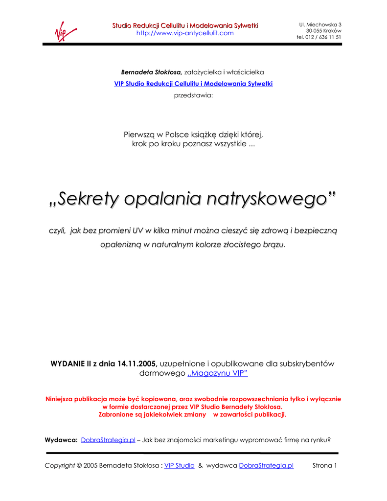 Studio Redukcji Cellulitu i Modelowania Sylwetki http://www.vip-antycellulit.com Ul. Miechowska 3 30-055 Kraków tel. 012 / 636 11 51 Bernadeta Stokłosa, założycielka i właścicielka VIP Studio Redukcji Cellulitu i Modelowania Sylwetki przedstawia: Pierwszą w Polsce książkę dzięki której, krok po kroku poznasz wszystkie ... „Sekrety opalania natryskowego” czyli, jak bez promieni UV w kilka minut można cieszyć się zdrową i bezpieczną opalenizną w naturalnym kolorze złocistego brązu. brązu WYDANIE II z dnia 14.11.2005, uzupełnione i opublikowane dla subskrybentów darmowego „Magazynu VIP” Niniejsza publikacja może być kopiowana, oraz swobodnie rozpowszechniania tylko i wyłącznie w formie dostarczonej przez VIP Studio Bernadety Stokłosa. Zabronione są jakiekolwiek zmiany w zawartości publikacji. Wydawca: DobraStrategia.pl – Jak bez znajomości marketingu wypromować firmę na rynku? Copyright © 2005 Bernadeta Stokłosa : VIP Studio & wydawca DobraStrategia.pl Strona 1 Ul. Miechowska 3 30-055 Kraków tel. 012 / 636 11 51 Studio Redukcji Cellulitu i Modelowania Sylwetki http://www.vip-antycellulit.com Wstęp, czyli jak to się zaczęło. Śmiali się wszyscy gdy na początku 2004 roku, jako pierwsza w Krakowie wprowadzałam w VIP Studio metodę opalania natryskowego. Tak, dobrze napisałam - wprowadzałam, a nie uruchomiłam tak po prostu z dnia na dzień. Dlaczego? Zaraz Ci to wyjaśnię. Jak z każdą nowością bywa, trzeba ją dokładnie poznać, trzeba ją przetestować, najlepiej na własnej skórze, przekonać się, że to co oferujemy innym jest dobre, nawet bardzo dobre, aby potem mieć pewność iż, klienci tacy jak Ty będą zadowoleni i będą polecać swoim znajomym opalanie natryskowe w VIP Studio. To nie taka prosta sprawa wziąć pierwszy lepszy pistolet malarski w rękę lub kabinę i popryskać całe ciało, jak to się niektórym wydaje. Najważniejszy jest dobry, długotrwały efekt i zadowolenie klienta. To jest jeden z najważniejszych celów tej metody opalania i klucz do sukcesu. Nawet firmy, które dwa lata temu oferowały wyposażenie gabinetów kosmetycznych w tą metodę opalania popełniały błędy podczas swoich prezentacji. O tych błędach piszę w dalszej część książki. Na początku myślałam, że kabina natryskowa to jest to. Kupujesz taką kabinę, wlewasz do niej płyn opalający, nic cię nie obchodzi i wszystko dzieje się automatycznie. Czy na pewno? O wszystkich metodach opalania natryskowego, o ich wadach Copyright © 2005 Bernadeta Stokłosa : VIP Studio & wydawca DobraStrategia.pl Strona 2 Studio Redukcji Cellulitu i Modelowania Sylwetki http://www.vip-antycellulit.com Ul. Miechowska 3 30-055 Kraków tel. 012 / 636 11 51 i zaletach dowiesz się z kolejnych rozdziałów. A płyn opalający, jaki wybrać aby opalenizna była naturalna i identyczna z tą słoneczną? Sama przetestowałam, jeśli się nie mylę kilkanaście różnych marek płynów opalających. Niektóre z nich nie nadawały się do niczego, a tym bardziej do opalania. Bo czy warto stosować tani płyn, najniższą cenę opalania wraz z najniższą jakością? Pewnie, że nie, o czym szybko przekonano się boleśnie w niektórych salonach kosmetycznych. Jeśli jesteś zwolennikiem opalania się w solarium i prażenia się godzinami na słońcu przeczytaj koniecznie rozdział: Dlaczego opalanie natryskowe jest bezpieczne w porównaniu do opalania, w solarium czy na słońcu. Mam nadzieję, że zmienisz wtedy swoje poglądy. W kolejnych rozdziałach tej książki zawarłam odpowiedzi na najczęstsze pytania dotyczące opalania natryskowego, jakie usłyszałam od moich klientów. W dalszej części książki znajdziesz także pomysły, jak wykorzystać opalanie natryskowe, aby móc zaskoczyć w najmniej oczekiwanym momencie swoich znajomych piękną opalenizną. Dzisiaj już nikt się nie śmieje, prawdę mówiąc wszyscy osłupieli, gdy zobaczyli, jak wprowadzona kiedyś metoda opalania natryskowego w VIP Studio przynosi przez cały rok zyski i zadowolenie klientom. Już za chwilę odsłonię przed Tobą wszystkie tajniki opalania bez UV. Zapraszam, Copyright © 2005 Bernadeta Stokłosa : VIP Studio & wydawca DobraStrategia.pl Strona 3 Studio Redukcji Cellulitu i Modelowania Sylwetki http://www.vip-antycellulit.com Ul. Miechowska 3 30-055 Kraków tel. 012 / 636 11 51 Dlaczego opalanie natryskowe jest bezpieczne w porównaniu do opalania, w solarium, czy na słońcu? Mam nadzieję, że nie wierzysz w 100% bezpieczeństwa opalania się w solarium. Gdyż według ostatnich badań naukowych niesie ono sporo zagrożeń dla Twojego zdrowia. Jeśli chcesz zadbać najlepiej o stan swojej skóry, poszukujesz najlepszych kosmetyków, stosujesz terapie i zabiegi, które mają uchronić Ciebie przed zmarszczkami i starzeniem. Z drugiej strony wszystko to możesz szybko zniweczyć korzystając z solarium i na własne życzenie zapewnić sobie przedwczesne zmarszczki, pogorszenie cery oraz zwiększone ryzyko zachorowania na raka skóry. Dziwię się, jak to niektórzy z nas nadużywają opalania w solarium i na słońcu, nie patrząc na przyszłe konsekwencje takiego postępowania. To tak, jakby coś najpierw specjalnie psuć, aby następnie kosztownymi metodami próbować naprawić powstałe w ten sposób szkody. Chyba, że właśnie w tym wszystkim o to chodzi. Zadajesz sobie teraz pytanie: Co może niedobrego spowodować u mnie kilkuminutowe opalanie w solarium? - uwierz mi, że jednak może. Copyright © 2005 Bernadeta Stokłosa : VIP Studio & wydawca DobraStrategia.pl Strona 4 Studio Redukcji Cellulitu i Modelowania Sylwetki http://www.vip-antycellulit.com Ul. Miechowska 3 30-055 Kraków tel. 012 / 636 11 51 Jeśli jesteś zwolennikiem opalania w solarium to, nie czytaj dalej tej książki, po co masz się dowiedzieć, co grozi Twojemu zdrowiu. Czy wiesz, że dawka promieniowania UVA w wielu łóżkach solaryjnych jest 2 razy większa od promieni UVA w 