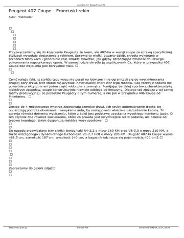 AutoRok.PL / DesignForum.PL Peugeot 407 Coupe - Francuski rekin Autor: Webmaster Przyzwyczailiśmy się do kojarzenia Peugeota ze lwem, ale 407-ka w wersji coupe za sprawą specyficznej stylizacji wywołuje skojarzenia z rekinem. Sprawia to wielki, otwarty dziób, skrzela wykonane w przednich błotnikach i generalnie cała smukła sylwetka, jak gdyby zdradzająca zdolność do łatwego pokonywania napotykanego oporu. W samochodzie określa ją współczynnik Cx, który w przypadku 407 Coupe bez wątpienia jest korzystnie niski. Cenić należy fakt, iż styliści tego wozu nie poszli na łatwiznę i nie ograniczyli się do wyeliminowania drugiej pary drzwi, lecz starali się uzyskać indywidualny charakter tego modelu. Siłą rzeczy z sedana nie pozostała praktycznie ani jedna część widoczna z zewnątrz. Pomijając bardziej sportową charakterystykę niektórych zespołów, coupe konstrukcyjnie niewiele odbiega od limuzyny. Dlatego też zjeżdża z tej samej taśmy produkcyjnej, co pozostałe Peugeoty o tym numerze, a nie jak w przypadku 406 Coupe od Pininfariny. Dostęp do 4-miejscowego wnętrza zapewniają szerokie drzwi. Ich szyby automatycznie trochę się opuszczają podczas otwierania i zamykania auta, by następowało właściwe uszczelnienie kabiny. To sprzyja również dobremu wyciszeniu, które z kolei jest podstawą uzyskania wysokiego komfortu jazdy. O ten czynnik dba również zawieszenie, które co prawda jest sztywniejsze niż w sedanie, ale dalekie od typowo twardego, jakim dysponują niektóre wozy sportowe. Do napędu przewidziano trzy silniki: benzyniaki R4-2,2 o mocy 160 KM oraz V6-3,0 o mocy 210 KM, a także oszczędnego i dynamicznego turbodiesla V6-2,7 HDI o mocy 205 KM. Długość 407-ki Coupe wynosi 481,5 cm, szerokość 187 cm, wysokość 140 cm, a bagażnik odznacza się pojemnością 400 dm3. Zapraszamy do galerii zdjęć http://mas.auto.pl Kreator PDF Utworzono 2 March, 2017, 00:08