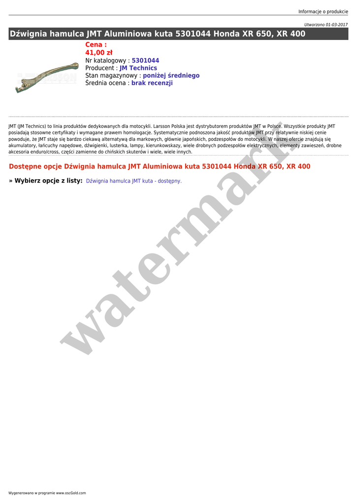 Informacje o produkcie Utworzono 01-03-2017 Dźwignia hamulca JMT Aluminiowa kuta 5301044 Honda XR 650, XR 400 Cena : 41,00 zł Nr katalogowy : 5301044 Producent : JM Technics Stan magazynowy : poniżej średniego Średnia ocena : brak recenzji er m ar k JMT (JM Technics) to linia produktów dedykowanych dla motocykli. Larsson Polska jest dystrybutorem produktów JMT w Polsce. Wszystkie produkty JMT posiadają stosowne certyfikaty i wymagane prawem homologacje. Systematycznie podnoszona jakość produktów JMT przy relatywnie niskiej cenie powoduje, że JMT staje się bardzo ciekawą alternatywą dla markowych, głównie japońskich, podzespołów do motocykli. W naszej ofercie znajdują się akumulatory, łańcuchy napędowe, dźwigienki, lusterka, lampy, kierunkowskazy, wiele drobnych podzespołów elektrycznych, elementy zawieszeń, drobne akcesoria enduro/cross, części zamienne do chińskich skuterów i wiele, wiele innych. Dostępne opcje Dźwignia hamulca JMT Aluminiowa kuta 5301044 Honda XR 650, XR 400 w at » Wybierz opcje z listy: Dźwignia hamulca JMT kuta - dostępny. Wygenerowano w programie www.oscGold.com