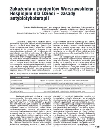 Zakażenia u pacjentów objętych opieką paliatywną występują częściej niż w pozostałych grupach chorych. Przyczyną tego zjawiska jest choroba podstawowa, której postępu nie udało się zahamować, jak też czynności zmierzające do złagodzenia objawów choroby jak np. ułatwiających oddychanie, czy też umożliwiających odprowadzenie zalegającego moczu z pęcherza. W fazie terminalnej choroby często obserwuje się gorączkę, która może być spowodowana zakażeniem lub samym procesem chorobowym. Ocenia się, że ponad 1/3 chorych rozwija zakażenie, które może być rozpoznawane na podstawie objawów klinicznych oraz wyników testów laboratoryjnych, zwłaszcza mikrobiologicznych. W tabeli 1 zamieszczono najczęstsze objawy kliniczne sugerujące zakażenie. na powierzchni cewnika wytwarzają tzw. biofilm, który szczelnie pokrywa pozostałą powierzchnię cewnika. W miejscu biofilmu bakterie rozmnażają się bardzo powoli, ich procesy metaboliczne są spowolnione, stąd też całkowicie zmienia się ich wrażliwość na antybiotyki. W tak grubej warstwie są też niedostępne dla antybiotyków i chemioterapeutyków. Do najczęstszych zakażeń raportowanych wśród pacjentów objętych opieką hospicjum należą zakażenia dróg moczowych, zakażenia gałki ocznej, zakażenia dróg oddechowych, jamy ustnej i gardła, bakteriemia/sepsa oraz zakażenia skóry i tkanki podskórnej. Zakażenia układu moczowego mają związek z przewlekłym cewnikowaniem pęcherza moczowego. Często u tych pacjentów Wydanie XIV, Warszawa 2006 Instytut „Pomnik – Centrum Zdrowia Dziecka”, Warszawa Katedra i Klinika Chorób Wewnętrznych, Pneumonologii i Alergologii, AM w Warszawie paliatywna nad dziećmi. Danuta Dzierżanowska, Katarzyna Semczuk, Barbara Garczewska, Alicja Pawińska, Wanda Kamińska, Adam Fangrat Opieka Zakażenia u pacjentów Warszawskiego Hospicjum dla Dzieci – zasady antybiotykoterapii Tab. 1. Objawy kliniczne w zależności od miejsca lokalizacji zakażenia Miejsce zakażenia drogi moczowe drogi oddechowe jama ustna/gardło skóra i tkanka podskórna krew/bakteriemia Objawy objawy dyzuryczne, częstomocz, gorączka, ból w okolicy lędźwiowej kaszel, duszność, gorączka, wydzielina często ropna gorączka, nacieki lub owrzodzenie na śluzówkach, ból, zaburzenia połykania gorączka, ból, wysypka skórna, przebarwienia gorączka, zaburzenia świadomości, spadek ciśnienia krwi Doświadczenie oraz publikacje dotyczące rozpoznawania i leczenia zakażeń u pacjentów w terminalnej fazie choroby są niewielkie. Do głównych czynników ryzyka zakażeń u pacjentów terminalnie chorych zaliczane są: zwiotczenie mięśni, upośledzone odżywianie i wyniszczenie związane z chorobą podstawową, częste unieruchomienie pacjenta i związane z tym upośledzenie naturalnych odruchów obronnych, jak np. kaszel, wprowadzenie ciał obcych, np. cewnika pęcherzowego, intubacji dotchawiczej, czy też cewnika naczyniowego. Wprowadzenie ciała obcego celem sprawniejszej opieki nad pacjentem, obarczone jest wysokim ryzykiem zakażeń. Tworzywa sztuczne, z których zrobione są cewniki łatwo ulegają kolonizacji bakteryjnej. Bakterie po kilku dniach dochodzi do kolonizacji bakteryjnej cewnika. Kolonizacja bez objawów klinicznych nie upoważnia do stosowania leków przeciwbakteryjnych, które w takich przypadkach są mało skuteczne, a dodatkowo powodują selekcję szczepów lekoopornych lub prowadzą do nadkażeń grzybiczych. Wśród patogenów dróg moczowych najczęściej wymienia się pałeczki Escherichia coli, w dalszej kolejności inne Gram(-) jak Klebsiella sp. i Pseudomonas aeruginosa oraz Enterococcus faecalis. Zakażenie manifestujące się klinicznie gorączką, objawami dyzurycznymi i obecnością w moczu leukocytów wymaga podania antybiotyków oraz dokładnej toalety narządów moczowo-płciowych z wymianą cewnika. Opóźnienie podania leku przeciwbakteryjnego może prowadzić do ciężkiej sepsy i śmier- 199 Opieka paliatywna nad dziećmi. Wydanie XIV, Warszawa 2006 ci pacjenta. Odnotowano także, że skuteczność terapeutyczna stosowanych leków jest najwyższa w tej postaci klinicznej zakażeń. Drobnoustroje powodujące zakażenia u pacjentów objętych opieką hospicjum, a przebywających w domu są najczęściej wrażliwe na antybiotyki. Wybór chemioterapeutyku do leczenia jest w takiej sytuacji prosty, najczęściej używane są w leczeniu trimetoprim z sulfametaksazolem, preparaty nitrofurantoiny, chinolony lub antybiotyki beta-laktamowe jak amoksycylina/ampicylina, czy też cefalosporyna I generacji – cefaleksyna. Szczep lekooporny pojawia się zwykle u pacjentów, którzy wcześniej byli leczeni antybiotykiem lub w niedalekiej przeszłości byli hospitalizowani. Całkowicie odmiennie kształtuje się wrażliwość drobnoustrojów powodujących zakażenia u pacjentów w terminalnej fazie choroby, hospitalizowanych w szpitalach specjalistycznych lub będących pod opieką hospicjum stacjonarnego lub przebywających w domach opieki. Drugą grupę pod względem częstości występowania stanowią zakażenia dróg oddechowych manifestujące się zapaleniem płuc. Pacjenci ze sztuczną drogą oddechową (tracheostomia) objęci opieką paliatywną są bardzo często skolonizowani różnorodną florą bakteryjną, najczęściej środowiskową z dominującą rolą Pseudomonas aeruginosa i Acinetobacter baumanii. Z badań klinicznych nad etiologią zapaleń płuc u pacjentów w terminalnej fazie choroby wynika, że zakażenia wywołują pałeczki hemofilne, Staphylococcus aureus oraz Pseudomonas aeruginosa. Wymienione drobnoustroje są najczęściej wrażliwe na trimetoprim/sulfametoksazol oraz cyprofloksacynę. Wśród gronkowców prawie nie spotyka się szczepów opornych na metycylinę. Występowanie takich szczepów wiąże się najczęściej z poprzedzającą hospitalizacją i zakażeniem szpitalnym. Warto dodać, że gronkowiec złocisty jes