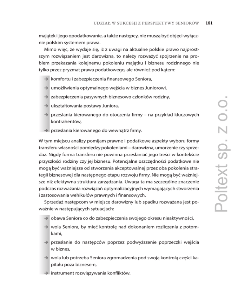 UDZIAŁ W SUKCESJI Z PERSPEKTYWY SENIORÓW 181 majątek i jego opodatkowanie, a także następcy, nie muszą być objęci wyłącznie polskim systemem prawa. Mimo więc, że wydaje się, iż z uwagi na aktualne polskie prawo najprostszym rozwiązaniem jest darowizna, to należy rozważyć spojrzenie na problem przekazania kolejnemu pokoleniu majątku i biznesu rodzinnego nie tylko przez pryzmat prawa podatkowego, ale również pod kątem: komfortu i zabezpieczenia finansowego Seniora, zabezpieczenia pasywnych biznesowo członków rodziny, ukształtowania postawy Juniora, przesłania kierowanego do otoczenia firmy – na przykład kluczowych kontrahentów, przesłania kierowanego do wewnątrz firmy. W tym miejscu analizy pomijam prawne i podatkowe aspekty wyboru formy transferu własności pomiędzy pokoleniami – darowizna, umorzenie czy sprzedaż. Nigdy forma transferu nie powinna przesłaniać jego treści w kontekście przyszłości rodziny czy jej biznesu. Potencjalne oszczędności podatkowe nie mogą być ważniejsze od stworzenia akceptowalnej przez oba pokolenia strategii biznesowej dla następnego etapu rozwoju firmy. Nie mogą być ważniejsze niż efektywna struktura zarządzania. Uwaga ta ma szczególne znaczenie podczas rozważania rozwiązań optymalizacyjnych wymagających stworzenia i zastosowania wehikułów prawnych i finansowych. Sprzedaż następcom w miejsce darowizny lub spadku rozważana jest poważnie w następujących sytuacjach: obawa Seniora co do zabezpieczenia swojego okresu nieaktywności, wola Seniora, by mieć kontrolę nad dokonaniem rozliczenia z potom- kami, przesłanie do następców poprzez podwyższenie poprzeczki wejścia w biznes, wola lub potrzeba Seniora zgromadzenia pod swoją kontrolą części ka- pitału poza biznesem, instrument rozwiązywania konfliktów. Poltext sp. z o.o. umożliwienia optymalnego wejścia w biznes Juniorowi,