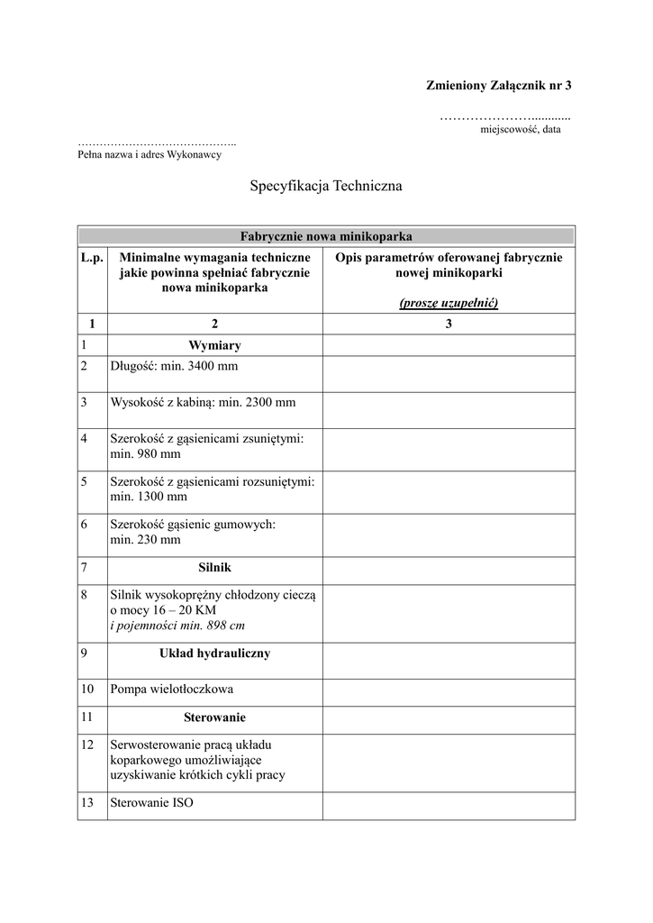 Zmieniony Załącznik nr 3 …………………............ miejscowość, data …………………………………….. Pełna nazwa i adres Wykonawcy Specyfikacja Techniczna Fabrycznie nowa minikoparka L.p. Minimalne wymagania techniczne jakie powinna spełniać fabrycznie nowa minikoparka Opis parametrów oferowanej fabrycznie nowej minikoparki (proszę uzupełnić) 1 2 1 Wymiary 2 Długość: min. 3400 mm 3 Wysokość z kabiną: min. 2300 mm 4 Szerokość z gąsienicami zsuniętymi: min. 980 mm 5 Szerokość z gąsienicami rozsuniętymi: min. 1300 mm 6 Szerokość gąsienic gumowych: min. 230 mm 7 Silnik 8 Silnik wysokoprężny chłodzony cieczą o mocy 16 – 20 KM i pojemności min. 898 cm 9 Układ hydrauliczny 10 11 Pompa wielotłoczkowa Sterowanie 12 Serwosterowanie pracą układu koparkowego umożliwiające uzyskiwanie krótkich cykli pracy 13 Sterowanie ISO 3 14 Parametry robocze 15 Masa robocza: min. 1550 kg 16 Zasięg kopania na poziomie gruntu: min. 3895 mm 17 Głębokość kopania z opuszczonym lemieszem: min. 2,74 m 18 Głębokość kopania z podniesionym lemieszem: min. 2,40 m 19 Maksymalna wysokość załadunku: 2,560 m 20 Siła kopiąca łyżki: min. 15,9 kM 21 Siła kopiąca ramienia: min. 7,8 kM 22 Wyposażenie standardowe maszyny 23 Kabina posiadająca certyfikaty ROPS i TOPS: wymagane 24 Instalacja hydrauliczna do młota wyburzeniowego i wiertnicy: wymagane 25 Ramie koparkowe o długości min. 1190 mm 26 Pełen system kontrolek świetlnych oraz ostrzegania dźwiękowego: wymagane 27 Blokada układu sterowania i obrotu: wymagane 28 Mocowania umożliwiające podnoszenie maszyny: wymagane 29 Gąsienice gumowe i rozsuwane: wymagane 30 Łyżka koparkowa o szerokości 230 - 300 mm 31 Układ sterowania maszyny ISO: wymagane 32 Światło robocze montowane na wysięgniku: wymagane 33 Lemiesz spycharkowy: wymagane 34 Wyposażenie dodatkowe 35 Szybkozłącze mechaniczne 36 Łyżka o wymiarach 460 mm 37 Łyżka skarpowa 900 mm UWAGA: Zamawiający wymaga, aby Wykonawca w kolumnie 3 wskazał rzeczywiste dane techniczne, jakie posiada oferowana minikoparka. …................................................. Podpis wykonawcy lub upoważnionego przedstawiciela wykonawcy