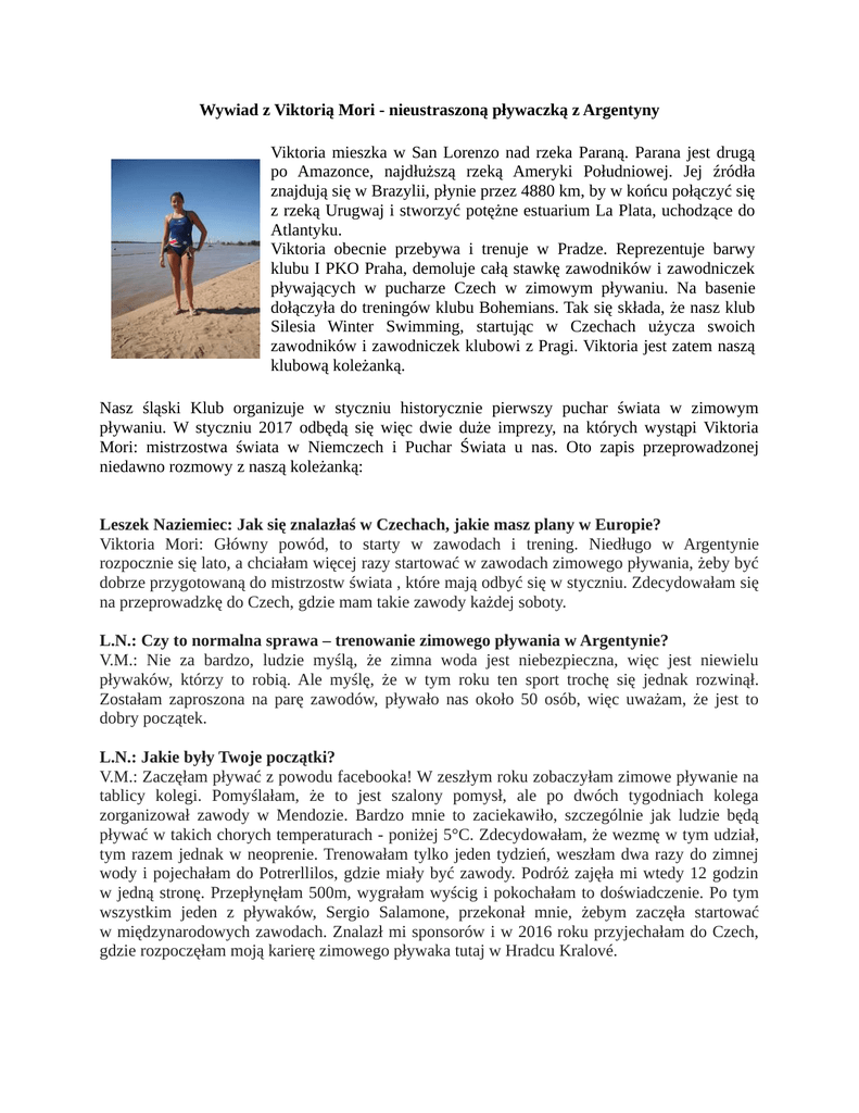 Wywiad z Viktorią Mori - nieustraszoną pływaczką z Argentyny Viktoria mieszka w San Lorenzo nad rzeka Paraną. Parana jest drugą po Amazonce, najdłuższą rzeką Ameryki Południowej. Jej źródła znajdują się w Brazylii, płynie przez 4880 km, by w końcu połączyć się z rzeką Urugwaj i stworzyć potężne estuarium La Plata, uchodzące do Atlantyku. Viktoria obecnie przebywa i trenuje w Pradze. Reprezentuje barwy klubu I PKO Praha, demoluje całą stawkę zawodników i zawodniczek pływających w pucharze Czech w zimowym pływaniu. Na basenie dołączyła do treningów klubu Bohemians. Tak się składa, że nasz klub Silesia Winter Swimming, startując w Czechach użycza swoich zawodników i zawodniczek klubowi z Pragi. Viktoria jest zatem naszą klubową koleżanką. Nasz śląski Klub organizuje w styczniu historycznie pierwszy puchar świata w zimowym pływaniu. W styczniu 2017 odbędą się więc dwie duże imprezy, na których wystąpi Viktoria Mori: mistrzostwa świata w Niemczech i Puchar Świata u nas. Oto zapis przeprowadzonej niedawno rozmowy z naszą koleżanką: Leszek Naziemiec: Jak się znalazłaś w Czechach, jakie masz plany w Europie? Viktoria Mori: Główny powód, to starty w zawodach i trening. Niedługo w Argentynie rozpocznie się lato, a chciałam więcej razy startować w zawodach zimowego pływania, żeby być dobrze przygotowaną do mistrzostw świata , które mają odbyć się w styczniu. Zdecydowałam się na przeprowadzkę do Czech, gdzie mam takie zawody każdej soboty. L.N.: Czy to normalna sprawa – trenowanie zimowego pływania w Argentynie? V.M.: Nie za bardzo, ludzie myślą, że zimna woda jest niebezpieczna, więc jest niewielu pływaków, którzy to robią. Ale myślę, że w tym roku ten sport trochę się jednak rozwinął. Zostałam zaproszona na parę zawodów, pływało nas około 50 osób, więc uważam, że jest to dobry początek. L.N.: Jakie były Twoje początki? V.M.: Zaczęłam pływać z powodu facebooka! W zeszłym roku zobaczyłam zimowe pływanie na tablicy kolegi. Pomyślałam, że to jest szalony pomysł, ale po dwóch tygodniach kolega zorganizował zawody w Mendozie. Bardzo mnie to zaciekawiło, szczególnie jak ludzie będą pływać w takich chorych temperaturach - poniżej 5°C. Zdecydowałam, że wezmę w tym udział, tym razem jednak w neoprenie. Trenowałam tylko jeden tydzień, weszłam dwa razy do zimnej wody i pojechałam do Potrerllilos, gdzie miały być zawody. Podróż zajęła mi wtedy 12 godzin w jedną stronę. Przepłynęłam 500m, wygrałam wyścig i pokochałam to doświadczenie. Po tym wszystkim jeden z pływaków, Sergio Salamone, przekonał mnie, żebym zaczęła startować w międzynarodowych zawodach. Znalazł mi sponsorów i w 2016 roku przyjechałam do Czech, gdzie rozpoczęłam moją karierę zimowego pływaka tutaj w Hradcu Kralové. L.N.: Czy można w ogóle trenować zimowe pływanie w Argentynie? V.M.: Tak, ale nie w każdym miejscu. Najlepsze miejsca znajdują się na południu kraju, należą do nich Santa Cruz, Chubút, Rio Negro. W miejscach, w których są najniższe temperatury w roku, w porównaniu z innymi prowincjami Argentyny. L.N.: Czy pływanie na wodach otwartych jest popularne w Twoim kraju? V.M.: Myślę, że tak. Mnóstwo ludzi trenuje tutaj na wodach otwartych. Część, żeby startować w zawodach, część hobbystycznie, dla zdrowia. Może jest tak dlatego, że mamy wiele długich i wielkich rzek i jezior. Poza tym jest gorąco przez większą część roku, co stwarza idealne warunki do treningu. L.N.: Jakie są Twoje największe pływackie osiągnięcia? V.M.: W zimowym pływaniu muszę wymienić dwa I-wsze miejsca, które zdobyłam na mistrzostwach świata w Tiumenie w Rosji (450m i 200m stylem dowolnym) w tym roku. (Nasza organizacja IISA uznaje tytuły mistrza świata tylko na dystansie 1km - przyp. L.N.). Było to dla mnie zaskoczeniem, ponieważ pływałam pierwszy raz w wodzie o tepmeraturze 0°C. Na długim dystansie w wodach otwartych zdobyłam V miejsce na 32 km w wyścigu Grand Prix FINA w Lac St. Jean w kanadyjskim Quebecu w zeszłym roku. Dopisałam to do listy dużych osiągnięć, ponieważ pogoda przez całe 9 godzin wyścigu była naprawdę bardzo zła, a fale miały wysokość od 1,5 do 2m. Po wszystkich wyścigach Grand Prix (między innymi 30 km w jeziorze Ohrid, 36 km Capri – Neapol) zostałam sklasyfikowana w maratońskim rankingu FINA Grand Prix na 8 miejscu. W tym roku udało mi się ten wynik poprawić i jestem teraz piąta w tym rankingu na świecie. L.N.: Opowiedz, proszę, trochę o Twoim normalnym treningu. Ile pływasz na basenie? Ile na wodach otwartych? V.M.: W Argentynie 99% treningu odbywa się na basenie, 5 godzin dziennie (2,5 godz. jedna sesja), od poniedziałku do piątku i jedna sesja w sobotę rano, jeśli nie mam zawodów. Treningi na wodach otwartych mogą być w sobotę i niedzielę, jeżeli pogoda jest dobra i jeśli zbliżają się zawody na wodach otwartych. L.N.: Trenujesz na lądzie? Jeśli tak, co robisz? Jakie techniczne ćwiczenia robisz w wodzie? Daj jakiś przykład. V.M.: Niedawno miałam kontuzję barku i teraz staram się przy ćwiczeniach skupiać na obszarach z którymi miałam problem. Ćwiczę z ciężarkiem – robię ruch kraulowy, taki jak w fazie wypoczynku ramienia, skupiam się wtedy nad dobrą techniką. Potem robię to samo, ale koncentruję się na fazie odepchnięcia. Następnie ćwiczę z gumami i jeszcze ćwiczę stabilizację tułowia, używając piłki do fitnessu. Wykonuję ćwiczenia techniki w wodzie – to na prawdę ważne przy wyścigach na długim dystansie. Błąd, który powtarzasz przez bardzo długi czas może spowodować poważną kontuzję, z reguły chodzi o bark. Normalnie, jak jestem w domu robię 5 x 200m z płetwami, rurką lub wiosełkami; 50m czucia wody, 50m jedną ręką, skupiając się na fazie wkładania ręki do wody, czuciu chwytu wody, na pociągnięciu, potem 50