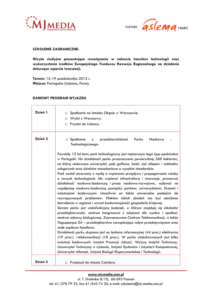 PARTNER SZKOLENIE ZAGRANICZNE: Wizyta studyjna prezentująca rozwiązania w zakresie transferu technologii oraz wykorzystania środków Europejskiego Funduszu Rozwoju Regionalnego na działania dotyczące wparcia innowacji. Termin: 15-19 października 2012 r. Miejsce: Portugalia (Lizbona, Porto). RAMOWY PROGRAM WYJAZDU Dzień 1 □ Spotkanie na lotnisku Okęcie w Warszawie. □ Wylot z Warszawy. □ Przylot do Lizbony. Dzień 2 □ Spotkanie z przedstawicielami Technologicznego. Parku Naukowo - Powstały 13 lat temu park technologiczny jest najstarszym tego typu podmiotem w Portugalii. Na działalność parku przeznaczono powierzchnię 360 hektarów, na której ulokowano uniwersytet, pole golfowe, hotel, sieć sklepów i zakładów usługowych oraz dzielnice mieszkaniowe o wysokim standardzie. Park został utworzony z myślą o wspieraniu przepływu i propagowania wiedzy o nowych technologiach. Ma wspierać infrastrukturę i innowacje, promować działalność naukowo-badawczą i prace naukowo-rozwojowe, wpływać na współpracę naukowo-badawczą pomiędzy parkiem, uniwersytetami, firmami i instytucjami badawczymi. Umożliwia on także uniwersalne podejście do rozwiązywanych problemów. Efektem takich działań ma być obniżenie bezrobocia w regionie i wzrost konkurencyjności gospodarki krajowej. Sercem parku jest wielofunkcyjny budynek, w którym znajdują się inkubator przedsiębiorczości, centrum kongresowe z miejscem dla wystaw i spotkań, centrum odnowy biologicznej, Zaawansowane Centrum Telekomunikacji, a także Tagusparque SA – przedsiębiorstwo zarządzające całym przedsięwzięciem oraz małe zaplecze handlowe. Działalność parku skupiona jest na technice informacyjnej (44 proc.) elektronice (19 proc.) i telekomunikacji (18 proc.). W parku zlokalizowanych jest kilka instytucji badawczych: Instytut Promocji Jakości, Wyższy Instytut Techniczny, Uniwersytet Techniczny w Lizbonie, Instytut Systemów i Inżynierii Komputerowej, Uniwersytet Atlantyk, Instytut Biologii Eksperymentalnej i Technologii. Dzień 3 □ Przejazd do miasta Coimbra. www.mj-media.com.pl ul. T. Drobnika 8/10, 60-693 Poznań tel. 61/278 79 33, fax 61/642 74 20, e-mail: [email protected] PARTNER □ Spotkanie z przedstawicielami Parku Innowacji. Park obejmuje milion metrów kwadratowych przeznaczonych na innowacje. iParque działa w następujących obszarach: ochrona zdrowia i nauki przyrodnicze, telekomunikacja, nauka, informacja, multimedia i robotyka. Projekt obejmuje także tereny zielone, tereny mieszkalne, centra handlowe i usługi opieki zdrowotnej. □ Przejazd do Porto. Dzień 4 □ Spotkanie z przedstawicielami Programem Operacyjnym "Norte”. Instytucji Zarządzającej Program „Norte” to jeden z regionalnych programów operacyjnych współfinansowanych z EFRR. Niektóre z działań realizowanych w ramach programu Norte to: wsparcie struktur badawczych i badań naukowych (nie ważne jest tworzenie nowych instytucji, tylko wykorzystanie już istniejących struktur); wsparcie organizacji pośredniczących między innymi inkubatorów przedsiębiorczości; wsparcie gospodarki i społeczeństwa cyfrowego; aktualnie trwa projekt rozszerzenia na wszystkie powiaty regionu Internetu szerokopasmowego oraz promocja technologii informatycznych w szkołach podstawowych i średnich; wydajność energetyczna, produkcja energii przez kolektory słoneczne; w budynkach użyteczności publicznej takie rozwiązania są już praktycznie obligatoryjne. Dzień 5 □ □ Wylot z Porto. Przylot do Warszawy. KOSZTY UDZIAŁU W SZKOLENIU Cena: 7 320,00 zł netto od osoby Cena została skalkulowana dla grupy minimum 10 osobowej. W przypadku zmieszenia liczby uczestników, cena może ulec zmianie. Kwota brutto będzie zależna od podmiotu zamawiającego szkolenie: dla podmiotów nie będących podatnikami VAT stawka podatku VAT zostanie określona jako: nie podlega, dla podmiotów będących podatnikami VAT stawka wyniesie 23%. www.mj-media.com.pl ul. T. Drobnika 8/10, 60-693 Poznań tel. 61/278 79 33, fax 61/642 74 20, e-mail: [email protected] PARTNER Cena obejmuje: □ □ □ □ □ □ □ □ □ □ □ Przelot na trasie Warszawa – Lizbona, Porto - Warszawa Wszystkie transfery komfortowym busem zgodnie z programem Opieka pilota / przewodnika Opieka merytoryczna (wprowadzenie do tematyki spotkań, szkolenie z zakresu systemu wdrażania funduszy UE w Portugalii, moderowanie spotkań) Organizacja 3 spotkań merytorycznych Tłumaczenie spotkań przez profesjonalnego tłumacza Zakwaterowanie w Lizbonie w hotelu*** Zakwaterowanie w Porto w hotelu*** Pokoje dwuosobowe; dopłata do pokoju jednoosobowego – 640 PLN Śniadania w hotelu, lunche i kolacje – zgodnie z programem Koszty ubezpieczenia podróżnego KL, NW oraz bagażu www.mj-media.com.pl ul. T. Drobnika 8/10, 60-693 Poznań tel. 61/278 79 33, fax 61/642 74 20, e-mail: [email protected]