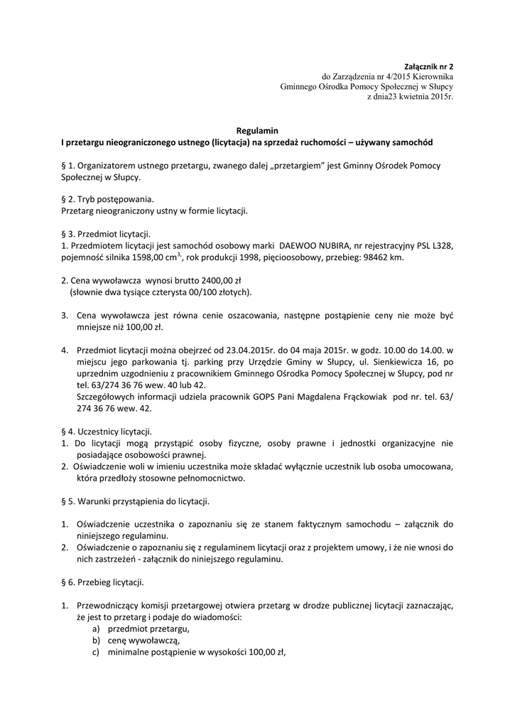 Załącznik nr 2 do Zarządzenia nr 4/2015 Kierownika Gminnego Ośrodka Pomocy Społecznej w Słupcy z dnia23 kwietnia 2015r. Regulamin I przetargu nieograniczonego ustnego (licytacja) na sprzedaż ruchomości – używany samochód § 1. Organizatorem ustnego przetargu, zwanego dalej „przetargiem” jest Gminny Ośrodek Pomocy Społecznej w Słupcy. § 2. Tryb postępowania. Przetarg nieograniczony ustny w formie licytacji. § 3. Przedmiot licytacji. 1. Przedmiotem licytacji jest samochód osobowy marki DAEWOO NUBIRA, nr rejestracyjny PSL L328, pojemność silnika 1598,00 cm3,, rok produkcji 1998, pięcioosobowy, przebieg: 98462 km. 2. Cena wywoławcza wynosi brutto 2400,00 zł (słownie dwa tysiące czterysta 00/100 złotych). 3. Cena wywoławcza jest równa cenie oszacowania, następne postąpienie ceny nie może być mniejsze niż 100,00 zł. 4. Przedmiot licytacji można obejrzeć od 23.04.2015r. do 04 maja 2015r. w godz. 10.00 do 14.00. w miejscu jego parkowania tj. parking przy Urzędzie Gminy w Słupcy, ul. Sienkiewicza 16, po uprzednim uzgodnieniu z pracownikiem Gminnego Ośrodka Pomocy Społecznej w Słupcy, pod nr tel. 63/274 36 76 wew. 40 lub 42. Szczegółowych informacji udziela pracownik GOPS Pani Magdalena Frąckowiak pod nr. tel. 63/ 274 36 76 wew. 42. § 4. Uczestnicy licytacji. 1. Do licytacji mogą przystąpić osoby fizyczne, osoby prawne i jednostki organizacyjne nie posiadające osobowości prawnej. 2. Oświadczenie woli w imieniu uczestnika może składać wyłącznie uczestnik lub osoba umocowana, która przedłoży stosowne pełnomocnictwo. § 5. Warunki przystąpienia do licytacji. 1. Oświadczenie uczestnika o zapoznaniu się ze stanem faktycznym samochodu – załącznik do niniejszego regulaminu. 2. Oświadczenie o zapoznaniu się z regulaminem licytacji oraz z projektem umowy, i że nie wnosi do nich zastrzeżeń - załącznik do niniejszego regulaminu. § 6. Przebieg licytacji. 1. Przewodniczący komisji przetargowej otwiera przetarg w drodze publicznej licytacji zaznaczając, że jest to przetarg i podaje do wiadomości: a) przedmiot przetargu, b) cenę wywoławczą, c) minimalne postąpienie w wysokości 100,00 zł, d) termin uiszczenia ceny nabycia, e) zmiany w stanie faktycznym i prawnym przedmiotu przetargu, które zaszły po ogłoszeniu przetargu, f) odczytuje listę osób uprawnionych do uczestnictwa w przetargu, g) sporządza listę obecności komisji przetargowej oraz uczestników przetargu - dane osobowe lub dane firmy, adres oraz numery kontaktowe telefonów. 2. Przetarg prowadzony będzie w formie licytacji odbywającej się „w górę” poprzez postąpienie. Przetarg jest ważny, jeżeli nastąpi jedno postąpienie. 3. Każdy uczestnik przed przystąpieniem do licytacji winien złożyć oświadczenia, o którym mowa w § 5 ust. 1 i 2. 4. Licytacja rozpoczyna się od wywołania ceny samochodu przeznaczonego do sprzedaży. 5. Oferenci poprzez podniesienie ręki zgłaszają przewodniczącemu komisji kolejno oferowaną wyższą cenę nabycia. Zaoferowana cena przestaje obowiązywać oferenta, gdy inny oferent podczas licytacji przed ustaniem postąpień zaoferował cenę wyższą. 6. Po ustaniu postąpień, przewodniczący komisji po trzykrotnym wywołaniu najwyższej oferowanej kwoty przybija cenę i zamyka licytację . § 7. Informacje ogólne/dodatkowe. 1. Stawienie się jednego oferenta spełniającego podstawowe warunki przystąpienia do licytacji pozwala na przeprowadzenie licytacji pod warunkiem, że zaproponuje on kwotę wyższą niż cena wywoławcza. 2. Nabywca jest obowiązany zapłacić cenę nabycia niezwłocznie po wygraniu przetargu, lecz w terminie nie dłuższym niż 3 dni roboczych od przeprowadzenia przetargu. Wpłaty należy dokonać na konto Gminnego Ośrodka Pomocy Społecznej w Słupcy w Banku Spółdzielczym w Słupcy nr rachunku 33 8542 0001 0039 2245 2000 0010. 3. Z oferentem, który wylicytuje najwyższą cenę zostanie podpisana umowa kupna/sprzedaży. 4. Wyniki z przeprowadzonej licytacji zostaną zamieszczone na stronie internetowej i tablicy ogłoszeń w siedzibie GOPS w Słupcy. 5. Odbiór przedmiotu licytacji nastąpi niezwłocznie po zaksięgowaniu wpłaty (ceny nabycia) na koncie GOPS w Słupcy i podpisaniu umowy sprzedaży. 6. Przekazanie przedmiotu licytacji nastąpi protokołem zdawczo/odbiorczym podpisanym przez obie strony. § 8. Komisja przetargowa sporządza z jego przebiegu protokół, który powinien zawierać: a) określenie miejsca i czasu oraz rodzaju przetargu. b) imiona i nazwiska osób prowadzących przetarg, c) wysokość ceny wywoławczej, najwyższą cenę oferowaną za przedmiot przetargu, d) imię, nazwisko i miejsce zamieszkania nabywcy lub jego siedzibę, e) wysokość ceny nabycia i oznaczenie kwoty, jaką nabywca uiścił na poczet przetargu, f) wnioski i oświadczenia osób obecnych w czasie prowadzonego przetargu, g) wzmiankę o odczytaniu protokołu. Protokół z przeprowadzonego przetargu podpisują przewodniczący i członkowie komisji przetargowej, h) listy obecności stanowią integralną część protokołu. § 9. W przetargu ustnym (licytacji) nie mogą uczestniczyć osoby wchodzące w skład komisji przetargowej oraz ich małżonkowie, dzieci, rodzice i rodzeństwo. § 10. Organizator przetargu może go unieważnić lub odwołać bez podania przyczyny. Załącznik nr1 do Regulaminu I przetargu nieograniczonego ustnego (licytacja) na sprzedaż ruchomości- używany samochód OŚWIADCZENIE o zapoznaniu się ze stanem faktycznym samochodu Ja, niżej podpisany …………………………………………………………………………………………………….............. oświadczam, że zapoznałem się ze stanem faktycznym samochodu marki DAEWOO NUBIRA, nr rejestracyjny PSL L328, będącego przedmiotem przetargu. ………………………………………………….. /miejscowość, data/ …………………………………………….. /podpis/ Załą