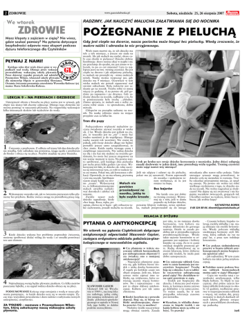 2 ZDROWIE www.gazetalubuska.pl Sobota, niedziela 25, 26 sierpnia 2007 RADZIMY, JAK NAUCZYĆ MALUCHA ZAŁATWIANIA SIĘ DO NOCNIKA POŻEGNANIE Z PIELUCHĄ Gdy jest ciepło na dworze, nasza pociecha może biegać bez pieluchy. Wtedy zrozumie, że mokre nóżki i ubranka to nic przyjemnego. PŁYWAJ Z NAMI! Każdego roku zbyt wiele dzieci ginie w wypadkach nad wodą. Dlatego przez wakacje prowadzilismy wakacyjną szkołę pływania. Przez dziewięć tygodni prostych rad udzielał Przemysław Wilant, właściciel szkoły pływania dla niemowląt Hipcio w gorzowskiej Słowiance. Ostatnie ćwiczenia prezentuje czteroletnia Weronika Kulesza i jej mama: Beata Sokołowska-Kulesza. LEKCJA 9 - NA PIERSIACH I GRZBIECIE Umiejętność obrotu z brzucha na plecy ważna jest w sytuacji, gdy złapie nas skurcz lub chcemy odpocząć. Dlatego tego elementu nie można pominąć w nauczaniu pływania. Na rozgrzewkę wykonajcie kilka śmiesznych skoków lub wydechów do wody. Wiele mam martwi się, że ich dziecko ma tyle a tyle miesięcy, a jeszcze nie siada na nocnik. Ale jak maluch ma siadać, skoro cały czas chodzi w pieluszce? Dziecko dobrze kombinuje: skoro można sikać w majtki i nic nie przelatuje do spodni, nie jest zimno w tyłeczek, to po co coś zmieniać? Lato to najlepsza pora na tzw. trening czystości. Bo jest ciepło na dworze i jak zdejmiemy pieluchę, to maluch nie przeziębi się - mimo mokrych nóżek. Naukę można rozpocząć już, gdy dziecko ma 9 miesięcy. Oczywiście w tym wieku maluch nie potrafi zapanować nad swoimi odruchami. Rolą rodziców jest sadzanie go na nocnik. Trzeba robić to mniej więcej co godzinę. A na pewno ok. pół godziny po napojeniu i po drzemce. Gdy sadzamy dziecko na nocnik, zadbajmy o to, by w pomieszczeniu było trochę ...chłodno. Zimno sprawia, że maluch sam z siebie zaczyna robić siusiu - to sprawdzona, dobra metoda. Chłopców na początku sadzamy na nocnik. Na naukę robienia siusiu na stojąco przyjdzie czas za kilka lat. Zdjęcia K. LIGOCKI Tron dla pupy 1 Ćwiczenie z przyborem. Z odbicia od ściany lub dna dziecko płynie strzałką. Gdy zabraknie mu powietrza, ściąga rączki z przyborem do bioder i obraca się na plecy. Przybór znajduje się przy brzuszku. 2 Wykonujemy wszystko tak, jak w ćwiczeniu pierwszym tylko płyniemy bez przyboru. Rodzic zwraca uwagę na prawidłową pracę nóg. Podręcznikowo większość maluchów zaczyna świadomie używać nocnika w wieku ok. 2 lat. Wtedy dziecko jest jednak na etapie, że wszystko jest na „nie” i może być trudno namówić je do współpracy. Dlatego naukę zacznij rok wcześniej. Nie zrażaj się jednak, jeśli twoje dziecko długo nie będzie potrafiło jeszcze samo zasygnalizować, że chce siusiu. Każda nauka wymaga czasu i cierpliwego nauczyciela. Nie sadzaj dziecka na siłę i nie każ mu siedzieć na nocniku godzinami, bo może być jeszcze niegotowy na ten ważny moment w życiu. Na pewno warto spróbować, jeśli każdego dnia pieluszka Krok po kroku ucz swoje dziecko korzystania z nocniczka. Jedne dzieci załapują jest sucha przez kilka godzin i po nocy. Wy- zasady dosłownie w jeden dzień, inne potrzebują wielu tygodni. Trening czystości korzystaj też fakt, że dziecko ok. roku zaczy- może zająć nawet trzy miesiące! na się interesować tym, co robi w toalecie tata czy mama. Pokaż mu, jak korzystasz z ubi- Jeśli nie zdążysz i załatwi się do pieluchy, mieszkania albo nawet tylko pokoju. Takie kacji. Opowiedz, że on ma własną, prywatną pokaż mu jej zawartość. Potem zaprowadź stresujące sytuacje mogą powodować, że do nocnika i spokojnym to- dziecko cofa się mentalnie w rozwoju. Trzei jest nią nocnik. Spróbujcie nem wytłumacz, że tu jest ba odczekać przynajmniej miesiąc, aż opadrazem usiąść każde na swomiejsce na kupę. im „tronie’. Wykorzystaj ną emocje. Na pewno nie wolno też robić Maluch nie to, że kilkunastomiesięczny wielkiego wydarzenia z tego, że dziecko siapowinien maluch uwielbia naśladoda na nocnik. Nie wolno nagradzać je słodyBez bajerów przesiadywać na wać dorosłych i zdobyć ich czami! Nie dajmy się też zwariować i nie kunocniku, jakby to uznanie. Nie każdy czas jest dobry pujmy nocników świecących, grających itd. Zwykle nawet małe na trening czystości. Wstrzy- Chciałbyś siedzieć na toalecie, która huczy i było zwykłe krzesło dziecko sygnalizuje, kiedy maj się z nim, jeśli w domu buczy, jak zrobisz kupę? chce kupę. Kuca, stęka, popojawiło się kolejne dziecko, sapuje, chowa się w kącie - gdy zobaczysz ta- poważne kłopoty rodzinne, nowa opiekunKATARZYNA BOREK kie zachowanie, posadź malucha na nocnik. ka, maluch przeprowadził się do innego 0 68 324 88 64, [email protected] RELACJA Z DYŻURU PYTANIA O ANTYKONCEPCJĘ 3 Kiedy dziecko wykona bez problemu poprzednie ćwiczenia, możemy spróbować dodać wślizg do wody i ze strzałki powtórzyć Fot. BARTŁOMIEJ KUDOWICZ ten sam element. We wtorek na pytania Czytelniczek dotyczące antykoncepcji odpowiadał Sławomir Gąsior, zastępca ordynatora oddziału położniczo-ginekologicznego w nowosolskim szpitalu. 4 Najtrudniejszą wersją będzie pływanie pieskiem. Co kilka metrów puszczamy bąbelki, a na sygnał rodzica dziecko obraca się na plecy. PODSUMOWANIE Kończąc etap oswajania z wodą w nauce pływania pamiętajcie, że każde dziecko uczy się w swoim tempie. Życzę więc wszystkim powodzenia i dużo radości z nabywania nowych umiejętności, cierpliwości. ZA TYDZIEŃ - rozmowa z Przemysławem Wilantem, którą zakończymy naszą wakacyjna szkołę pływania. SŁAWOMIR GĄSIOR Ukończył AM we Wrocławiu w 1989 r., ma żonę lekarza radiologa, jedną córkę. Jest zastępcą ordynatora oddziału położniczo-ginekologicznego w szpitalu w Nowej Soli, jego hobby to dalekie podróże motocyklowe. r Czy plamienie w trakcie stosowanie tabletek hormonalnych jest niebezpiecznym objawem? I czy świadczy ono o mniejszej antykoncepcji
