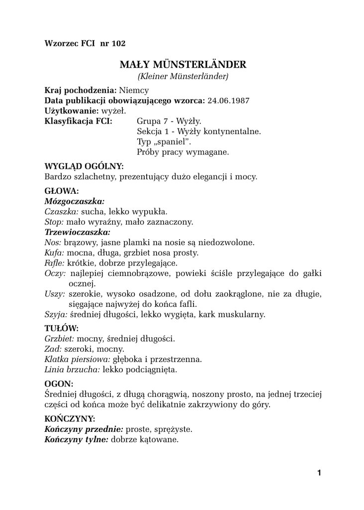 Wzorzec FCI nr 102 MAŁY MÜNSTERLÄNDER (Kleiner Münsterländer) Kraj pochodzenia: Niemcy Data publikacji obowiązującego wzorca: 24.06.1987 Użytkowanie: wyżeł. Klasyfikacja FCI: Grupa 7 - Wyżły. Sekcja 1 - Wyżły kontynentalne. Typ „spaniel”. Próby pracy wymagane. WYGLĄD OGÓLNY: Bardzo szlachetny, prezentujący dużo elegancji i mocy. GŁOWA: Mózgoczaszka: Czaszka: sucha, lekko wypukła. Stop: mało wyraźny, mało zaznaczony. Trzewioczaszka: Nos: brązowy, jasne plamki na nosie są niedozwolone. Kufa: mocna, długa, grzbiet nosa prosty. Fafle: krótkie, dobrze przylegające. Oczy: najlepiej ciemnobrązowe, powieki ściśle przylegające do gałki ocznej. Uszy: szerokie, wysoko osadzone, od dołu zaokrąglone, nie za długie, sięgające najwyżej do końca fafli. Szyja: średniej długości, lekko wygięta, kark muskularny. TUŁÓW: Grzbiet: mocny, średniej długości. Zad: szeroki, mocny. Klatka piersiowa: głęboka i przestrzenna. Linia brzucha: lekko podciągnięta. OGON: Średniej długości, z długą chorągwią, noszony prosto, na jednej trzeciej części od końca może być delikatnie zakrzywiony do góry. KOŃCZYNY: Kończyny przednie: proste, sprężyste. Kończyny tylne: dobrze kątowane. 1 OKRYWA WŁOSOWA: Skóra: dobrze przylegająca, naprężona. Sierść: skromna, gęsta, średniej długości i mało falowana, mocno przylegająca. Umaszczenie: biało-brązowe, brązowej pleśni, znaczenia na kufie i oczach dozwolone. WZROST: Wysokość w kłębie: psy: suki: 52 - 56 cm 50 - 54 cm Tolerancja: +/- 2 cm. WADY: Wszystkie odstępstwa od tego, co podano powyżej, powinny być traktowane jako wady, powodujące odpowiednie obniżenie oceny. - Entropium, ektropium, rybie oko. - Uszy z krótką sierścią i gładkie. - Beczkowata klatka piersiowa. UWAGA: Samce muszą mieć dwa, prawidłowo wykształcone jądra, całkowicie umieszczone w worku mosznowym. 2