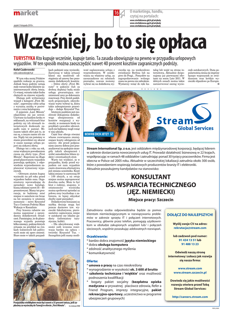 market 16 O marketingu, handlu, czytaj na portalach: www.strefabiznesu.gk24.pl/artykuly www.strefabiznesu.gp24.pl/artykuly www.strefabiznesu.gs24.pl/artykuly piątek 5 listopada 2010 r. Wcześniej, bo to się opłaca TURYSTYKA Kto kupuje wcześnie, kupuje tanio. Ta zasada obowiązuje na pewno w przypadku urlopowych wyjazdów. W ten sposób można zaoszczędzić nawet 40 procent kosztów zagranicznych podróży. Rafał Czabrowski [email protected] W tym roku mniej Polaków spędziło wakacje za granicą. Jednak biura podróży notują stały wzrost liczby klientów zainteresowanych ofertą letnią. Co więcej, wzrasta także liczba chętnych na zimowe wyjazdy. Dlatego jeśli wybierzemy wyjazd z kategorii „First Minute”, zapewnimy sobie urlop z wyraźną zniżką w porównaniu z ceną katalogową. Z pojęciem „Last Minute” zdążyliśmy się już oswoić. Używane na każdym kroku w reklamach, na witrynach biur podróży czy ich stronach internetowych doskonale zapadło nam w pamięć. Minusem takich ofert jest to, że raz są, a innym razem ich nie ma. Nigdy też nie jesteśmy w stanie przewidzieć czy akurat w czasie naszego urlopu pojawi się ciekawa oferta. Dlatego też z roku na rok, coraz większym powodzeniem cieszą się oferty typu „First Minute”. Kupowane na długo przed planowanym wyjazdem pozwalają spokojnie, z odpowiednim wyprzedzeniem zaplanować wymarzony wypoczynek. – Głównym atutem kupna wycieczki na pół roku przed wyjazdem będzie cena. Organizatorzy wprowadzając do sprzedaży nowe katalogi, kuszą rabatami nawet 35 – 40procentowymi. Mamy też gwarancję, że będziemy mieć miejsce w samolocie nie licząc na łut szczęścia w ostatnim momencie – mówi Krzysztof Tuz z Centrum Podróży Masz Wakacje w Koszalinie. Przy liczeniu rabatów nie można zapominać o sprawdzeniu dodatkowych świadczeń. Pamiętajmy, że do planowanego wyjazdu pozostaje kilka miesięcy, podczas których sytuacja na przykład na rynkach walutowych lub paliwowych może się sporo zmienić. Biuro może w takich przypad- kach podnieść cenę wycieczki. Zazwyczaj w takiej sytuacji klient ma możliwość odstąpienia od umowy bez ponoszenia dodatkowych kosztów. – Dobre oferty „First Minute” w pakiecie (lub za drobną dopłatą) będą miały usługę gwarantującą niezmienność ceny po dokonaniu rezerwacji. Przy dwóch podobnych propozycjach, zdecydowanie warto wybrać tę, która takie zabezpieczenie przewiduje – dodaje Krzysztof Tuz. Istotnym punktem jest możliwość dokupienia dodatkowego ubezpieczenia od kosztów rezygnacji z wycieczki, w momencie kiedy na przykład z powodów zdrowotnych nie będziemy mogli wziąć w niej udziału. Część biur oferuje również własne rozwiązania zmniejszające koszty odstąpienia od umowy. Ale przed podpisaniem umowy dobrze jest przeanalizować na spokojnie szczegóły takich ubezpieczeń i zrobić samodzielnie bilans zysków i ewentualnych strat. Warto też wiedzieć, że w przypadku, kiedy przed wyjazdem coś nam wypadnie często stosowaną alternatywą jest zmiana uczestnika. Koszt takiej zmiany to zazwyczaj 50 – 100 złotych, a na swoje miejsce można zaproponować dowolną osobę. Może to być ktoś z rodziny, znajomy, w ostateczności wycieczkę można spróbować sprzedać za połowę ceny (wychodząc z założenia, że lepiej odzyskać choćby część pieniędzy). Dodatkowymi bonusami za szybką decyzję mogą być jeszcze darmowe tzw. wycieczki fakultatywne, pierwszeństwo zajmowania miejsc w autokarze czy lokalne gadżety (informatory turystyczne, kubki). – Dla zdecydowanej większości osób wczesna rezerwacja bardzo się opłaca – twierdzi Krzysztof Tuz. – Szczególnie jeśli mamy możli- wość zaplanowania urlopu z wyprzedzeniem. W oczekiwaniu na właściwy urlop, za zaoszczędzone na rabatach pieniądze, zawsze możemy wybrać się na dodatkową wy- cieczkę np. na weekendowe zwiedzanie Berlina lub na piwo do Pragi... Pomysłów na zagospodarowanie wolnego czasu na pewno nie zabraknie. Wystarczy wziąć do ręki kaR E K talog lub wejść na stronę internetową. Aktualnie dysponujemy już pierwszymi ofertami na sezon Lato 2011. W dobrych cenach można także zarezerwować szereg wycieL A M czek autokarowych. Dużą popularnością cieszą się imprezy łączące wypoczynek ze zwiedzaniem oraz krótkie wycieczki objazdowe po Europie. d A BEWIRB DICH JETZT Stream International Sp. z o.o. jest oddziałem międzynarodowej korporacji, będącej liderem w zakresie dostarczania nowoczesnych usług IT. Prowadzi działalność biznesową w 22 krajach, współpracując w ramach 48 oddziałów i zatrudniając ponad 30 tysięcy pracowników. Firma jest obecna w Polsce od 2005 roku. Aktualnie w szczecińskiej lokalizacji zatrudnia około 300 osób, które z powodzeniem wspierają światowych producentów branży IT i elektroniki. Aktualnie poszukujemy kandydatów na stanowisko: KONSULTANT DS. WSPARCIA TECHNICZNEGO (JĘZ. NIEMIECKI) Miejsce pracy: Szczecin Zatrudniona osoba odpowiedzialna będzie za pomoc klientom niemieckojęzycznym w rozwiązywaniu problemów w zakresie sprzętu IT i połączeń internetowych. Pracownicy, głównie przez telefon, pomagają użytkownikom w obsłudze zakupionych urządzeń lub/ i połączeń sieciowych, wspólnie poszukując adekwatnych rozwiązań. Oczekiwania: * bardzo dobra znajomość języka niemieckiego * dobra obsługa komputera * zdolność analitycznego myślenia * komunikatywność Oferta: * umowa o pracę na czas nieokreślony * wynagrodzenie w wysokości ok. 3 600 zł brutto * szkolenia techniczne i ‘miękkie’ oraz możliwość podnoszenia kwalifikacji * bogaty pakiet socjalny (bezpłatna opieka medyczna w prywatnej placówce zdrowia, Refer a Friend Program, imprezy integracyjne, pakiet rekreacyjno-sportowy, uczestnictwo w programie ubezpieczeń grupowych) DOŁĄCZ DO NAJLEPSZYCH! Wyślij swoje CV na adres: [email protected] lub zadzwoń pod numer: 91 434 13 51 lu