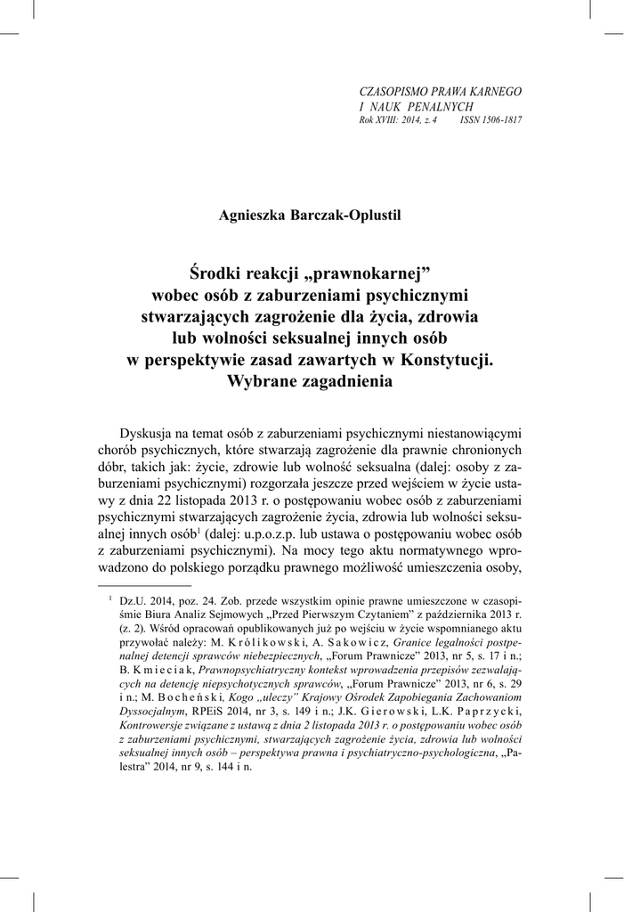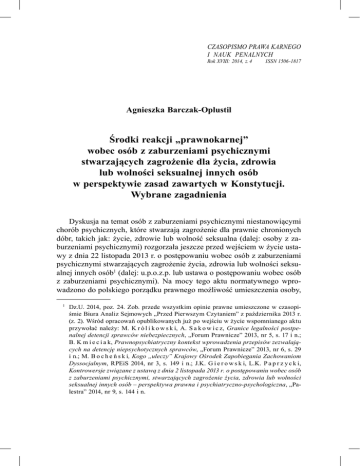 CZASOPISMO PRAWA KARNEGO I NAUK PENALNYCH Rok XVIII: 2014, z. 4 ISSN 1506-1817 Agnieszka Barczak-Oplustil Środki reakcji „prawnokarnej” wobec osób z zaburzeniami psychicznymi stwarzających zagrożenie dla życia, zdrowia lub wolności seksualnej innych osób w perspektywie zasad zawartych w Konstytucji. Wybrane zagadnienia Dyskusja na temat osób z zaburzeniami psychicznymi niestanowiącymi chorób psychicznych, które stwarzają zagrożenie dla prawnie chronionych dóbr, takich jak: życie, zdrowie lub wolność seksualna (dalej: osoby z zaburzeniami psychicznymi) rozgorzała jeszcze przed wejściem w życie ustawy z dnia 22 listopada 2013 r. o postępowaniu wobec osób z zaburzeniami psychicznymi stwarzających zagrożenie życia, zdrowia lub wolności seksualnej innych osób1 (dalej: u.p.o.z.p. lub ustawa o postępowaniu wobec osób z zaburzeniami psychicznymi). Na mocy tego aktu normatywnego wprowadzono do polskiego porządku prawnego możliwość umieszczenia osoby, 1 Dz.U. 2014, poz. 24. Zob. przede wszystkim opinie prawne umieszczone w czasopiśmie Biura Analiz Sejmowych „Przed Pierwszym Czytaniem” z października 2013 r. (z. 2). Wśród opracowań opublikowanych już po wejściu w życie wspomnianego aktu przywołać należy: M. K r ó l i k o w s k i, A. S a k o w i c z, Granice legalności postpenalnej detencji sprawców niebezpiecznych, „Forum Prawnicze” 2013, nr 5, s. 17 i n.; B. K m i e c i a k, Prawnopsychiatryczny kontekst wprowadzenia przepisów zezwalających na detencję niepsychotycznych sprawców, „Forum Prawnicze” 2013, nr 6, s. 29 i n.; M. B o c h e ń s k i, Kogo „uleczy” Krajowy Ośrodek Zapobiegania Zachowaniom Dyssocjalnym, RPEiS 2014, nr 3, s. 149 i n.; J.K. G i e r o w s k i, L.K. P a p r z y c k i, Kontrowersje związane z ustawą z dnia 2 listopada 2013 r. o postępowaniu wobec osób z zaburzeniami psychicznymi, stwarzających zagrożenie życia, zdrowia lub wolności seksualnej innych osób – perspektywa prawna i psychiatryczno-psychologiczna, „Palestra” 2014, nr 9, s. 144 i n. 54 Agnieszka Barczak-Oplustil która kończy odbywanie orzeczonej wobec niej kary pozbawienia wolności w Krajowym Ośrodku Zapobiegania Zachowaniom Dyssocjalnym (dalej: KOZZD)2. Uzasadnieniem dla umieszczenia danej osoby w tym ośrodku jest bardzo wysokie prawdopodobieństwo popełnienia czynu zabronionego z użyciem przemocy lub groźbą jej użycia przeciwko życiu, zdrowiu lub wolności seksualnej, zagrożonego karą pozbawienia wolności, której górna granica wynosi co najmniej 10 lat (art. 14 ust. 3 u.p.o.z.p.). To prawdopodobieństwo popełnienia czynu zabronionego uzasadnione musi być charakterem stwierdzonych u tej osoby zaburzeń psychicznych (w postaci upośledzenia umysłowego, zaburzenia osobowości lub zaburzeń preferencji seksualnej). Ponieważ z art. 1 u.p.o.z.p. wynika jednoznacznie, że ustawa ta reguluje postępowanie tylko wobec tych osób, które odbywają prawomocnie orzeczoną karę pozbawienia wolności lub karę 25 lat pozbawienia wolności pojawił się od razu problem zgodności tych uregulowań z art. 42 ust. 1 Konstytucji i zasadą lex severior retro non agit 3. Na wstępie należy tylko przypomnieć, że wysunięto różne propozycje uregulowania sposobu oddziaływania na tzw. osoby z zaburzeniami psychicznymi po zakończeniu przez nie odbywania kary pozbawienia wolności4. W drugiej połowie 2012 r. do Sejmu wpłynął poselski projekt ustawy o zmianie ustawy – Kodeks karny oraz ustawy Kodeks karny wykonawczy (druk nr 1538). Na mocy art. 1 projektu w ustawie z dnia 6 czerwca 1997 r. Kodeks karny5 po art. 95a zamierzano dodać art. 95b, który przewidywał możliwości orzeczenia przez sąd, wobec sprawcy skazanego na karę co najmniej 10 lat pozbawienia wolności lub karę surowszą, w okresie do 6 miesięcy przed przewidywanym warunkowym zwolnieniem lub przed wykonaniem kary, o potrzebie zastosowania po odbyciu tej kary środka zabezpieczającego, o którym mowa w art. 93 lub 95a6. Inny kierunek rozwiązań został 2 3 4 5 6 Na temat konieczności wprowadzenia omawianej regulacji zob. uzasadnienie projektu ustawy, druk sejmowy nr 1577 < http://orka.sejm.gov.pl/Druki7ka.nsf/0/8FAC382EE3488066C1257BAC004796F3/%24File/1577.pdf >. Zob. A. S a k o w i c z, Opinia prawna na temat projektu ustawy o postępowaniu wobec osób z zaburzeniami psychicznymi stwarzających zagrożenie życia, zdrowia lub wolności seksualnej innych osób, „Przed Pierwszym Czytaniem” 2013, z. 2, s. 33–34. Na temat poprzednich projektów zob. także J.K. G i e r o w s k i, L.K. P a p r z y c k i, op. cit., s. 146 i n.; P. G ó r a l s k i, Ocena proponowanych zmian w przepisach kodeksu karnego dotyczących środków zabezpieczających, RPEiS 2014, z. 1, s. 55 i n. Dz.U. z 1997 r., Nr 88, poz. 553 ze zm. Zob. < http://orka.sejm.gov.pl/Druki7ka.nsf/0/CE0BD16466B89C22C1257BA400358BD2/%24File/1538 >. Środki reakcji „prawnokarnej” wobec osób z zaburzeniami psychicznymi... 55 zaproponowany w projekcie ustawy o zmianie ustawy – Kodeks karny oraz niektórych innych ustaw (wersja z 14 stycznia 2013 r.). Projekt ten wprowadzał do ustawy z dnia 19 sierpnia 1994 r. o ochronie zdrowia psychicznego m.in. art. 32a, który zezwalał – w uproszczeniu – na przyjęcie osoby z zaburzeniami psychicznymi do szpitala psychiatrycznego bez zgody, o której mowa w art. 22 u.p.o.z.p., jeżeli ta osoba zagrażała m.in. życiu, zdrowiu lub wolności seksualnej innych osób7. Rozwiązania te były krytykowane zarówno przez prawników, jak i przez lekarzy psychiatrów (w drugim przypadku). Zdecydowano się zatem na uregulowanie omawianej materii w odrębnej ustawie. Pomysł ten nie jest autorskim pomysłem polskiego ustawodawcy (na co zresztą wprost zwrócono uwagę w uzasadnieniu8 projektu9). Wcześniej z tematyką sprawców niebezpiecznych z zaburzeniami psychicznymi, co do których w momencie orzekania nie istniała możliwość orzeczenia bezterminowej iz