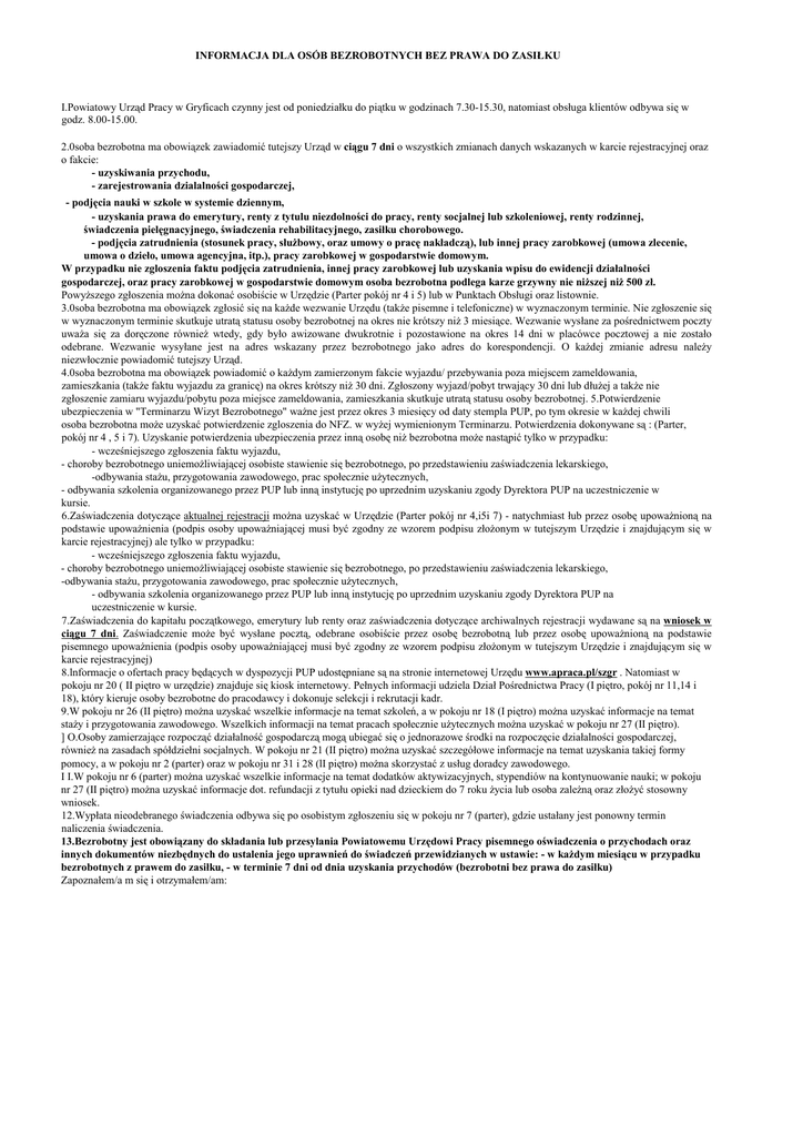 INFORMACJA DLA OSÓB BEZROBOTNYCH BEZ PRAWA DO ZASIŁKU I.Powiatowy Urząd Pracy w Gryficach czynny jest od poniedziałku do piątku w godzinach 7.30-15.30, natomiast obsługa klientów odbywa się w godz. 8.00-15.00. 2.0soba bezrobotna ma obowiązek zawiadomić tutejszy Urząd w ciągu 7 dni o wszystkich zmianach danych wskazanych w karcie rejestracyjnej oraz o fakcie: - uzyskiwania przychodu, - zarejestrowania dzialalności gospodarczej, - podjęcia nauki w szkole w systemie dziennym, - uzyskania prawa do emerytury, renty z tytulu niezdolności do pracy, renty socjalnej lub szkoleniowej, renty rodzinnej, świadczenia pielęgnacyjnego, świadczenia rehabilitacyjnego, zasiłku chorobowego. - podjęcia zatrudnienia (stosunek pracy, słuŜbowy, oraz umowy o pracę nakładczą), lub innej pracy zarobkowej (umowa zlecenie, umowa o dzieło, umowa agencyjna, itp.), pracy zarobkowej w gospodarstwie domowym. W przypadku nie zgloszenia faktu podjęcia zatrudnienia, innej pracy zarobkowej lub uzyskania wpisu do ewidencji działalności gospodarczej, oraz pracy zarobkowej w gospodarstwie domowym osoba bezrobotna podlega karze grzywny nie niŜszej niŜ 500 zł. PowyŜszego zgłoszenia moŜna dokonać osobiście w Urzędzie (Parter pokój nr 4 i 5) lub w Punktach Obsługi oraz listownie. 3.0soba bezrobotna ma obowiązek zgłosić się na kaŜde wezwanie Urzędu (takŜe pisemne i telefoniczne) w wyznaczonym terminie. Nie zgłoszenie się w wyznaczonym terminie skutkuje utratą statusu osoby bezrobotnej na okres nie krótszy niŜ 3 miesiące. Wezwanie wysłane za pośrednictwem poczty uwaŜa się za doręczone równieŜ wtedy, gdy było awizowane dwukrotnie i pozostawione na okres 14 dni w placówce pocztowej a nie zostało odebrane. Wezwanie wysyłane jest na adres wskazany przez bezrobotnego jako adres do korespondencji. O kaŜdej zmianie adresu naleŜy niezwłocznie powiadomić tutejszy Urząd. 4.0soba bezrobotna ma obowiązek powiadomić o kaŜdym zamierzonym fakcie wyjazdu/ przebywania poza miejscem zameldowania, zamieszkania (takŜe faktu wyjazdu za granicę) na okres krótszy niŜ 30 dni. Zgłoszony wyjazd/pobyt trwający 30 dni lub dłuŜej a takŜe nie zgłoszenie zamiaru wyjazdu/pobytu poza miejsce zameldowania, zamieszkania skutkuje utratą statusu osoby bezrobotnej. 5.Potwierdzenie ubezpieczenia w "Terminarzu Wizyt Bezrobotnego" waŜne jest przez okres 3 miesięcy od daty stempla PUP, po tym okresie w kaŜdej chwili osoba bezrobotna moŜe uzyskać potwierdzenie zgloszenia do NFZ. w wyŜej wymienionym Terminarzu. Potwierdzenia dokonywane są : (Parter, pokój nr 4 , 5 i 7). Uzyskanie potwierdzenia ubezpieczenia przez inną osobę niŜ bezrobotna moŜe nastąpić tylko w przypadku: - wcześniejszego zgłoszenia faktu wyjazdu, - choroby bezrobotnego uniemoŜliwiającej osobiste stawienie się bezrobotnego, po przedstawieniu zaświadczenia lekarskiego, -odbywania staŜu, przygotowania zawodowego, prac społecznie uŜytecznych, - odbywania szkolenia organizowanego przez PUP lub inną instytucję po uprzednim uzyskaniu zgody Dyrektora PUP na uczestniczenie w kursie. 6.Zaświadczenia dotyczące aktualnej rejestracji moŜna uzyskać w Urzędzie (Parter pokój nr 4,i5i 7) - natychmiast łub przez osobę upowaŜnioną na podstawie upowaŜnienia (podpis osoby upowaŜniającej musi być zgodny ze wzorem podpisu złoŜonym w tutejszym Urzędzie i znajdującym się w karcie rejestracyjnej) ale tylko w przypadku: - wcześniejszego zgłoszenia faktu wyjazdu, - choroby bezrobotnego uniemoŜliwiającej osobiste stawienie się bezrobotnego, po przedstawieniu zaświadczenia lekarskiego, -odbywania staŜu, przygotowania zawodowego, prac społecznie uŜytecznych, - odbywania szkolenia organizowanego przez PUP lub inną instytucję po uprzednim uzyskaniu zgody Dyrektora PUP na uczestniczenie w kursie. 7.Zaświadczenia do kapitału początkowego, emerytury lub renty oraz zaświadczenia dotyczące archiwalnych rejestracji wydawane są na wniosek w ciągu 7 dni. Zaświadczenie moŜe być wysłane pocztą, odebrane osobiście przez osobę bezrobotną lub przez osobę upowaŜnioną na podstawie pisemnego upowaŜnienia (podpis osoby upowaŜniającej musi być zgodny ze wzorem podpisu złoŜonym w tutejszym Urzędzie i znajdującym się w karcie rejestracyjnej) 8.lnformacje o ofertach pracy będących w dyspozycji PUP udostępniane są na stronie internetowej Urzędu www.apraca.pl/szgr . Natomiast w pokoju nr 20 ( II piętro w urzędzie) znajduje się kiosk internetowy. Pełnych informacji udziela Dział Pośrednictwa Pracy (I piętro, pokój nr 11,14 i 18), który kieruje osoby bezrobotne do pracodawcy i dokonuje selekcji i rekrutacji kadr. 9.W pokoju nr 26 (II piętro) moŜna uzyskać wszelkie informacje na temat szkoleń, a w pokoju nr 18 (I piętro) moŜna uzyskać informacje na temat staŜy i przygotowania zawodowego. Wszelkich informacji na temat pracach społecznie uŜytecznych moŜna uzyskać w pokoju nr 27 (II piętro). ] O.Osoby zamierzające rozpocząć działalność gospodarczą mogą ubiegać się o jednorazowe środki na rozpoczęcie działalności gospodarczej, równieŜ na zasadach spółdziełni socjalnych. W pokoju nr 21 (II piętro) moŜna uzyskać szczegółowe informacje na temat uzyskania takiej formy pomocy, a w pokoju nr 2 (parter) oraz w pokoju nr 31 i 28 (lI piętro) moŜna skorzystać z usług doradcy zawodowego. I I.W pokoju nr 6 (parter) moŜna uzyskać wszelkie informacje na temat dodatków aktywizacyjnych, stypendiów na kontynuowanie nauki; w pokoju nr 27 (II piętro) moŜna uzyskać informacje dot. refundacji z tytułu opieki nad dzieckiem do 7 roku Ŝycia lub osoba zaleŜną oraz złoŜyć stosowny wniosek. 12.Wypłata nieodebranego świadczenia odbywa się po osobistym zgłoszeniu się w pokoju nr 7 (parter), gdzie ustałany jest ponowny termin naliczenia świadczenia. 13.Bezrobotny jest obowiązany do składania lub przesylania Powiatowemu Urzędowi Pracy pisemnego oświadczenia o pr