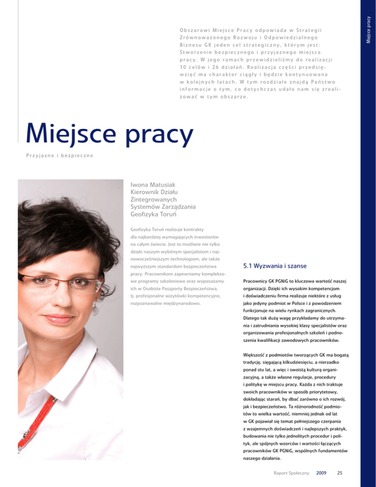 Miejsce pracy Przyjazne i bezpieczne Iwona Matusiak Kierownik Działu Zintegrowanych Systemów Zarządzania Geofizyka Toruń Geofizyka Toruń realizuje kontrakty dla najbardziej wymagających inwestorów na całym świecie. Jest to możliwie nie tylko dzięki naszym wybitnym specjalistom i najnowocześniejszym technologiom, ale także najwyższym standardom bezpieczeństwa 5.1 Wyzwania i szanse pracy. Pracownikom zapewniamy kompleksowe programy szkoleniowe oraz wyposażamy Pracownicy GK PGNiG to kluczowa wartość naszej ich w Osobiste Paszporty Bezpieczeństwa, organizacji. Dzięki ich wysokim kompetencjom tj. profesjonalne wizytówki kompetencyjne, i doświadczeniu firma realizuje niektóre z usług rozpoznawalne międzynarodowo. jako jedyny podmiot w Polsce i z powodzeniem funkcjonuje na wielu rynkach zagranicznych. Dlatego tak dużą wagę przykładamy do utrzymania i zatrudniania wysokiej klasy specjalistów oraz organizowania profesjonalnych szkoleń i podnoszenia kwalifikacji zawodowych pracowników. Większość z podmiotów tworzących GK ma bogatą tradycję, sięgającą kilkudziesięciu, a nierzadko ponad stu lat, a więc i swoistą kulturą organizacyjną, a także własne regulacje, procedury i politykę w miejscu pracy. Każda z nich traktuje swoich pracowników w sposób priorytetowy, dokładając starań, by dbać zarówno o ich rozwój, jak i bezpieczeństwo. Ta różnorodność podmiotów to wielka wartość, niemniej jednak od lat w GK pojawiał się temat pełniejszego czerpania z wzajemnych doświadczeń i najlepszych praktyk, budowania nie tylko jednolitych procedur i polityk, ale spójnych wzorców i wartości łączących pracowników GK PGNiG, wspólnych fundamentów naszego działania. Raport Społeczny 2009 25 Miejsce pracy Obszarowi Miejsce Pracy odpowiada w Strategii Zrównoważonego Rozwoju i Odpowiedzialnego Biznesu GK jeden cel strategiczny, którym jest: Stworzenie bezpiecznego i przyjaznego miejsca pracy. W jego ramach przewidzieliśmy do realizacji 10 celów i 26 działań. Realizacja części przedsięwzięć ma charakter ciągły i będzie kontynuowana w kolejnych latach. W tym rozdziale znajdą Państwo informacje o tym, co dotychczas udało nam się zrealizować w tym obszarze. 5.2 Kultura dialogu Znalazło to odzwierciedlenie w celach i działaniach Komunikacja wewnętrzna zapisanych w Strategii Zrównoważonego Rozwoju Sprawna komunikacja wewnętrzna w organi- i Odpowiedzialnego Biznesu. zacji o skali, zasięgu i specyfice działania GK to prawdziwe wyzwanie. Zatrudniamy kilkadziesiąt Koncentracja naszej aktywności w obszarze tysięcy osób w kilku oddziałach i w kilkudziesię- pracowniczym wokół celów przyjętych w Strategii ciu spółkach w kraju i zagranicą, wykonujących Zrównoważonego Rozwoju i Odpowiedzialnego prace biurowe, ale też w terenie – w kopalniach, Biznesu wzmacnia wymianę doświadczeń między na wiertniach, przy podziemnych magazynach służbami HR na poziomie GK, zapewnia ukierun- gazu czy przy osłudze sieci gazowej. Spójna kowany rozwój kadr oraz gwarantuje zbudowanie i szybka komunikacja to jedno z najważniejszych jednolitych, spójnych podstaw kształtowania praw pracowników, ale i podstawa powodzenia polityki HR w GK. Naszą ogromną szansę widzimy działalności biznesowej firm. Dlatego w GK PGNiG w możliwości realizacji wspólnych inicjatyw na stale rozwijamy narzędzia i kanały komunikacji rzecz pracowników i konsekwentnym budowaniu z pracownikami. Omówimy najważniejsze z nich. wspólnej strategii HR. Najistotniejsze wyzwanie Wdrożenie Strategii CSR stało się katalizatorem w tym obszarze związane jest z oceną podejmo- wielu inicjatyw i pomysłów w GK PGNiG, także Komunikatorzy – osoby odpowiedzialne wanych inicjatyw w zakresie HR w kontekście dotyczących miejsca pracy. W niniejszym raporcie między innymi za koordynowanie komunikacji celów Strategii Zrównoważonego Rozwoju, utrzy- prezentujemy najciekawsze z nich. Z myślą wewnętrznej w swoich macierzystych jednostkach maniem stałej dbałości o rozwój pracowników, o doskonaleniu tego obszaru podejmowane (oddziałach, gazowniach, spółkach) i koordyno- budową spójnego systemu komunikacji i Kodeksu są także inicjatywy w tzw. Programie budowy wanie współpracy w tym zakresie z pozostałymi Wartości Pracowników GK PGNiG. Jeśli ustrze- wartości GK PGNiG, realizowanym w GK PGNiG podmiotami GK, w tym Centralą PGNiG SA. W GK żemy się przed ryzykiem pojawienia się spraw od początku 2010 roku. W szczególności jest to PGNiG jest to w sumie kilkadziesiąt osób, które pozornie ważniejszych, utrzymamy jednakowy inicjatywa dedykowana dostosowaniu systemów kontaktują się na bieżąco ze swoimi odpowiedni- poziom zainteresowania wdrażaniem strategii, to motywacyjnych oraz wdrożeniu modelu oceny kami telefonicznie i mailowo, ale też przynajmniej w efekcie powinniśmy zrealizować nasz główny pracowników w ramach wdrażania nowego dwa razy w roku uczestniczą w spotkaniach cel długoterminowy. Wspólnie uznaliśmy, że modelu zarządzania GK PGNiG. Do połowy 2010 komunikacyjno-marketingowych całej tej grupy. jest nim w obszarze Miejsce Pracy zbudowanie roku powstały już założenia do systemu i procesu organizacji uczącej się i rozwijającej się zgodnie oceny pracowników oraz systemu motywacyj- Portal Newsletter – elektroniczny portal, w któ- z zasadami zrównoważonego rozwoju, dającej nego, dokonano też szczegółowej analizy obecnej rym zamieszczamy najważniejsze informacje dla satysfakcję zatrudnionym tu ludziom i spełniającej kultury organizacyjnej w PGNiG SA. Obecnie pracowników Grupy, z którego mogą korzystać oczekiwania rynku. trwają prace nad koncepcją docelowego systemu wszyscy niezależnie od obowiązujących w ich i procesu ocen pracowników oraz systemu moty- spółkach czy oddziałach systemach informatycz- wacyjnego. nych. Marta Cydejko, Dyrektor Biura Kadr i Szkoleń, Elektronicz