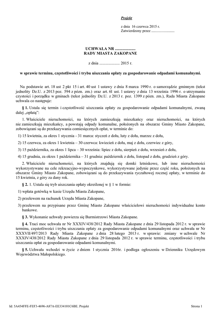 Projekt z dnia 16 czerwca 2015 r. Zatwierdzony przez ......................... UCHWAŁA NR .................... RADY MIASTA ZAKOPANE z dnia .................... 2015 r. w sprawie terminu, częstotliwości i trybu uiszczania opłaty za gospodarowanie odpadami komunalnymi. Na podstawie art. 18 ust 2 pkt 15 i art. 40 ust 1 ustawy z dnia 8 marca 1990 r. o samorządzie gminnym (tekst jednolity Dz.U. z 2013 poz. 594 z pózn. zm.) oraz art. 6l ust. 1 ustawy z dnia 13 września 1996 r. o utrzymaniu czystości i porządku w gminach (tekst jednolity Dz.U. z 2013 r. poz. 1399 z pózn. zm.), Rada Miasta Zakopane uchwala co następuje: § 1. Ustala się termin i częstotliwość uiszczania opłaty za gospodarowanie odpadami komunalnymi, zwaną dalej „opłatą”: 1. Właściciele nieruchomości, na których zamieszkują mieszkańcy oraz nieruchomości, na których nie zamieszkują mieszkańcy, a powstają odpady komunalne, położonych na obszarze Gminy Miasto Zakopane, zobowiązani są do przekazywania comiesięcznych opłat, w terminie do: 1) 15 kwietnia, za okres 1 stycznia - 31 marca: styczeń z dołu, luty z dołu, marzec z dołu, 2) 15 czerwca, za okres 1 kwietnia – 30 czerwca: kwiecień z dołu, maj z dołu, czerwiec z góry, 3) 15 października, za okres 1 lipca – 30 września: lipiec z dołu, sierpień z dołu, wrzesień z dołu, 4) 15 grudnia, za okres 1 października – 31 grudnia: październik z dołu, listopad z dołu, grudzień z góry. 2. Właściciele nieruchomości, na których znajdują się domki letniskowe, lub inne nieruchomości wykorzystywane na cele rekreacyjno-wypoczynkowe, wykorzystywane jedynie przez część roku, położonych na obszarze Gminy Miasto Zakopane, zobowiązani są do przekazywania ryczałtowej rocznej opłaty, w terminie do 15 kwietnia, z góry za dany rok. § 2. 1. Ustala się tryb uiszczania opłaty określonej w § 1 w formie: 1) wpłata gotówką w kasie Urzędu Miasta Zakopane, 2) przelewem na rachunek Urzędu Miasta Zakopane, 3) przelewem na przypisane przez Gminę Miasto Zakopane właścicielowi nieruchomości indywidualne konto bankowe. § 3. Wykonanie uchwały powierza się Burmistrzowi Miasta Zakopane. § 4. Traci moc uchwała nr Nr XXXIV/438/2012 Rady Miasta Zakopane z dnia 29 listopada 2012 r. w sprawie terminu, częstotliwości i trybu uiszczania opłaty za gospodarowanie odpadami komunalnymi oraz uchwała nr Nr XXXVII/497/2013 Rady Miasta Zakopane z dnia 28 lutego 2013 r. w sprawie: zmiany w uchwale Nr XXXIV/438/2012 Rady Miasta Zakopane z dnia 29 listopada 2012 r. w sprawie terminu, częstotliwości i trybu uiszczania opłat za gospodarowanie odpadami komunalnymi. § 5. Uchwała wchodzi w życie z dniem 1 stycznia 2016r. i podlega ogłoszeniu w Dzienniku Urzędowym Województwa Małopolskiego. Id: 5A454FFE-FEF3-4696-A87A-EE334101C6BE. Projekt Strona 1 Uzasadnienie W związku ze zmianą ustawy o utrzymaniu czystości i porządku w gminach (Dz. U. z 17 stycznia 2015r. poz. 87), koniecznym stało się zgodnie z art. 6l oraz w związku z art. 6j ust. 3b ustawy z dnia 13 września 1996r o utrzymaniu czystości i porządku w gminach (tekst jednolity Dz. U. z 2013r poz. 1399 z późn. zm.) podjęcie uchwały w zakresie określenia terminu, częstotliwości i trybu uiszczania opłaty za gospodarowanie odpadami komunalnymi w tym dla nieruchomościach, na których znajdują się domki letniskowe, lub inne nieruchomości wykorzystywane na cele rekreacyjno-wypoczynkowe, wykorzystywane jedynie przez część roku. Odrębną uchwałą określone zostaną wzór deklaracji o wysokości opłaty oraz wysokość opłaty. Id: 5A454FFE-FEF3-4696-A87A-EE334101C6BE. Projekt Strona 1