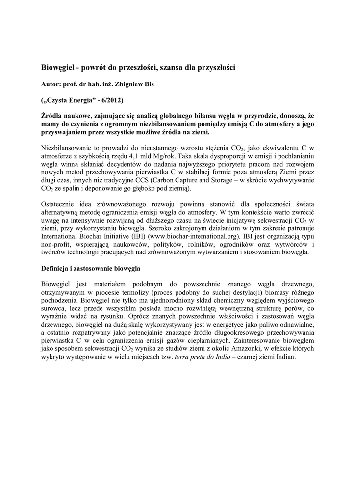 Biowęgiel - powrót do przeszłości, szansa dla przyszłości Autor: prof. dr hab. inż. Zbigniew Bis („Czysta Energia” - 6/2012) Źródła naukowe, zajmujące się analizą globalnego bilansu węgla w przyrodzie, donoszą, że mamy do czynienia z ogromnym niezbilansowaniem pomiędzy emisją C do atmosfery a jego przyswajaniem przez wszystkie możliwe źródła na ziemi. Niezbilansowanie to prowadzi do nieustannego wzrostu stężenia CO2, jako ekwiwalentu C w atmosferze z szybkością rzędu 4,1 mld Mg/rok. Taka skala dysproporcji w emisji i pochłanianiu węgla winna skłaniać decydentów do nadania najwyższego priorytetu pracom nad rozwojem nowych metod przechowywania pierwiastka C w stabilnej formie poza atmosferą Ziemi przez długi czas, innych niż tradycyjne CCS (Carbon Capture and Storage – w skrócie wychwytywanie CO2 ze spalin i deponowanie go głęboko pod ziemią). Ostatecznie idea zrównoważonego rozwoju powinna stanowić dla społeczności świata alternatywną metodę ograniczenia emisji węgla do atmosfery. W tym kontekście warto zwrócić uwagę na intensywnie rozwijaną od dłuższego czasu na świecie inicjatywę sekwestracji CO2 w ziemi, przy wykorzystaniu biowęgla. Szeroko zakrojonym działaniom w tym zakresie patronuje International Biochar Initiative (IBI) (www.biochar-international.org). IBI jest organizacją typu non-profit, wspierającą naukowców, polityków, rolników, ogrodników oraz wytwórców i twórców technologii pracujących nad zrównoważonym wytwarzaniem i stosowaniem biowęgla. Definicja i zastosowanie biowęgla Biowęgiel jest materiałem podobnym do powszechnie znanego węgla drzewnego, otrzymywanym w procesie termolizy (proces podobny do suchej destylacji) biomasy różnego pochodzenia. Biowęgiel nie tylko ma ujednorodniony skład chemiczny względem wyjściowego surowca, lecz przede wszystkim posiada mocno rozwiniętą wewnętrzną strukturę porów, co wyraźnie widać na rysunku. Oprócz znanych powszechnie właściwości i zastosowań węgla drzewnego, biowęgiel na dużą skalę wykorzystywany jest w energetyce jako paliwo odnawialne, a ostatnio rozpatrywany jako potencjalnie znaczące źródło długookresowego przechowywania pierwiastka C w celu ograniczenia emisji gazów cieplarnianych. Zainteresowanie biowęglem jako sposobem sekwestracji CO2 wynika ze studiów ziemi z okolic Amazonki, w efekcie których wykryto występowanie w wielu miejscach tzw. terra preta do Indio – czarnej ziemi Indian. Ziarno biowęgla w dużym powiększeniu Jest to gleba, która najprawdopodobniej powstawała dzięki celowym i systematycznym wysiłkom człowieka. Jej właściwości mocno kontrastują z właściwościami pozostałych, ubogich gleb amazońskich – jest bardzo żyzna. Ponieważ główny składnik terra preta stanowi węgiel, wprowadzenie opartych na niej agrokultur na szerszą skalę może w znaczący sposób przyczynić się do powstrzymania efektu cieplarnianego przez sekwestrację CO2 w glebie. Okazuje się, że prekolumbijski model prowadzenia agrokultury, organizacji społeczności i relacji pomiędzy człowiekiem a jego środowiskiem może służyć utrzymaniu bioróżnorodności i powstrzymaniu degradacji środowiska naturalnego, a także wspomóc wysiłki na rzecz ograniczenia skutków innych globalnych zagrożeń współczesności, których reperkusje mogą być w przyszłości trudne do zniwelowania. W rezultacie na świecie podejmowane są liczne projekty angażujące nie tylko społeczności akademickie, ale także przedsiębiorców, organizacje pozarządowe i społeczności lokalne. Przedsięwzięcia dotyczą zwłaszcza wybranych aspektów możliwych zastosowań bazowego składnika terra preta: węgla drzewnego czy też jego odpowiednika, produkowanego współcześnie dzięki termolizie biomasy – biowęgla. Sekwestracja – lepsze rozwiązanie Aktualnie biomasa jest masowo wykorzystywana do produkcji energii elektrycznej i ciepła pod hasłem ograniczania emisji CO2. Tak naprawdę liczy się tylko produkcja elektryczności, gdyż preferują ją specjalne certyfikaty. Różnica pomiędzy ograniczeniem emisji CO2 w efekcie produkcji bioenergii a sekwestracją CO2 przez biowęgiel może być wykazana poprzez wpływ obu metod na zawartość węgla w atmosferze. W obu przypadkach węgiel zawarty w biomasie wyjściowej został „wchłonięty” z atmosfery i zakłada się, że dalszy wzrost (uprawa) biomasy zastąpi tą, która została zebrana. W przypadku produkcji bioenergii węgiel jest „wypuszczony” z powrotem do powietrza, i tu także zakłada się, że jego adekwatna ilość zawarta w paliwach kopalnych nie musi opuszczać zasobów ziemi (zmniejsza się zużycie paliw kopalnych). Te ostatnie dwie wielkości nie są identyczne, ponieważ różne paliwa i różne technologie przetwarzania zawartej w nich energii emitują rozmaite ilości węgla podczas produkcji tej samej ilości energii. Podobnie różne technologie produkcji energii elektrycznej z biomasy cechują się mocno zróżnicowaną sprawnością. Dlatego też w wielu przypadkach jakaś (sucha albo wilgotna) biomasa może być traktowana raczej jako dodatkowy zapas niż równoważne zastąpienie produkcji energii elektrycznej, a tym samym także emisji CO2 z paliw kopalnych. Prostota sekwestracji poprzez biowęgiel Sekwestracja CO2 poprzez biowęgiel jest znacznie prostsza: ilość węgla „wyekstrahowana” z biomasy jest równa ilości sekwestrowanej tak długo, jak długo węgiel ten będzie trzymany w glebie. Do celów energetycznych stosowana jest głównie biomasa odpadowa. Nowe zasoby biomasy pozyskiwane z upraw roślin energetycznych mają większy potencjał energetyczny, ale póki co są droższe. W przeciwieństwie do systemów przetwarzających energię słońca, wiatru i hydro, nowoczesne systemy przetwarzania energii biomasy mają tę przewagę, że mogą być umieszczane w miejscach, gdzie faktycznie hoduje się rośliny i zwierzęta. 