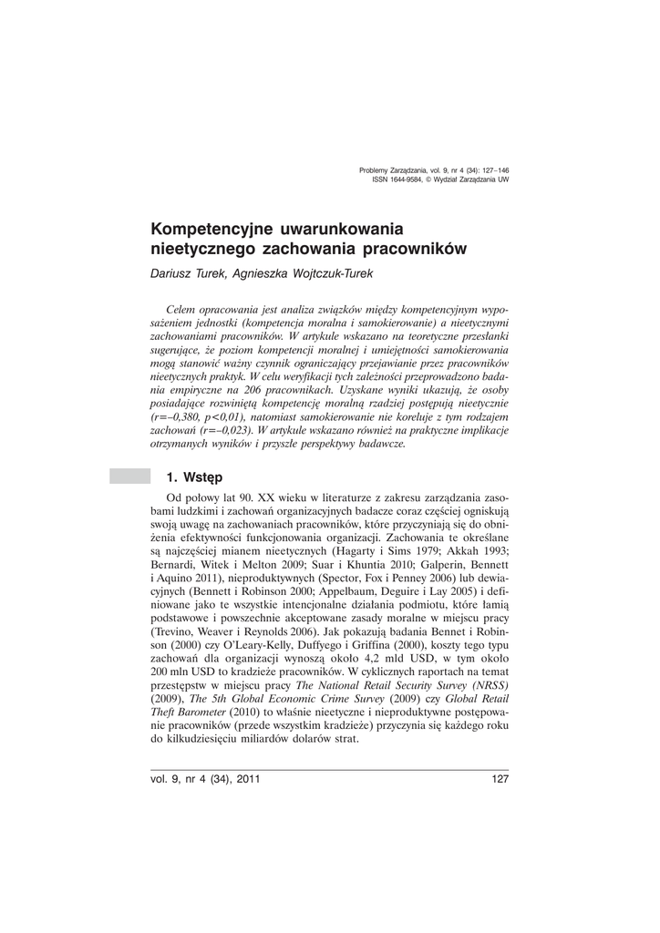 Problemy Zarządzania, vol. 9, nr 4 (34): 127 – 146 ISSN 1644-9584, © Wydział Zarządzania UW Kompetencyjne uwarunkowania nieetycznego zachowania pracowników Dariusz Turek, Agnieszka Wojtczuk-Turek Celem opracowania jest analiza związków między kompetencyjnym wyposażeniem jednostki (kompetencja moralna i samokierowanie) a nieetycznymi zachowaniami pracowników. W artykule wskazano na teoretyczne przesłanki sugerujące, że poziom kompetencji moralnej i umiejętności samokierowania mogą stanowić ważny czynnik ograniczający przejawianie przez pracowników nieetycznych praktyk. W celu weryfikacji tych zależności przeprowadzono badania empiryczne na 206 pracownikach. Uzyskane wyniki ukazują, że osoby posiadające rozwiniętą kompetencję moralną rzadziej postępują nieetycznie (r=–0,380, p<0,01), natomiast samokierowanie nie koreluje z tym rodzajem zachowań (r=–0,023). W artykule wskazano również na praktyczne implikacje otrzymanych wyników i przyszłe perspektywy badawcze. 1. Wstęp Od połowy lat 90. XX wieku w literaturze z zakresu zarządzania zasobami ludzkimi i zachowań organizacyjnych badacze coraz częściej ogniskują swoją uwagę na zachowaniach pracowników, które przyczyniają się do obniżenia efektywności funkcjonowania organizacji. Zachowania te określane są najczęściej mianem nieetycznych (Hagarty i Sims 1979; Akkah 1993; Bernardi, Witek i Melton 2009; Suar i Khuntia 2010; Galperin, Bennett i Aquino 2011), nieproduktywnych (Spector, Fox i Penney 2006) lub dewiacyjnych (Bennett i Robinson 2000; Appelbaum, Deguire i Lay 2005) i definiowane jako te wszystkie intencjonalne działania podmiotu, które łamią podstawowe i powszechnie akceptowane zasady moralne w miejscu pracy (Trevino, Weaver i Reynolds 2006). Jak pokazują badania Bennet i Robinson (2000) czy O’Leary-Kelly, Duffyego i Griffina (2000), koszty tego typu zachowań dla organizacji wynoszą około 4,2 mld USD, w tym około 200 mln USD to kradzieże pracowników. W cyklicznych raportach na temat przestępstw w miejscu pracy The National Retail Security Survey (NRSS) (2009), The 5th Global Economic Crime Survey (2009) czy Global Retail Theft Barometer (2010) to właśnie nieetyczne i nieproduktywne postępowanie pracowników (przede wszystkim kradzieże) przyczynia się każdego roku do kilkudziesięciu miliardów dolarów strat. vol. 9, nr 4 (34), 2011 127 Dariusz Turek, Agnieszka Wojtczuk-Turek Podobne wyniki, jeśli chodzi o nieetyczne zachowania pracowników, diagnozowane są również w Polsce. Z raportów badawczych z 2010 r. na temat wykroczeń wynika, że w blisko 77% firm w ciągu ostatnich dwóch lat zdarzyły się pracownicze sprzeniewierzenia (Euler Hermes 2010). Liczba ta nie oddaje najprawdopodobniej pełnej skali zjawiska – przedsiębiorstwa często nie wiedzą o występujących w nich nieprawidłowościach. Badania te wskazują, że największym wykroczeniem są kradzieże pracownicze (43%). Poważnym problemem w opinii rodzimych firm są także przywłaszczenia (23%) oraz oszustwa, na które wskazało 16% ankietowanych. Do innych rodzajów nadużyć (5%) najczęściej zaliczano: wyłudzenie towaru, działalność konkurencyjną, oświadczenia nieprawdy oraz nadmierne wydatki. Także w badaniach realizowanych przez portal Praca.pl (2010) na 3268 respondentach wskazuje się, że ponad 25% pracowników dopuszcza się kradzieży w firmie, wynosząc najczęściej drobne artykuły biurowe (11,75% badanych), defraudując niewielkie sumy pieniężne – 5,5% czy przywłaszczając herbatę i inne „biurowe” produkty spożywcze – 3,24%, a dwóch pracowników na stu wynosi produkty firmowe (2,36%). Również z badań CBOS z 2007 r. dotyczących etyki zawodowej w polskich firmach wynika, że 27% pracowników korzysta ze służbowych materiałów w celach prywatnych, 24% załatwia prywatne sprawy w godzinach pracy, a 8% realizuje dodatkowo płatne zalecenia w trakcie wykonywania swoich codziennych obowiązków (CBOS 2007), przyczyniając się tym samym do obniżenia efektywności pracy. Analiza tego typu zachowań staje się więc jednym z ważniejszych zagadnień, jakie muszą podjąć teoretycy i praktycy biznesu zajmujący się zarządzaniem zasobami ludzkimi, aby usprawniać funkcjonowanie poszczególnych podmiotów gospodarczych. 2. Co decyduje o nieetycznych zachowaniach pracowników Analiza problematyki uwarunkowań nieetycznego postepowania pracowników ukazuje, że determinantami zachowań w dużej mierze są czynniki instytucjonalne, organizacyjne i społeczne (grupowe). Do tej pory empirycznie wykazano m.in., że ograniczenie nieetycznych praktyk wiąże się z: − wdrażaniem programów społecznej odpowiedzialności przedsiębiorstw (Turek 2010; Aguilera i in. 2007), − implementowaniem dyrektyw etycznych w postaci procedur, zasad i norm postępowania (np. kodeksy etyczne) (Turek 2011a; Kaptein 2011), − występowaniem sprawiedliwych zasad podziału, reguł i systemów komunikacji (Macko 2009), − występowaniem w kulturze organizacyjnej wartości etycznych i społecznych (Bush i in. 2003; Turek 2011b), − brakiem grupowych patologicznych norm postępowania (Robinson i O’Leary-Kelly 1998; Robinson i Krattz 1998). 128 Problemy Zarządzania Kompetencyjne uwarunkowania nieetycznego zachowania pracowników Choć metaanalizy wielu badań ukazują, że to kontekst sytuacyjny (kulturowy, instytucjonalny, organizacyjny, społeczny) dominuje nad dyspozycjami poszczególnych jednostek (Richard, Bond Jr. i Stokes-Zoota 2003), warto jednak czynić starania, aby poznać podmiotowe uwarunkowania nieetycznego postępowania. Jest to istotne, gdyż bez wskazania podmiotowych moderatorów trudno konkluzywnie wyjaśniać przyczyny takich zachowań wśród pracowników, a ponadto projektować odziaływania zapobiegające tym występkom – czy to w postaci systemów kontroli, odpowiednich procedur rekrutacji i selekcji, czy też systemów szkoleń. W literaturze przedm