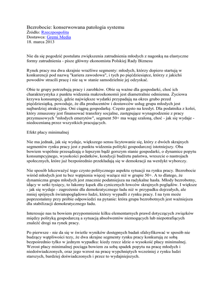 Bezrobocie: konserwowana patologia systemu Źródło: Rzeczpospolita Dostawca: Gremi Media 18. marca 2013 Nie da się pogodzić postulatu zwiększenia zatrudnienia młodych z nagonką na elastyczne formy zatrudnienia - pisze główny ekonomista Polskiej Rady Biznesu Rynek pracy ma dwa skrajnie wrażliwe segmenty: młodych, którzy dopiero startują w konkurencji pod nazwą "kariera zawodowa", i tych po pięćdziesiątce, którzy z jakichś powodów stracili pracę i nie są w stanie samodzielnie jej odzyskać. Obie te grupy potrzebują pracy i zarobków. Obie są ważne dla gospodarki, choć ich charakterystyka z punktu widzenia makroekonomii jest diametralnie odmienna. Życiowa krzywa konsumpcji, gdzie największe wydatki przypadają na okres grubo przed pięćdziesiątką, powoduje, że dla producentów i dostawców usług grupa młodych jest najbardziej atrakcyjna. Oni ciągną gospodarkę. Często gęsto na kredyt. Dla podatnika z kolei, który zmuszony jest finansować transfery socjalne, zastępujące wynagrodzenie z pracy przymusowych "młodych emerytów", segment 50+ ma wagę szaloną, choć - jak się wydaje niedocenianą przez wszystkich pracujących. Efekt płacy minimalnej Nie ma jednak, jak się wydaje, większego sensu licytowanie się, który z dwóch skrajnych segmentów rynku pracy jest z punktu widzenia polityki gospodarczej istotniejszy. Oba bowiem wspólnie przesądzają o lepszym bądź gorszym stanie gospodarki, o dynamice popytu konsumpcyjnego, wysokości podatków, kondycji budżetu państwa, wreszcie o nastrojach społecznych, które już bezpośrednio przekładają się w demokracji na werdykt wyborczy. Nie sposób lekceważyć tego czysto politycznego aspektu sytuacji na rynku pracy. Bezrobocie wśród młodych jest tu bez wątpienia więcej ważące niż w grupie 50+. A to dlatego, że dynamiczna grupa młodych jest znacznie podatniejsza na radykalne hasła. Młody bezrobotny, idący w setki tysięcy, to łakomy kąsek dla cynicznych łowców skrajnych poglądów. I większe - jak się wydaje - zagrożenie dla demokratycznego ładu niż w przypadku dojrzałych, ale mniej spójnych światopoglądowo ludzi, którzy wypadli z rynku pracy. I na tym może poprzestańmy przy próbie odpowiedzi na pytanie: która grupa bezrobotnych jest ważniejsza dla stabilizacji demokratycznego ładu. Interesuje nas tu bowiem przypomnienie kilku elementarnych prawd dotyczących związków między polityką gospodarczą a sytuacją absolwentów niemogących lub niepotrafiących znaleźć drogi na rynek pracy. Po pierwsze - nie da się w świetle wyników dostępnych badań sfalsyfikować w sposób nie budzący wątpliwości tezy, że dwa skrajne segmenty rynku pracy konkurują ze sobą bezpośrednio tylko w jednym wypadku: kiedy rzecz idzie o wysokość płacy minimalnej. Wzrost płacy minimalnej pociąga bowiem za sobą spadek popytu na pracę młodych i niedoświadczonych, oraz jego wzrost na pracę wypchniętych wcześniej z rynku ludzi starszych, bardziej doświadczonych i przez to wydajniejszych. Wniosek z tego dość oczywisty: jeśli polityczni decydenci, za głośno artykułowany priorytet, uznają zmniejszenie bezrobocia w grupie najmłodszych, a jednocześnie godzą się łatwo nieraz zadziwiająco łatwo - na wzrost płacy minimalnej, to zaprzeczają własnym, publicznie deklarowanym, priorytetom. Każda podwyżka płacy minimalnej na trudnym rynku zmniejsza szanse na znalezienie pracy tym, którzy dopiero startują, a zwiększa te szanse dla tych, którzy z rynku po wielu nieraz latach pracy wypadli. Tej prawdy zakrzyczeć się nie da. Będziemy mieli bary w Polsce i na całym świecie, zapełnione dyplomowanymi podawaczami posiłków i drinków tak długo, dopóki nie skończymy z edukacyjną korupcją Po drugie - nie da się też przekreślić bezpośredniego i czytelnego związku między jakością kształcenia a szansą znalezienia pracy. Choć mnóstwo się robi, by ten związek zamazać. Uważam, jak wielu moich kolegów ekonomistów i nauczycieli akademickich z powołania, że system kształcenia w Polsce jest największym sankcjonowanym przez państwo systemem powszechnej korupcji. Nauczyciele udają, że uczą; uczniowie za udawaną pracę kupują świadectwa i dyplomy, mylnie przy tym sądząc, że coś im się za to należy. Te mylne przekonania są następnie boleśnie weryfikowane przez rynek. Bo pracodawca, inaczej niż właściciel świstka papieru kupionego minimalnym wysiłkiem, ceni jakość i solidność renomowanych kierunków studiów. Zwodnicza magia dyplomu Wniosek: dyplom do niczego jeszcze nie uprawnia; dyplom nie daje automatycznie biletu wstępu na rynek pracy w zawodzie, z którym jest nominalnie związany. Będziemy mieli pełno bezrobotnych absolwentów; będziemy mieli bary w Polsce, i na całym świecie, zapełnione dyplomowanymi podawaczami posiłków i drinków, tak długo, dopóki nie skończymy z edukacyjną korupcją. Tej lekcji, w postaci zasadniczego przemodelowania systemu kształcenia na wszystkich szczeblach (od elementarnego poczynając), co ma bezpośredni wpływ na bezrobocie wśród absolwentów, nikt poza państwem nie przerobi. Państwo, proponując racjonalizację systemu edukacyjnego, może i powinno liczyć na wsparcie sektora prywatnego, który w dominującej części jest odbiorcą chcianego lub nie, produktu finalnego tego systemu. Ale też sektor prywatny, tworząc miejsca pracy dla młodych, nigdy nie dopuści do zaniku konkurencyjności rynku. Konkurencja na rynku pracy jest tak samo ważna jak miejsca pracy, albo może nawet ważniejsza. Nikt nie ma prawa nakazywać pracodawcom, by zatrudniali absolwentów skorumpowanego systemu edukacji. Po trzecie - państwo może próbować doraźnymi środkami wpłynąć na wzrost popytu na pracę w grupie najmłodszych. Menu dostępnych instrumentów podatkowych, parapodatkowych, wydatków na dokształcanie i innych jest już dawno spisane. Nikt tu niczego nowego nie wymyśl