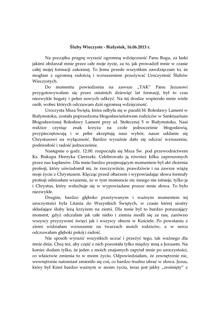 Śluby Wieczyste - Białystok, 16.06.2013 r. Na początku pragnę wyrazić ogromną wdzięczność Panu Bogu, za łaski jakimi obdarzał mnie przez całe moje życie, za to, jak prowadził mnie w czasie całej mojej formacji zakonnej. To Jemu przede wszystkim zawdzięczam to, że mogłam z ogromną radością i wzruszeniem przeżywać Uroczystość Ślubów Wieczystych. Do momentu powiedzenia na zawsze „TAK” Panu Jezusowi przygotowywałam się przez ostatnich dziewięć lat formacji, był to czas niezwykle bogaty i pełen nowych odkryć. Na tej drodze wspierało mnie wiele osób, wobec których odczuwam dziś ogromną wdzięczność. Uroczysta Msza Święta, która odbyła się w parafii bł. Bolesławy Lament w Białymstoku, została poprzedzona błogosławieństwem rodziców w Sanktuarium Błogosławionej Bolesławy Lament przy ul. Stołecznej 5 w Białymstoku. Nasi rodzice czyniąc znak krzyża na czole jednocześnie błogosławią, przypieczętowują i w pełni akceptują nasz wybór, nasze oddanie się Chrystusowi na wyłączność. Bardzo wyraźnie dało się odczuć wzruszenie, podniosłość i radość jednocześnie. Następnie o godz. 12.00. rozpoczęła się Msza Św. pod przewodnictwem Ks. Biskupa Henryka Ciereszki. Celebrowało ją również kilku zaproszonych przez nas kapłanów. Dla mnie bardzo przejmującym momentem był akt złożenia profesji, który uświadomił mi, że rzeczywiście, prawdziwie i na zawsze wiążę moje życie z Chrystusem. Klęcząc przed ołtarzem i wypowiadając słowa formuły profesji odniosłam wrażenie, że w tym momencie nic innego nie istnieje, tylko ja i Chrystus, który wsłuchuje się w wypowiadane przeze mnie słowa. To było niezwykłe. Drugim, bardzo głęboko przeżywanym i ważnym momentem tej uroczystości była Litania do Wszystkich Świętych, w czasie której siostry składające śluby leżą krzyżem na ziemi. Dla mnie był to bardzo poruszający moment, gdyż odczułam jak całe niebo i ziemia modli się za nas, zarówno wszyscy przyzywani święci jak i wszyscy obecni w Kościele. Po powstaniu z ziemi widziałam wzruszenie na twarzach moich rodziców, a w sercu odczuwałam głęboki pokój i radość. Nie sposób wyrazić wszystkich uczuć i przeżyć tego, tak ważnego dla mnie dnia. Chcę też, aby część z nich pozostała tylko między mną a Jezusem. Na koniec dodam tylko, że jeden z moich znajomych zapytał mnie po uroczystości, co właściwie zmienia to w moim życiu. Odpowiedziałam, że zewnętrznie nic, wewnętrznie natomiast zmieniło się coś, co bardzo trudno ubrać w słowa. Jezus, który był Kimś bardzo ważnym w moim życiu, teraz jest jakby „zrośnięty” z moim życiem, tak jakby już nie było On i ja, ale My. Bogu niech będą za wszystko dzięki! s. Maksymiliana od Jezusa Miłosiernego