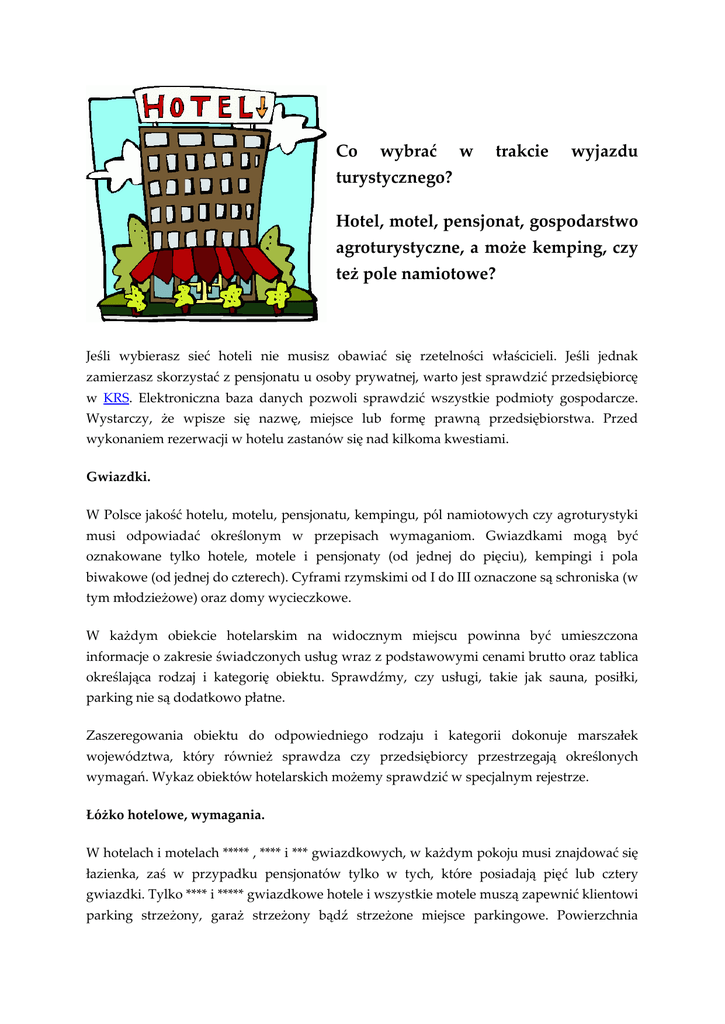 Co wybrać w trakcie wyjazdu turystycznego? Hotel, motel, pensjonat, gospodarstwo agroturystyczne, a może kemping, czy też pole namiotowe? Jeśli wybierasz sieć hoteli nie musisz obawiać się rzetelności właścicieli. Jeśli jednak zamierzasz skorzystać z pensjonatu u osoby prywatnej, warto jest sprawdzić przedsiębiorcę w KRS. Elektroniczna baza danych pozwoli sprawdzić wszystkie podmioty gospodarcze. Wystarczy, że wpisze się nazwę, miejsce lub formę prawną przedsiębiorstwa. Przed wykonaniem rezerwacji w hotelu zastanów się nad kilkoma kwestiami. Gwiazdki. W Polsce jakość hotelu, motelu, pensjonatu, kempingu, pól namiotowych czy agroturystyki musi odpowiadać określonym w przepisach wymaganiom. Gwiazdkami mogą być oznakowane tylko hotele, motele i pensjonaty (od jednej do pięciu), kempingi i pola biwakowe (od jednej do czterech). Cyframi rzymskimi od I do III oznaczone są schroniska (w tym młodzieżowe) oraz domy wycieczkowe. W każdym obiekcie hotelarskim na widocznym miejscu powinna być umieszczona informacje o zakresie świadczonych usług wraz z podstawowymi cenami brutto oraz tablica określająca rodzaj i kategorię obiektu. Sprawdźmy, czy usługi, takie jak sauna, posiłki, parking nie są dodatkowo płatne. Zaszeregowania obiektu do odpowiedniego rodzaju i kategorii dokonuje marszałek województwa, który również sprawdza czy przedsiębiorcy przestrzegają określonych wymagań. Wykaz obiektów hotelarskich możemy sprawdzić w specjalnym rejestrze. Łóżko hotelowe, wymagania. W hotelach i motelach ***** , **** i *** gwiazdkowych, w każdym pokoju musi znajdować się łazienka, zaś w przypadku pensjonatów tylko w tych, które posiadają pięć lub cztery gwiazdki. Tylko **** i ***** gwiazdkowe hotele i wszystkie motele muszą zapewnić klientowi parking strzeżony, garaż strzeżony bądź strzeżone miejsce parkingowe. Powierzchnia pokoju dwuosobowego w hotelu pięciogwiazdkowym wynosi 18 m² (w jednogwiazdkowym – 10), łóżko dwuosobowe powinno mieć wymiary 140x200 cm, w pokoju musi znajdować się szafa, minimum dwa fotele lub kanapa, lampka nocna, a nawet szklanki. Pościel musi być zmieniana codziennie lub na życzenie konsumenta. Hotel, motel i pensjonat *****, **** i *** gwiazdkowy musi akceptować płatność kartą płatniczą. Natomiast każdy kemping musi mieć całodobowy dozór, urządzenia sanitarne muszą być zlokalizowane nie dalej niż 100 m od miejsca noclegu. W kempingu **** gwiazdkowym na 50 osób przypadać musi jeden natrysk z ciepłą wodą przez całą dobę, a w * gwiazdkowym – jeden natrysk na 100 turystów, może nie być ciepłej wody bieżącej. Hotelik, motelik, motel. Ochronie prawnej podlegają nazwy, takie jak hotel, motel, pensjonat. Każda inna może być próbą ominięcia prawa – z praktyki UOKiK wynika, że przedsiębiorcy używają zdrobnień, przyrostków lux, niepełnych nazw wtedy, gdy ich obiekty nie spełniają określonych w przepisach wymagań (np. sanitarnych lub przeciwpożarowych) i nie posiadają odpowiedniego zezwolenia marszałka województwa. Aby przyciągnąć klientów, świadomie przekształcają nazwy, oferując noclegi według dowolnie ustalonego standardu. Reklamacja. Jeżeli pokój w gospodarstwie agroturystycznym w rzeczywistości różni się od zamówionego, a hotel położony jest dalej od morza, niż zapewniał pracownik, przysługuje prawo do reklamacji. Jeżeli konsument samodzielnie rezerwuje nocleg w obiekcie hotelarskim i nie jest zadowolony z usługi, może dochodzić swoich praw na podstawie Kodeksu cywilnego. Powinien jak najszybciej zgłosić nieprawidłowości właścicielowi obiektu i wyznaczyć termin na naprawę usterki, wymianę wyposażenia, czy zamianę pokoju. Jeżeli przedsiębiorca nie usunie wady w wyznaczonym przez nas czasie lub nie jest to możliwe z innych przyczyn – mamy prawo żądać zmniejszenia ceny, a w ostateczności odstąpić od umowy i zażądać zwrotu zapłaconej kwoty. Odstąpienie od umowy jest możliwe, jeśli wada jest istotna. Stosunek ceny do standardu hotelu. – to rzecz ważna. Niejednokrotnie zdarza się, że cena pokoju w hotelu 2-gwiazdkowym jest wyższa niż np. w 4-gwiazdkowym. Jeżeli za podobną cenę możemy uzyskać odrobinę luksusu to myślę, że warto to rozważyć. Dobrze jest po prostu korzystać z filtrów na stronie booking.com i jej podobnych i porównywać najtańsze oferty hoteli o jak najwyższym standardzie. Niejednokrotnie rezultaty mogą nas bardzo miło zaskoczyć. Opinie. Serwisy rezerwacyjne dają swoim użytkownikom możliwość pozostawienia opinii o danym hotelu. Jest to bardzo pomocne przy wyborze najlepszej opcji. Z tych komentarzy możemy się dowiedzieć jakie naprawdę są plusy i minusy danego miejsca. Z pewnością znajdziemy tam także rzetelne informacje dot. lokalizacji i ewentualnego czasu dojazdu do centrum. Z doświadczenia wiem jednak, że do opinii zwłaszcza tych dotyczących obsługi, poziomu czystości itd. nie powinniśmy się bardzo przywiązywać. Zwłaszcza jeżeli nie ma ich dużo. Ludzie nadzwyczaj często najpierw szukają taniego noclegu, a potem narzekają na brak luksusów charakterystycznych dla 5-gwiazdkowych hoteli. Nigdy się wszystkim nie dogodzi, więc sprawdzajmy opinie, ale myślmy sami. Zaliczka czy zadatek. Uważajmy czy wpłacamy zadatek czy zaliczkę. W przypadku niewykonania umowy z winy przedsiębiorcy (np. rezerwacja nie została dokonana) wpłacona zaliczka zostanie nam zwrócona. Jeśli natomiast wpłaciliśmy zadatek, to wykonawca zwraca go w podwójnej wysokości. Pomoc dla konsumentów. W razie problemów z reklamacją usługi hotelarskiej konsumenci mogą liczyć na pomoc miejskich lub powiatowych rzeczników konsumentów czy organizacji pozarządowych Federacji Konsumentów, Stowarzyszenia Konsumentów Polskich oraz Inspekcji Handlowej. Bezpłatne porady udzielane są również pod numerem telefonu 800 007 707. Opracował: specjalista Ilona Wit