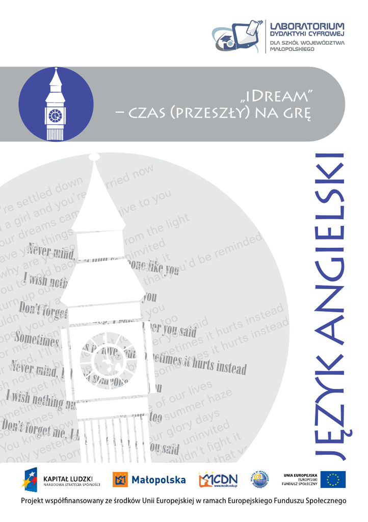 JĘZYK ANGIELSKI „iDream” – czas (przeszły) na grę Projekt współfinansowany ze środków Unii Europejskiej w ramach Europejskiego Funduszu Społecznego Poradnik powstał w wyniku współpracy zespołu nauczycieli, trenerów i autorów: Barbara Chełmecka-Czekaj, Anna Czyż, Krzysztof Grynienko, Maciej Krzywda-Pogorzelski, Anna Mazur, Magdalena Mitera, Grażyna Studzińska Język angielski – gamifikacja – gimnazjum – bez gry online „iDream” – czas (przeszły) na grę Cel zajęć Cele wynikające z podstawy programowej Uczeń: • • posługuje się podstawowym zasobem środków językowych (leksykalnych, gramatycznych, ortograficznych oraz fonetycznych). rozumie proste, krótkie wypowiedzi ustne artykułowane wyraźnie, w standardowej odmianie języka, a także krótkie i proste wypowiedzi pisemne. Cele operacyjne osiągane przez uczniów Uczeń: • • • • uczeń stosuje formy czasu past simple czasowników regularnych i nieregularnych uczeń wyszukuje informacje szczegółowe w tekście uczeń rozumie teksty dotyczące przeszłości uczeń rozumie ze słuchu wypowiedzi w standardowej odmianie języka Organizacja lekcji Infrastruktura • • • Układ miejsc do pracy grupowej w zespołach 3–4 osobowych Urządzenie z dostępem do Internetu dla każdego z zespołów projektor multimedialny i ekran podłączony do komputera nauczyciela, z dostępem do Internetu Zasoby • • • • Formularz gry w arkuszu Google http://goo.gl/9jNNr8 Załącznik nr 1 – iDream – treść zadań z kluczem odpowiedzi Załącznik nr 2 – iDream – zasady gry Załącznik nr 3 – iDream – kody QR 1 Przygotowanie do lekcji • • • • • • • • • • 2 Stworzenie kopii arkusza do gry http://goo.gl/9jNNr8 dla danej rozgrywki wydrukowanie kodów QR z odnośnikami do zadań do gry w dokumentach Google umieszczenie kartek z kodami QR na tablicy zgodnie z oznaczeniami przygotowanie zdjęcia Steve’a Jobsa i zdjęcia nadgryzionego jabłuszka (logo Apple) do wyświetlenia na ekranie przygotowanie kolorowych jabłek z papieru do podziału uczniów na zespoły przygotowanie kartek do zapisu odpowiedzi uczniów w takich samych kolorach jakie są na karteczkach do podziału na grupy – każda grupa otrzymuje taki kolor jaki wylosowała przygotowanie długopisów lub ołówków dla grup przygotowanie rankingu w formularzu Google do wprowadzania wyników poszczególnych zespołów przygotowanie ankiety ewaluacyjnej oraz wydrukowanie odpowiedniej liczby kart do głosowania w aplikacji Plickers (plickers.com) w celu dokonania przez uczniów ewaluacji lekcji otwarcie na komputerach uczniów aplikacji służącej do skanowania kodów QR (pod adresem: http://webqr.com) Język angielski – gamifikacja – gimnazjum – bez gry online Przebieg procesu dydaktycznego LekCja Czas: 3 min Organizacja lekcji i podział na zespoły Przy wejściu do klasy uczniowie losują kolorowe jabłuszka z papieru (w pięciu kolorach odpowiadających kolorom poszczególnych grup). Podzieleni na grupy uczniowie wchodzą do sali. W tej części jest także czas na powitanie uczniów oraz sprawy organizacyjne jak sprawdzenie obecności, przedstawienie celów lekcji Kolorowe kartki Czas: 7 min Wprowadzenie do gry Wyświetl logo firmy Apple (nadgryzione jabłko) na ekranie. Zapytaj uczniów z czym kojarzy im się ten obraz. Przewidywane odpowiedzi uczniów: computers, iPhone, Steve Jobs. Kiedy padnie odpowiedź, że z postacią Steva Jobsa wyświetl na ekranie zdjęcie Jobsa a następnie zadaj kolejno poniższe pytania • • • What is he famous for? Is he still alive? What did he design? Poproś uczniów o odpowiedzi na pytanie “What did he design?” zapisz odpowiedzi uczniów na tablicy: Na przykład: He designed an iPhone. W trakcie podkreślaj formę “designed” i pytaj, w jakim jest czasie gramatycznym. Uczniowie odpowiadają: Past Simple. Wyjaśnij, że dzisiejsza lekcja służy powtórzeniu i zebraniu wiadomości o tym czasie gramatycznym. Wskaż również na konieczność użycia tego czasu w opisywaniu biografii zmarłych osób. Wyjaśnij, że uczniowie zagrają teraz w grę, dzięki której powtórzą i utrwalą budowę i zasady użycia czasu Past Simple. 3 Następnie wyjaśnij reguły gry (Załącznik nr 2 – iDream – zasady gry), czytając je po angielsku, a następnie tłumacząc na język polski. Zwróć uwagę na fakt, iż punkty uzyskane przez poszczególne zespoły będą zapisywane w formularzu wyświetlonym na ekranie. Wyjaśnij, że aby uzyskać dostęp do treści zadań uczniowie muszą zeskanować kody QR używając specjalnej aplikacji otwartej wcześniej na laptopach. Zadania podzielone są na 3 kategorie (zależne od stopnia trudności). W każdym z zadań są 4 pytania/przykłady. Za każdą poprawną odpowiedź, uczniowie otrzymują punkt. Punkty mnożone są przez 1 w zadaniach łatwych, przez 2 w zadaniach o średnim stopniu trudności i przez 3 w zadaniach trudnych. Przykładowo, jeśli uczniowie w zadaniu 2.3 podadzą 3 poprawne odpowiedzi, zdobędą 6 punktów. Gra sieciowa „iDream” – ekrany uczniowskie na komputerach zespołów i ekran rankingu na tablicy multimedialnej Czas: 30 min Gra zespołowa Powiedz, że gra właśnie się rozpoczyna i mają na rozgrywkę 30 minut. Przebieg gry jest następujący: • • • • • Uczniowie odczepiają z tablicy i odczepiają kod QR zadania, skanują go na laptopie i przyczepiają do tablicy kod w jego miejscu. Następnie uczniowie zapisują odpowiedzi do zadań na kartkach w kolorach odpowiadających kolorom grup, przynoszą je do twojego stanowiska. Wpisujesz wyniki do formularza gry online w zależności od punktacji podanej w kluczu do zadań. Wyniki z formularza wyświetlają się na bieżąco na ekranie lub tablicy multimedialnej. Twoją rolą na tym etapie lekcji jest ocena zadań dostarczonych przez poszczególne grupy uczniów, wprowadzenie wyników do formularza oraz nadzór nad przestrzeganiem reguł