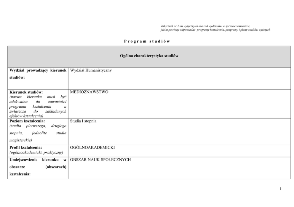 Załącznik nr 2 do wytycznych dla rad wydziałów w sprawie warunków, jakim powinny odpowiadać programy kształcenia, programy i plany studiów wyższych Program studiów Ogólna charakterystyka studiów Wydział prowadzący kierunek Wydział Humanistyczny studiów: MEDIOZNAWSTWO Kierunek studiów: (nazwa kierunku musi być adekwatna do zawartości programu kształcenia a zwłaszcza do zakładanych efektów kształcenia) Studia I stopnia Poziom kształcenia: (studia pierwszego, drugiego stopnia, jednolite studia magisterskie) OGÓLNOAKADEMICKI Profil kształcenia: (ogólnoakademicki, praktyczny) Umiejscowienie obszarze kierunku w OBSZAR NAUK SPOŁECZNYCH (obszarach) kształcenia: 1 Forma studiów: (studia stacjonarne, STUDIA STACJONARNE studia niestacjonarne) Liczba semestrów: 6 (SZEŚĆ) Liczba punktów ECTS 180 konieczna do uzyskania kwalifikacji odpowiadających poziomowi studiów: Łączna liczba godzin 1800 dydaktycznych: Tytuł zawodowy uzyskiwany LICENCJAT przez absolwenta: Specjalność: Medioznawstwo Studia opierają się na kulturowym, społecznym, filozoficznym, informatologicznym i kognitywistycznym rozumieniu zagadnień w Ogólne cele kształcenia oraz obrębie pięciu głównych modułów: 1) Teorie mediów, 2) Działanie i praktyki mediów, 3) Krytyczne ujęcia mediów, 4) Umiejętności i możliwości zatrudnienia i technologie medialne oraz 5) Moduł przedmiotów do wyboru wzbogacających program. Oferujemy współczesną wiedzę krytyczną dotyczącą kontynuacji kształcenia przez mediów, a także możliwość nabycia umiejętności ich profesjonalnego kształtowania. absolwentów kierunku: Wyrobieniu praktycznych umiejętności operowania wiedzą o mediach służy bogata oferta warsztatów (laboratoriów) i konwersatoriów. Program studiów opiera się na laboratoriach komputerowych, telewizyjnych, warsztatach współczesnych technik realizacji radiowej, współpracy z mediami ogólnopolskimi („TOK FM”) oraz lokalnymi (Radio „Zet Gold”, „Gazeta Pomorska”, „Radio Sfera”), toruńskimi instytucjami kultury i sztuki (Centrum Sztuki Współczesnej), a także na wykorzystaniu infrastruktury telewizji UMK oraz zasobów Uczelnianego Centrum Informatycznego. Studia podejmują szeroko rozumianą problematykę treści, historii, znaczenia, form przekazu oraz kształtowania mediów 2 (tradycyjnych i najnowszych, z włączeniem mediów masowych). Program opiera się na zasobach oraz metodach badawczych takich subdyscyplin, jak: studia kulturowe, retoryka i erystyka, semiotyka, teorie rozumowań, psychologia komunikacji, antropologia obrazu, teorie społeczne płci, teorie filmu, współczesne teorie informatyczne, ekonomia polityczna, teorie feministyczne i badania nad płcią społecznokulturową, etyka mediów, aksjologia komunikacji, badania popkultury, studia nad nauką i technologią, analiza środków masowego przekazu, teorie i narzędzia PR, badania reklamy, krytyczne studia nad mediami, informatologia, podstawy współczesnych technologii informatycznych. Program tworzy dziewięć modułów. Cztery pierwsze: 1) Teorie mediów, 2) Działanie i praktyki mediów, 3) Krytyczne ujęcia mediów oraz 4) Umiejętności i technologie medialne tworzą zasadniczą część merytoryczną programu. Dwa kolejne mają charakter wzbogacający (moduł zajęć ogólnouczelnianych i oferowanych na innym kierunku, moduł przedmiotów do wyboru), trzy ostatnie (moduł zajęć z wychowania fizycznego, moduł języków obcych oraz moduł seminariów licencjackich) realizują zajęcia obligatoryjne dla studiów licencjackich. Na pierwszy moduł składają się takie zagadnienia, jak: podstawy medioznawstwa (wstęp do teorii mediów i komunikacji społecznej), historia mediów, wstęp do badania kultury współczesnej, filozofia i socjologia kultury, podstawy semiotyki i pragmatyki logicznej, elementy logiki i teorii rozumowań, podstawy psychologii społecznej. W drugim module pojawią się zagadnienia praktyczne dotyczące realnego funkcjonowania mediów: psychologia reklamy z elementami fizjologii, socjologia internetu, język fotografii, socjologia literatury, metody i techniki badania mediów, analiza i selekcja treści medialnych, ochrona własności intelektualnej, prawo prasowe i autorskie, techniki i narzędzia public relations/marketing polityczny, zarządzanie współczesnymi mediami, problem własności i kontroli mediów. Trzeci moduł koncentruje się wokół ujęć krytycznych wobec mediów współczesnych. Znajdziemy w nim następujące tematy: mechanizmy wytwarzania znaczeń, ideologii i przekazu symbolicznego w świecie współczesnym, imperializm mediów w kontekście procesów globalizacji, krytyka medialnych sposobów reprezentowania (ekspertów, kontrowersji naukowych i konfliktów technologicznych, biotechnologii, płci, wieku, rasy etc.), etyczny wymiar przekazu reklamy, etyka sfery publicznej. Czwarty moduł stanowi grupa przedmiotów o charakterze warsztatowym, laboratoryjnym, nastawionych na kształtowanie umiejętności praktycznych związanych z technologiami środków przekazu. Znajdziemy tu: warsztaty w studiu telewizyjnym UMK, zajęcia ze współczesnych technik realizacji radiowej, laboratoria komputerowe (Tworzenie i zarządzanie projektami internetowymi, IT w komunikacji masowej, Przetwarzanie cyfrowe mediów), trening umiejętności interpersonalnych, zajęcia dotyczące mediów dla osób wykluczonych. Program został wzbogacony szeroką ofertą zajęć wzbogacających program o charakterze fakultatywnym, m.in.: wybrane problemy ekonomii, media a polityka, zjawiska globalne: teorie i interpretacje, historia komunikacji (oralność, epoka pisma, druku, mediów masowych, Facebooka), wartości w komunikowaniu, analiza treści medialnych, media katolickie, komercjalizacja wiedzy naukowej, partycypacja publiczna w teorii i praktyce. Kontynuacja kształcenia Absolwenci medioznawstwa mogą kontynuować kształcenie na istniejących studiach drugie