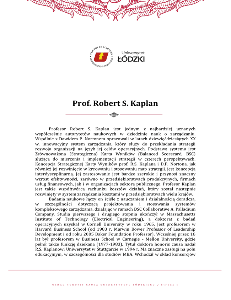 Prof. Robert S. Kaplan Profesor Robert S. Kaplan jest jednym z najbardziej uznanych współcześnie autorytetów naukowych w dziedzinie nauk o zarządzaniu. Wspólnie z Dawidem P. Nortonem opracowali w latach dziewięćdziesiątych XX w. innowacyjny system zarządzania, który służy do przekładania strategii rozwoju organizacji na język jej celów operacyjnych. Podstawą systemu jest Zrównoważona (Strategiczna) Karta Wyników (Balanced Scorecard, BSC) służąca do mierzenia i implementacji strategii w czterech perspektywach. Koncepcja Strategicznej Karty Wyników prof. R.S. Kaplana i D.P. Nortona, jak również jej rozwinięcie w kreowaniu i stosowaniu map strategii, jest koncepcją interdyscyplinarną. Jej zastosowanie jest bardzo szerokie i przynosi znaczny wzrost efektywności, zarówno w przedsiębiorstwach produkcyjnych, firmach usług finansowych, jak i w organizacjach sektora publicznego. Profesor Kaplan jest także współtwórcą rachunku kosztów działań, który został następnie rozwinięty w system zarządzania kosztami w przedsiębiorstwach wielu krajów. Badania naukowe łączy on ściśle z nauczaniem i działalnością doradczą, w szczególności dotyczącą projektowania i stosowania systemów kompleksowego zarządzania, działając w ramach BSC Collaborative A. Palladium Company. Studia pierwszego i drugiego stopnia ukończył w Massachusetts Institute of Technology (Electrical Engineering), a doktorat z badań operacyjnych uzyskał w Cornell University w roku 1965. Jest profesorem w Harvard Business School (od 1983 r. Marwin Bower Professor of Leadership Development i od roku 2005 Baker Foundation Professor). Wcześniej przez 16 lat był profesorem w Business School w Carnegie - Mellon University, gdzie pełnił także funkcję dziekana (1977-1983). Tytuł doktora honoris causa nadał R.S. Kaplanowi Uniwersytet w Stuttgarcie w 1994 r. Ma znaczne zasługi na polu edukacyjnym, w szczególności dla studiów MBA. Wchodził w skład konsorcjów M E D A L H O N O R I S C A U S A U N I W E R S Y T E T U Ł Ó D Z K I E G O / S t r o n a 1 M E D A L H O N O R I S C A U S A U N I W E R S Y T E T U Ł Ó D Z K I E G O profesorskich do nadawania stopnia doktora w kilku uczelniach w czterech stanach USA i kierował licznymi projektami badawczymi. Od wielu lat prowadzi seminaria dla liderów biznesu, a także zarządzających organizacjami sektora publicznego w Ameryce, Europie, Azji i Południowej Afryce. Jest konsultantem w projektowaniu systemów zarządzania kosztami i wynikami w warunkach zastosowania rachunku kosztów działań. Przewodniczy Komitetowi ?Practice Leadership, the Palladium Group BSC Collaborative". Jest autorem lub współautorem 12 książek i 120 artykułów, w tym 15 opublikowanych w Harvard Business Review. Jego książki pisane razem z D.P. Nortonem zdobyły wysokie nagrody i wyróżnienia wielu organizacji naukowych i biznesowych. Strategy Maps została uznana za jedną z dziesięciu najlepszych książek z dziedziny biznesu w 2004 r. przez Strategy&Business i Amazon.com. Strategy-Focused Organization była uznana za najlepszą książkę międzynarodowego biznesu w roku 2000 przez Cap Gemini Ernst&Young, natomiast The Balanced Scorecard: Translating Strategy into Action otrzymała Wildman Medal Award od Amerykańskiego Stowarzyszenia Rachunkowości - za jej wpływ na praktykę zarządzania przedsiębiorstwami. Praca ta została przetłumaczona na ponad dwadzieścia języków, co świadczy o jej uniwersalnym oddziaływaniu i zastosowaniu. Profesor Kaplan pełnił i nadal pełni wiele funkcji zawodowych i publicznych w Radach Dyrektorów Nadzorczych/Powierniczych, (obecnie w KFx i Acom Systems). Od roku 1974 pełnił również wiele funkcji w Amerykańskim Stowarzyszeniu Rachunkowości (American Accounting Association), gdzie w latach 1985-87 był jego wiceprezesem. Za olbrzymi wkład do rozwoju nauki i praktyki rachunkowości zarządczej, R.S. Kaplanowi przyznano wiele nagród i wyróżnień, w tym nagrodę American Accounting Association. W roku 2004 otrzymał Telecom Italia "Prize for Leadership in Business and Economics Thinking". Financial Times zaliczył Kaplana do 25 najważniejszych uczonych w dziedzinie biznesu (Top Business Thinkers). McKinsey Award uzyskał za wyróżniający się artykuł opublikowany w HBR (1984). Za zasługi dla rozwoju praktyki rachunkowości i zarządzania otrzymał również nagrody i wyróżnienia instytutów rachunkowości zarządczej - CIMA w Wielkiej Brytanii w roku 1994 i IMA w Stanach Zjednoczonych w 2001 r. Dzięki bezpośrednim kontaktom prof. Alicji Jarugi z prof. Kaplanem, współpracy przy przekładzie książki pt. Strategiczna karta wyników (2001), wprowadzaniu jego case'ów z HBS udostępnianych Katedrze Rachunkowości od lat siedemdziesiątych, a także konsultacjom udzielanym w czasie seminariów prowadzonych w Polsce, profesor ma znaczny wpływ na nasze badania, przygotowywane doktoraty, a także projekty badawczo-wdrożeniowe, realizowane przez zespół Katedry Rachunkowości Uniwersytetu Łódzkiego. M E D A L H O N O R I S C A U S A U N I W E R S Y T E T U Ł Ó D Z K I E G O / S t r o n a 2 M E D A L H O N O R I S C A U S A U N I W E R S Y T E T U Ł Ó D Z K I E G O W roku 2004, podczas drugiej wizyty R.S. Kaplana w Polsce w celu poprowadzenia seminarium, na którym prezentował nowe narzędzia systemu pomiaru i komunikowania wyników w postaci "map strategii", zostaliśmy zaproszeni do udziału w badaniach i projektach "Balanced Scorecard Collaborative", kierowanych przez profesora. Jego następne seminarium, które odbyło się w Warszawie w lutym roku 2006 dla kierowniczych gremiów organizacji i instytucji sektora publicznego, odnosiło się również do zarządzania uczelniami wyższymi. M E D A L H O N O R I S C A U S A U N I W E R S Y T E T U Ł Ó D Z K I E G O / S t r o n a 3