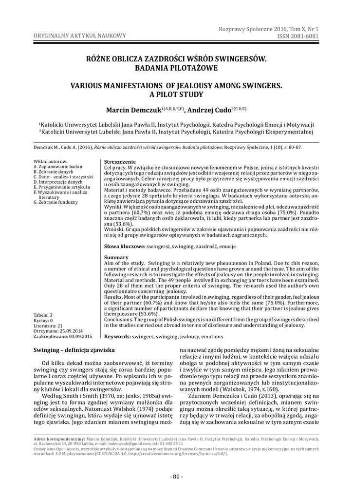 Rozprawy Społeczne 2016, Tom X, Nr 1 ISSN 2081-6081 ORYGINALNY ARTYKUŁ NAUKOWY RÓŻNE OBLICZA ZAZDROŚCI WŚRÓD SWINGERSÓW. BADANIA PILOTAŻOWE VARIOUS MANIFESTAIONS OF JEALOUSY AMONG SWINGERS. A PILOT STUDY Marcin Demczuk1(A,B,D,E,F), Andrzej Cudo2(C,D,E) 1 Katolicki Uniwersytet Lubelski Jana Pawła II, Instytut Psychologii, Katedra Psychologii Emocji i Motywacji Katolicki Uniwersytet Lubelski Jana Pawła II, Instytut Psychologii, Katedra Psychologii Eksperymentalnej 2 Demczuk M., Cudo A. (2016), Różne oblicza zazdrości wśród swingersów. Badania pilotażowe. Rozprawy Społeczne, 1 (10), s. 80-87. Wkład autorów: A. Zaplanowanie badań B. Zebranie danych C. Dane – analiza i statystyki D. Interpretacja danych E. Przygotowanie artykułu F. Wyszukiwanie i analiza literatury G. Zebranie funduszy Streszczenie Cel pracy. W związku ze stosunkowo nowym fenomenem w Polsce, jedną z istotnych kwestii dotyczących tego rodzaju związków jest odbiór wzajemnej relacji przez parterów w niego zaangażowanych. Celem niniejszej pracy było przyjrzenie się występowaniu emocji zazdrości u osób zaangażowanych w swinging. Materiał i metody badawcze. Przebadano 49 osób zaangażowanych w wymianę partnerów, z czego jedynie 28 spełniało kryteria swingingu. W badaniach wykorzystano autorską ankietę zawierającą pytania dotyczące odczuwania zazdrości. Wyniki. Większość osób zaangażowanych w swinging, niezależnie od płci, odczuwa zazdrość o partnera (60,7%) oraz wie, iż podobną emocję odczuwa druga osoba (75,0%). Ponadto znaczna część badanych osób deklarowała, iż lubi, kiedy partnerka lub partner jest zazdrosna (53,6%). Wnioski. Grupa polskich swingersów w zakresie ujawniania i pojmowania zazdrości nie różni się od grupy swingersów opisywanych w badaniach zagranicznych. Słowa kluczowe: swingersi, swinging, zazdrość, emocje Tabele: 3 Ryciny: 0 Literatura: 21 Otrzymano: 25.09.2014 Zaakceptowano: 03.09.2015 Summary Aim of the study. Swinging is a relatively new phenomenon in Poland. Due to this reason, a number of ethical and psychological questions have grown around the issue. The aim of the following research is to investigate the effects of jealousy on the people involved in swinging. Material and methods. The 49 people involved in exchanging partners have been examined. Only 28 of them met the proper criteria of swinging. The research used the author’s own questionnaire concerning jealousy. Results. Most of the participants involved in swinging, regardless of their gender, feel jealous of their partner (60.7%) and know that he/she also feels the same (75.0%). Furthermore, a significant number of participants declare that knowing that their partner is jealous gives them pleasure (53.6%). Conclusions. The group of Polish swingers is no different from the group of swingers described in the studies carried out abroad in terms of disclosure and understanding of jealousy. Keywords: swingers, swinging, jealousy, emotions Swinging – definicja zjawiska Od kilku dekad można zaobserwować, iż terminy swinging czy swingers stają się coraz bardziej popularne i coraz częściej używane. Po wpisaniu ich w popularne wyszukiwarki internetowe pojawiają się strony klubów i lokali dla swingersów. Według Smith i Smith (1970, za: Jenks, 1985a) swinging jest to forma zgodnej wymiany małżonka dla celów seksualnych. Natomiast Walshok (1974) podaje definicję swingingu, która wydaje się ujmować istotę tego zjawiska. Jego zdaniem mianem swingingu moż- na nazwać zgodę pomiędzy mężem i żoną na seksualne relacje z innymi ludźmi, w kontekście wzięcia udziału obojga w podobnej aktywności w tym samym czasie i zwykle w tym samym miejscu. Jego zdaniem prowadzenie tego typu relacji ma przede wszystkim znamiona pewnych zorganizowanych lub zinstytucjonalizowanych modeli (Walshok, 1974, s.160). Zdaniem Demczuka i Cudo (2013), opierając się na przytoczonych wcześniej definicjach, mianem swingingu można określić taką sytuację, w której partnerzy będący w trwałej relacji, za obopólną zgodą, angażują się w zachowania seksualne w tym samym czasie Adres korespondencyjny: Marcin Demczuk, Katolicki Uniwersytet Lubelski Jana Pawła II, Instytut Psychologii, Katedra Psychologii Emocji i Motywacji, al. Racławickie 14, 20-950 Lublin, e-mail: [email protected], tel.: 81 445 35 11 Czasopismo Open Access, wszystkie artykuły udostępniane są na mocy licencji Creative Commons Uznanie autorstwa-użycie niekomercyjne-na tych samych warunkach 4.0 Międzynarodowe (CC BY-NC-SA 4.0, http://creativecommons.org/licenses/by-nc-sa/4.0/). - 80 - Rozprawy Społeczne 2016, Tom X, Nr 1 Różne oblicza zazdrości wśród swingersów... i w tym samym miejscu z innymi osobami będącymi obecnie w związkach lub w stanie wolnym. Ich zdaniem zachowania te są planowane i mogą mieć charakter orgiastyczny lub też formę stosunków odbywających się w otoczeniu bardziej intymnym. Jednakże z powodu niewielkiej ilości badań oraz niespójności w otrzymanych wynikach trudno jest stworzyć jednolitą definicję i pełny obraz funkcjonowania swingersów (Jenks, 1985b; Demczuk i Cudo, 2013). Mimo uprzedzeń społecznych dotyczących tej grupy osób, w szczególności w kulturze zachodniej, (Jenks, 1985b) badania nie potwierdzają wzmożonego nasilenia zachowań dewiacyjnych w ich ogólnym funkcjonowaniu społecznym (Denfeld, 1974; Viwatpanich, 2010). Natomiast taki negatywny obraz społeczny swingersów może wynikać bardziej z liberalnych poglądów tej społeczności dotyczących funkcjonowania w sferze seksualnej (zob. Bergstand, Williams, 2000). Należy zwrócić uwagę, iż choć na początku zjawisko to omawiane było wyłącznie na gruncie szeroko rozumianej kultury zachodniej, obecnie wskazuje się na znaczący wzrost jego intensywności w kulturze wschodniej (Viwatpanich, 2010). Swinging a jakość związku W kulturze tak zachodniej, jak również wschodniej relacj