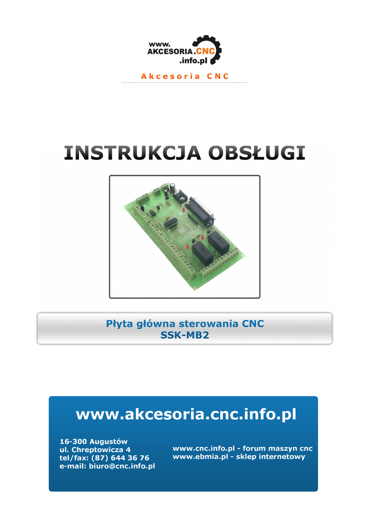 1. Wskazówki bezpieczeństwa Przed pierwszym uruchomieniem urządzenia, prosimy o uważne przeczytanie niniejszej instrukcji obsługi. UWAGA!!! Każda maszyna jest potencjalnie niebezpieczna. Obrabiarki sterowane numerycznie mogą stwarzać większe zagrożenie od manualnych. Poruszające się elementy systemu narażają operatora na niebezpieczeństwo. Unikaj z nimi kontaktu oraz zachowaj bezpieczny odstęp kiedy podane jest napięcie zasilania. To użytkownik odpowiedzialny jest za finalną aplikację. Powinien On zadbać o to, aby maszyna była zrealizowana zgodnie z obowiązującymi normami. Moduły przeznaczone do zabudowy mogą być stosowane i obsługiwane tylko wtedy, gdy zostaną umieszczone w odpowiedniej osłonie. W miejscach, w których wystąpienie błędu w systemie automatyki może być przyczyną okaleczenia osób, uszkodzenia urządzeń lub spowodowania wysokich strat finansowych muszą być zastosowane dodatkowe środki ostrożności. Zagwarantują one bezpieczne działanie obrabiarki w przypadku wystąpienia uszkodzenia lub zakłócenia (np. niezależne wyłączniki krańcowe, blokady mechaniczne itd.). Producent oraz dystrybutorzy nie ponoszą odpowiedzialności za straty finansowe oraz doznane obrażenia wynikające z niewłaściwego i niezgodnego z przeznaczeniem eksploatowaniem urządzenia. 2. Opis płyty głównej SSK-MB2 Płyta główna SSK-MB2 zaprojektowana została w celu podłączenia do 4 sterowników silników krokowych (serw) do komputera PC wyposażonego w równoległy port LPT. Rozdziela ona poszczególne sygnały z portu na złącza śrubowe ARK. Dodatkowym atutem urządzania jest możliwość podłączenia peryferii typu: krańcówki, przycisk awaryjnego zatrzymania itp. W module zainstalowano dwa niezależne przekaźniki służące do programowego włączania/ wyłączania np. wrzeciona czy chłodziwa. Przy zastosowaniu dodatkowych modułów możliwa jest regulacja prędkości wrzeciona (Spindle Control) lub regulacja temperatury drutu (Kanthall). Do wykonania połączeń z urządzeniami zewnętrznymi wykorzystano złącza typu ARK 1,5 mm² o maksymalnym napięciu 250V i prądzie przewodzenia 16A. Elementy elektroniczne narażone na wzrost temperatury struktury wewnętrznej umieszczone są na radiatorach aluminiowych. Komponenty, z których wykonany została płyta główna SSK-MB2 spełniają dyrektywę RoHS Unii Europejskiej (Restriction of use of certain Hazardous Substances) dotyczącą ochrony środowiska naturalnego. Urządzenie wykonuje się w technologii bezołowiowej. Spoiwo użyte do montażu urządzenia zawiera 99% cyny i 1% miedzi. Nasza firma wykonuje na zamówienie uniwersalne sterowniki numeryczne (USN) na bazie płyty SSK-MB2 i dowolną ilość osi. Sterowniki są kompletne i gotowe do podłączenia, zamknięte w obudowy posiadają wyłącznik awaryjnego zatrzymania. Każdy sterownik wykonujemy indywidualnie według wymagań klienta. USN-y współpracują z programami generującymi sygnały za pośrednictwem portu LPT np. Mach2/Mach3, KCam, Master5, TurboCNC, Step2CNC i wielu innych. Możemy również wykonać sterowniki komunikujące się z komputerem za pomocą portu USB, Ethernet lub oparte o sterownik PLC. Zapraszamy do kontaktu z naszym działem sterowania numerycznego [email protected] , tel: +(48) 87 644 36 76. Specjaliści pomogą Państwu dobrać sterowanie odpowiednie do projektowanej maszyny. Zalety płyty głównej SSK-MB2: • niski koszt, • małe wymiary, • zasilanie 12VDC, • sterowanie do 4 osi (4 silniki, lub serwa), 2 AKCESORIA CNC – WWW.CNC.INFO.PL • • • • • • • • • wbudowany zasilacz 5VDC do sterowników, 2 niezależne wyjścia przekaźnikowe ( przekaźniki 230VAC/8A), diody sygnalizujące stan przekaźników oraz obecność zasilania, możliwość podłączenia krańcówek bazujących maszynę, wejście dla przycisku awaryjnego zatrzymania E-STOP, wejście dla krańcówek limitowych, przy zastosowaniu dodatkowego modułu “SpindleControl” możliwa jest kontrola prędkości obrotowej wrzeciona (sterowanie wejściem napięciowym falownika), przy zastosowaniu dodatkowego modułu “Kanthall” możliwa jest regulacja tempertatury drutu oporowego w ploterach termicznych, wyświetlanie prędkości wrzeciona w programie Mach (dla wrzecion z wyjściem impulsowym czytnika prędkości). 3. Dane techniczne Parametry elektryczne Parametr Wartość Jednostka Maksymalne napięcie zasilania 12 [V] DC Maksymalny pobór prądu 500 [mA] Napięcie wyjściowe 5 [V] DC Maksymalne obciążenie pojedynczej sekcji przekaźnika 8 [A] Parametry eksploatacyjne Chłodzenie Pasywne lub wymuszony obieg Miejsce Środowisko Temperatura Wilgotność Unikać kurzu, oleju i gazów powodujących korozję otoczenia 0°C - 50°C składowania 0°C - 50°C 30% - 75% RH (bez kondensacji) Parametry mechaniczne Wymiary [mm] Długość 178 Szerokość 86 (z gniazdem LPT) Wysokość Waga [kg] 19 (zależna od zastosowanych przekaźników i gniazda LPT) ~ 0,200 AKCESORIA CNC – WWW.CNC.INFO.PL 3 Wymiary z tabeli Parametry mechaniczne zaznaczono na rysunku poniżej: Długość Wysokość 178 172 19 3 3 LPT P6 86 80 D4 P4 61 D2 P5 Szerokość P1 D1 26 P3 P2 19,5 6 x Ø 3,2 65,5 Widok z góry Widok z boku 4. Budowa (opis złącz) płyty głównej SSK-MB2 Piny złącza zasilającego P1 Sygnał Funkcja +12 Zasilanie DC, do +12 V -12 Masa zasilania DC Piny złącza sterującego P2 Płyta główna umożliwia podłączenie 4 sterowników silników krokowych (osie X,Y, Z, A). Poniżej opis jednej z nich. 4 Sygnał Funkcja + 5V Wyjście zasilania +5VDC CLK Wyjście sygnału kroku osi Y DIR Wyjście sygnału kierunku osi Y ENA Wyjście sygnału zezwolenia na pracę sterownika GND Masa zasilania 5V i sygnałów sterujących AKCESORIA CNC – WWW.CNC.INFO.PL Piny złącza sterującego P3 Sygnał Funkcja ESTOP Wejście przycisku awaryjnego zatrzymania maszyny HOME X Wejście krańcówki bazującej osi X HOME Y Wejście krańcówki bazującej os