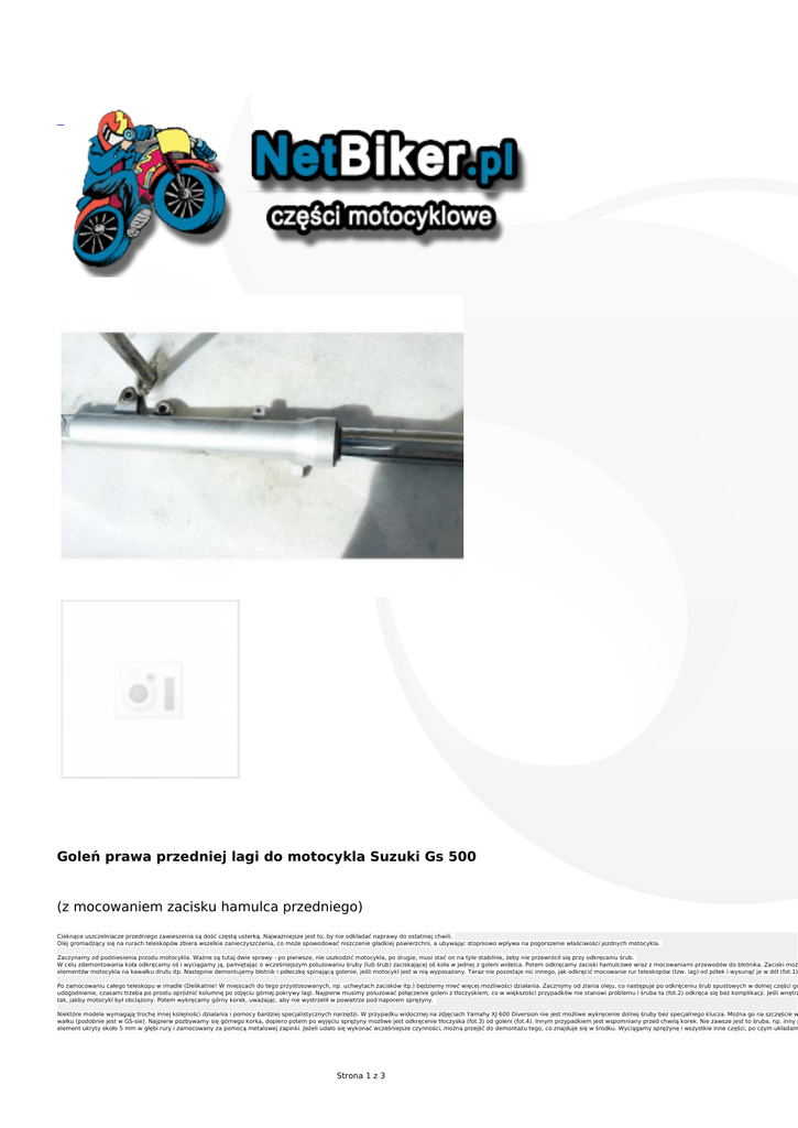 Goleń prawa przedniej lagi do motocykla Suzuki Gs 500 (z mocowaniem zacisku hamulca przedniego) Cieknące uszczelniacze przedniego zawieszenia są dość częstą usterką. Najważniejsze jest to, by nie odkładać naprawy do ostatniej chwili. Olej gromadzący się na rurach teleskopów zbiera wszelkie zanieczyszczenia, co może spowodować niszczenie gładkiej powierzchni, a ubywając stopniowo wpływa na pogorszenie właściwości jezdnych motocykla. Zaczynamy od podniesienia przodu motocykla. Ważne są tutaj dwie sprawy - po pierwsze, nie uszkodzić motocykla, po drugie, musi stać on na tyle stabilnie, żeby nie przewrócił się przy odkręcaniu śrub. W celu zdemontowania koła odkręcamy oś i wyciągamy ją, pamiętając o wcześniejszym poluzowaniu śruby (lub śrub) zaciskającej oś koła w jednej z goleni widelca. Potem odkręcamy zaciski hamulcowe wraz z mocowaniami przewodów do błotnika. Zaciski moż elementów motocykla na kawałku drutu itp. Następnie demontujemy błotnik i półeczkę spinającą golenie, jeśli motocykl jest w nią wyposażony. Teraz nie pozostaje nic innego, jak odkręcić mocowanie rur teleskopów (tzw. lag) od półek i wysunąć je w dół (fot.1) Po zamocowaniu całego teleskopu w imadle (Delikatnie! W miejscach do tego przystosowanych, np. uchwytach zacisków itp.) będziemy mieć więcej możliwości działania. Zacznijmy od zlania oleju, co następuje po odkręceniu śrub spustowych w dolnej części go udogodnienie, czasami trzeba po prostu opróżnić kolumnę po zdjęciu górnej pokrywy lagi. Najpierw musimy poluzować połączenie goleni z tłoczyskiem, co w większości przypadków nie stanowi problemu i śruba ta (fot.2) odkręca się bez komplikacji. Jeśli wnętrz tak, jakby motocykl był obciążony. Potem wykręcamy górny korek, uważając, aby nie wystrzelił w powietrze pod naporem sprężyny. Niektóre modele wymagają trochę innej kolejności działania i pomocy bardziej specjalistycznych narzędzi. W przypadku widocznej na zdjęciach Yamahy XJ 600 Diversion nie jest możliwe wykręcenie dolnej śruby bez specjalnego klucza. Można go na szczęście w wałku (podobnie jest w GS-sie). Najpierw pozbywamy się górnego korka, dopiero potem po wyjęciu sprężyny możliwe jest odkręcenie tłoczyska (fot.3) od goleni (fot.4). Innym przypadkiem jest wspomniany przed chwilą korek. Nie zawsze jest to śruba, np. inny p element ukryty około 5 mm w głębi rury i zamocowany za pomocą metalowej zapinki. Jeżeli udało się wykonać wcześniejsze czynności, można przejść do demontażu tego, co znajduje się w środku. Wyciągamy sprężynę i wszystkie inne części, po czym układam Strona 1 z 3 jest to bardzo proste rozwiązanie, nieraz zaś układ zawiera regulację tłumienia dobicia, odbicia, napięcia wstępnego, pompowanie powietrzem lub elementy anti-dive. Może brzmi to skomplikowanie, ale wymaga po prostu skupienia i utrzymania porządku na sta Większość czynności wykonana, pozostaje tylko wyjęcie osłonki przeciwkurzowej i zapinki zabezpieczającej uszczelniacz. Teraz łapiemy za lagę i kilkoma zdecydowanymi ruchami rozłączamy obie części. Nie można przesadzić z siłą, aby nie zniszczyć pierścieni podkładka, pierścień prowadzący górny i pierścień prowadzący dolny. Gdyby okazało się, że pierścień górny został w goleni, to mamy problem. Na pewno nie uda się tego zmontować z powrotem, gdyż pierścień dolny nie przejdzie już w drugą stronę. W takim w konstrukcji (trzeba się bowiem do niego dostać od dołu goleni). W starszych motocyklach pierścienie prowadzące mogą być powycierane, co objawia się luzem pomiędzy lagą i golenią. Warto wtedy pomyśleć o wymianie. Podobnie ma się sprawa osłonek przeci skorodowane, należy wymienić na nowe. Zanim zabierzemy się do montażu, trzeba wszystko dokładnie umyć benzyną ekstrakcyjną, gdyż stary olej zawiera wiele zanieczyszczeń i opiłków. Obejrzyjmy też rury teleskopów. Jeśli mają rysy, wżery czy inne nierówności, należy je wygładzić bardzo drobnym on gładkiej warstwy lagi, a jednocześnie zlikwiduje wszelkie wystające mikroskopijne nierówności, które powodowały niszczenie uszczelniaczy. Składanie musi się odbywać w odwrotnej kolejności. Najpierw wkładamy lagę w goleń (fot.5), pamiętając, czy nie było żadnych elementów między tymi częściami - jeśli tak, muszą się one tam znaleźć. Potem wkładamy górny pierścień prowadzący, następnie po Najlepiej użyć do tego dobrany wcześniej pierścień o odpowiedniej średnicy. W następnej kolejności wsuwamy uszczelniacz (fot.7), korzystając z tego samego narzędzia, a następnie zawleczkę. Na koniec wciskamy osłonkę przeciwkurzową. Jeśli nie chce ona we Pamiętajmy jednak, że są to delikatne części i wymagają rozwagi w dobieraniu narzędzi. Następnie wkładamy wszystkie elementy do lagi, pamiętając o dokładnym ułożeniu podkładki i tulei dystansowej (fot.8). Potem skręcamy dolną śrubę, nie zapominając o n poczciwej XJ przed włożeniem sprężyny używamy "narzędzia specjalnego" do mocnego dokręcenia śruby. Na koniec wlewamy (fot.9) specjalny olej do zawieszeń motocyklowych w ilości zalecanej przez producenta. Wiele osób próbuje ilością oleju nadrobić mięk i "kołkowatości" podwozia, więc nie zalecam tego typu udoskonaleń. Można ewentualnie poeksperymentować z gęstością oleju, chcąc zmienić charakterystykę zawieszenia. Po wlaniu oleju zakręcamy górną nakrętkę (fot.10), uważając, by zrobić to prosto. Nie je sprężynę. Montaż poskładanych teleskopów nie powinien sprawić problemu. Po wstawieniu ich w półki w jednym poziomie trzeba je przykręcić. Dalej postępujemy tak samo jak przy rozkładaniu. Jeżeli motocykl ma półeczkę łączącą golenie, trzeba na chwilę zamontować oś koła, by poskręcać wszystko w jednej linii. Po złożeniu wszystkich elementów stawiamy motocykl na zie