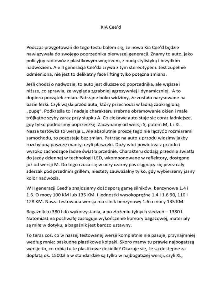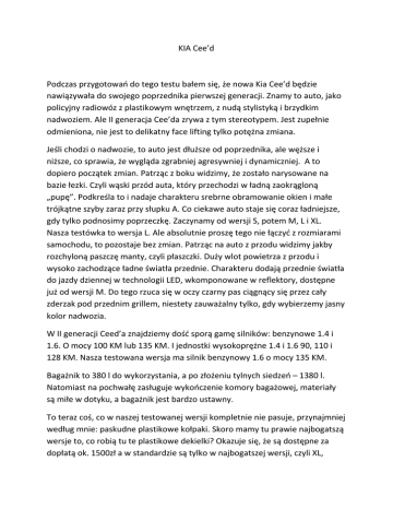 KIA Cee’d Podczas przygotowań do tego testu bałem się, że nowa Kia Cee’d będzie nawiązywała do swojego poprzednika pierwszej generacji. Znamy to auto, jako policyjny radiowóz z plastikowym wnętrzem, z nudą stylistyką i brzydkim nadwoziem. Ale II generacja Cee’da zrywa z tym stereotypem. Jest zupełnie odmieniona, nie jest to delikatny face lifting tylko potężna zmiana. Jeśli chodzi o nadwozie, to auto jest dłuższe od poprzednika, ale węższe i niższe, co sprawia, że wygląda zgrabniej agresywniej i dynamiczniej. A to dopiero początek zmian. Patrząc z boku widzimy, że zostało narysowane na bazie łezki. Czyli wąski przód auta, który przechodzi w ładną zaokrągloną „pupę”. Podkreśla to i nadaje charakteru srebrne obramowanie okien i małe trójkątne szyby zaraz przy słupku A. Co ciekawe auto staje się coraz ładniejsze, gdy tylko podnosimy poprzeczkę. Zaczynamy od wersji S, potem M, L i XL. Nasza testówka to wersja L. Ale absolutnie proszę tego nie łączyć z rozmiarami samochodu, to pozostaje bez zmian. Patrząc na auto z przodu widzimy jakby rozchyloną paszczę manty, czyli płaszczki. Duży wlot powietrza z przodu i wysoko zachodzące ładne światła przednie. Charakteru dodają przednie światła do jazdy dziennej w technologii LED, wkomponowane w reflektory, dostępne już od wersji M. Do tego rzuca się w oczy czarny pas ciągnący się przez cały zderzak pod przednim grillem, niestety zauważalny tylko, gdy wybierzemy jasny kolor nadwozia. W II generacji Ceed’a znajdziemy dość sporą gamę silników: benzynowe 1.4 i 1.6. O mocy 100 KM lub 135 KM. I jednostki wysokoprężne 1.4 i 1.6 90, 110 i 128 KM. Nasza testowana wersja ma silnik benzynowy 1.6 o mocy 135 KM. Bagażnik to 380 l do wykorzystania, a po złożeniu tylnych siedzeń – 1380 l. Natomiast na pochwałę zasługuje wykończenie komory bagażowej, materiały są miłe w dotyku, a bagażnik jest bardzo ustawny. To teraz coś, co w naszej testowanej wersji kompletnie nie pasuje, przynajmniej według mnie: paskudne plastikowe kołpaki. Skoro mamy tu prawie najbogatszą wersje to, co robią tu te plastikowe dekielki? Okazuje się, że są dostępne za dopłatą ok. 1500zł a w standardzie są tylko w najbogatszej wersji, czyli XL, szkoda. Ale pomijając te kołpaki to auto prezentuje się naprawdę świetnie. Zdecydowanie lepiej niż swój poprzednik, który był brzydki. Ta generacja pokazuje, że projektanci KIA doskonale wiedzą, co podoba się w Europie i wiedzą jak podbijać ten rynek i trzeba im przyznać, że robią to dobrze. Byłem zaskoczony, gdy wsiadłem do cee’da po raz pierwszy. Mamy tu jasne, beżowe wykończenie wnętrza połączone z plastikiem w kolorze piano, czyli czarny na wysoki połysk. Wygląda rewelacyjnie. Nie jest tandetne i przeładowane, tylko eleganckie. Głęboko zachodząca deska rozdzielcza sprawia, że czujemy się jakby to było zdecydowanie większe auto, a nie segment C, czyli kompaktowe auto rodzinne. To typowo rodzinny samochód, każdy znajdzie tu miejsce na swoje drobiazgi, nie ma problemu ze schowaniem gazety, butelki z wodą, telefonu, kluczy i innych drobiazgów na wszystko można znaleźć miejsce. Do tego mamy tu dość spory schowek po stronie pasażera, podświetlany i klimatyzowany, w podłokietniku też możemy coś schować, boczne kieszenie w drzwiach są wyjątkowo pakowne, ale jeszcze pod konsolą centralną jest miejsce na drobiazgi. I miejsca na kubki na tunelu centralny, sporo tego! Trochę przeładowana wydaje się kierownica, z każdej strony mamy przyciski funkcyjne do komputera, telefonu radia, tempomatu, obsługi głosowej trochę tego za dużo. To, czym zaskoczyła mnie KIA Ceed to to, że panel centralny skierowany jest w stronę kierowcy, bardzo mi się to podoba i bardzo to lubię, bo to ja tu jestem kierownikiem. Obsługa wszystkiego dzięki temu jest prosta. W testowanej przez nas wersji jest kolorowy ekran dotykowy o przekątnej 7 cali zintegrowany z kamerą cofania niestety jest to dodatkowa wersja, za którą musimy dopłacić. Ale co warte podkreślenia to fotele, bardzo wygodne, mające sporo możliwości regulacji do tego ruchoma kolumna kierownicy, no można znaleźć odpowiednią wygodną pozycję. A teraz pora na minus: w boczkach drzwi mamy czarne plastikowe błyszczące elementy. I chyba, jakość tego plastiku sprawia, że otwierając lub zamykając drzwi słyszymy jak ten plastik trzeszczy. Nasza testowa wersja wyposażona jest w progresywne wspomaganie kierownicy możemy wybrać jeden z 3 trybów, komfort, normalny i sportowy. Komfortowy bardzo przydaje się podczas manewrowania na parkingu. I to, co od razu czujemy to duży komfort, zawieszenie zaskakująco dobrze wybiera nierówności a samochód prowadzi się stabilnie, delikatnie i łagodnie sunie po asfalcie, duży plus. Kolejny plus to wyciszenie wnętrza, po pierwszej generacji nie spodziewałem się, że w dwójce będzie aż tak cicho. Jeździłem tym samochodem po autostradzie z prędkością 140km/h i było bardzo przyjemnie, nie trzeba mówić głośniej a do naszych uszu dobiega tylko szum powietrza i kół. Ale po tych plusach przyszedł czas na minus, czyli dynamika jazdy. Pod maską mamy 135KM i mam wrażenie albo one są nienapojone albo nienajedzone. Niestety silnik jest mało elastyczny. Auto bardzo ślamazarnie reaguje na wciśnięcie pedału gazu, wolno wkręca się na obroty i aby jeździć dynamicznie musimy często zmieniać biegi. Producent podaję, że od 0 do 100km/h Ceed rozpędzi się w 10 sekund, być może jest to prawda, ale ja tego nie czuje. Maksymalną moc uzyskamy przy 6300 obrotów na minutę a taka jazda nie należy do przyjemnych. Więc wracamy do spokojnej jazdy, płyniemy spokojnie i teraz widzimy, że to jest świat Ceeda. Nie rajdowa, dynamiczna jazda i zarzynanie tego silnika, tylko muskanie pedału gazu - to sprawia przyjemność temu autu i pasażerom. Producent zapowiada średnie spalanie na p