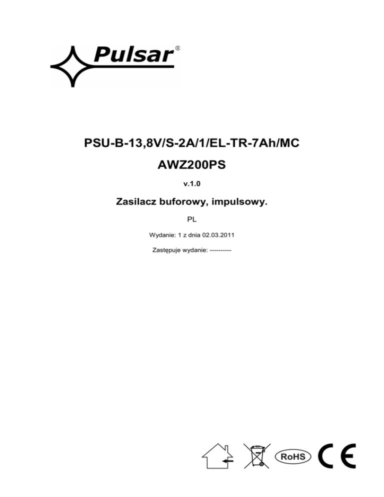 PSU-B-13,8V/S-2A/1/EL-TR-7Ah/MC AWZ200PS v.1.0 Zasilacz buforowy, impulsowy. PL Wydanie: 1 z dnia 02.03.2011 Zastępuje wydanie: ---------- Cechy zasilacza: • • • • bezprzerwowe zasilanie 13,8V DC kontrola ładowania i konserwacji akumulatora zabezpieczenie wyjścia BAT przed zwarciem i odwrotnym podłączeniem sygnalizacja optyczna LED • zabezpieczenia: • przeciwzwarciowe SCP • przeciążeniowe OLP • termiczne OHP • przepięciowe • antysabotażowe SPIS TREŚCI: 1. Opis techniczny. 1.1. Opis ogólny 1.2. Schemat blokowy 1.3. Opis elementów i złącz zasilacza 1.4. Parametry techniczne 2. Instalacja. 2.1. Wymagania 2.2. Procedura instalacji 3. Sygnalizacja pracy zasilacza. 3.1. Sygnalizacja optyczna 3.2. Wyjście techniczne 4. Obsługa oraz eksploatacja. 4.1. Przeciążenie lub zwarcie 4.2. Praca bateryjna 4.3. Konserwacja 1. Opis techniczny. 1.1. Opis ogólny. Zasilacz buforowy przeznaczony jest do nieprzerwanego zasilania urządzeń wymagających stabilizowanego napięcia 12V/DC (+/-15%). Zasilacz dostarcza napięcia U= 11,0V÷13,8 V DC o wydajności prądowej całkowitej Imax=2,0A. W przypadku zaniku napięcia sieciowego następuje natychmiastowe przełączenie na zasilanie akumulatorowe. Zasilacz umieszczony jest w obudowie metalowej (kolor RAL 9003) z miejscem na akumulator 7Ah/12V. Obudowa wyposażona jest w mikroprzełącznik sygnalizujący otwarcie drzwiczek (czołówki). 2 1.2. Schemat blokowy (rys.1). Rys.1. Schemat blokowy zasilacza. 1.3. Opis elementów i złącz zasilacza (tab.1, tab.2, rys.2). Tabela 1. Element [Rys. 2] [1] [2] [3] [4] [5] [6] [7] [8] [9] Tabela 2. [5] ~AC~ +BAT -BAT +AUX -AUX Opis P1 potencjometr, regulacja napięcia wyjściowego F1 bezpiecznik w obwodzie akumulatora AC, LB, AUX sygnalizacja optyczna pracy zasilacza na PCB modułu AC, AUX złącze wyjścia sygnalizacji optycznej na przednim panelu zasilacza WYJŚCIA zasilacza złącze (Tab.2) TAMPER, styk ochrony antysabotażowej (NC) F2 bezpiecznik w obwodzie zasilania (230V/AC) L-N złącze zasilania 230V/AC, Złącze ochrony PE BAT+/BAT-: wyjścia, konektory akumulatora +BAT = czerwony, - BAT = czarny Tab.1. Elementy zasilacza. Opis wyjść zasilacza Wejście zasilania AC Wyjście zasilania DC akumulatora (+BAT = czerwony, -BAT = czarny) Wyjście zasilania DC (+AUX = +U, -AUX = GND) Tab.2. Zaciski wyjściowe zasilacza. 3 Rys.2. Widok zasilacza. 4 1.4. Parametry techniczne: - parametry elektryczne (tab.3) - parametry mechaniczne (tab.4) - bezpieczeństwo użytkowania (tab.5) - parametry eksploatacyjne (tab.6) Parametry elektryczne (tab. 3). Napięcie zasilania Częstotliwość zasilania Moc zasilacza P Pobór prądu Napięcie wyjściowe Czas narastania, opadania i podtrzymania napięcia wyjściowego Zakres nastawy napięcia Zakres regulacji napięcia Napięcie tętnienia Prąd wyjściowy Pobór prądu przez układy zasilacza Prąd ładowania akumulatora Zabezpieczenie przed zwarciem SCP Zabezpieczenie przed przeciążeniem OLP Zabezpieczenie w obwodzie akumulatora SCP i odwrotna polaryzacja podłączenia Zabezpieczenie nadnapięciowe OVP Zabezpieczenie akumulatora przed nadmiernym rozładowaniem UVP Wyjścia techniczne: - TAMPER wyjście sygnalizujące otwarcie obudowy zasilacza Sygnalizacja optyczna: moduł zasilacza - AC dioda sygnalizująca stan zasilania AC - LB dioda sygnalizująca proces ładowania akumulatora - AUX dioda sygnalizująca stan zasilania DC na wyjściu zasilacza Sygnalizacja optyczna: panel przedni zasilacza - AC dioda sygnalizująca stan zasilania AC - AUX dioda sygnalizująca stan zasilania DC na wyjściu zasilacza Bezpiecznik F1 Bezpiecznik F2 230V/AC (-15%/+10%) 50Hz (47÷53Hz) 28W max. 0,25 A max. (3,5 A „zimny start”) 11,0V÷13,8Vdc – praca buforowa 10,0V÷13,8Vdc – praca bateryjna 12ms/30ms/20ms @ Izn., Uac = min. 11,5 V÷14,0 V ± 1% 30mV p-p max. 2,0 A max. 25 mA max. 500mA max. (@7Ah, U bat.=10,0V) (± 5%) 200% ÷ 250% mocy zasilacza - ograniczenie prądu i/lub uszkodzenie bezpiecznika topikowego w obwodzie akumulatora (wymaga wymiany wkładki topikowej) 110% ÷ 150% (@25ºC÷55ºC) mocy zasilacza ograniczenie prądu poprzez bezpiecznik powracalny PTC, ponowne uruchomienie ręczne (awaria wymaga odłączenia obwodu wyjściowego DC) 3A- ograniczenie prądu, bezpiecznik topikowy F2 (awaria wymaga wymiany wkładki topikowej) U>22V warystor, przywracane automatycznie brak - microswitch, styki NC (obudowa zamknięta), 0,5A@50V DC (max.) - czerwona, stan normalny: świeci światłem ciągłym, awaria: nie świeci - czerwona, świeci światłem o intensywności zależnej od prądu ładowania akumulatora - zielona, stan normalny świeci światłem ciągłym awaria: nie świeci - czerwona, stan normalny: świeci światłem ciągłym, awaria: nie świeci - zielona, stan normalny: świeci światłem ciągłym, awaria: nie świeci F 3A/250V T 315 mA/ 250V 5 Parametry mechaniczne (tab. 4). Wymiary obudowy 205 x 235 x 88 (WxHxD) [mm] (+/- 2) Mocowanie 175 x 203 x Φ6 x 4szt (WxH) Miejsce na akumulator 7Ah/12V (SLA) max. Waga netto/brutto 1,70 kg / 1,90 kg Kolor obudowy RAL 9003 Zamykanie Wkręt walcowy x 1 (z czoła) Złącza Zasilanie: Φ0,63-2,50 (AWG 22-10) Wyjścia : Ф0,41÷1,63 (AWG 26-14) Wyjścia akumulatora BAT: 6,3F-2,5, 30cm Wyjscie TAMPER: przewody, 30cm Uwagi Obudowa posiada dystans od podłoza montażowego w celu prowadzenia okablowania Bezpieczeństwo użytkowania (tab.5). Klasa ochronności PN-EN 60950-1:2004 Stopień ochrony PN-EN 60529: 2002 (U) Wytrzymałość elektryczna izolacji: - pomiędzy obwodem wejściowym (sieciowym) a obwodami wyjściowymi zasilacza (I/P-O/P) - pomiędzy obwodem wejściowym a obwodem ochronnym PE (I/P-FG) - pomiędzy obwodem wyjściowym a obwodem ochronnym PE (O/P-FG) Rezystancja izolacji: - pomiędzy obwodem wejściowym a wyjściowym lub ochronnym Parametry eksploatacyjne (tab.6). Temperatura pracy Temperatura składowania Wilgotność względna Wibracje w czasie pracy Udary w czasie pracy Nasłonecznienie bezpośre