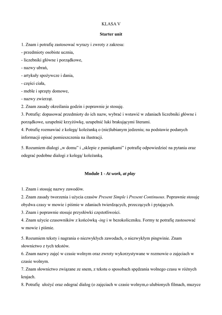 KLASA V Starter unit 1. Znam i potrafię zastosować wyrazy i zwroty z zakresu: - przedmioty osobiste ucznia, - liczebniki główne i porządkowe, - nazwy ubrań, - artykuły spożywcze i dania, - części ciała, - meble i sprzęty domowe, - nazwy zwierząt. 2. Znam zasady określania godzin i poprawnie je stosuję. 3. Potrafię: dopasować przedmioty do ich nazw, wybrać i wstawić w zdaniach liczebniki główne i porządkowe, uzupełnić krzyżówkę, uzupełnić luki brakującymi literami. 4. Potrafię rozmawiać z kolegą/ koleżanką o (nie)lubianym jedzeniu; na podstawie podanych informacji opisać pomieszczenia na ilustracji. 5. Rozumiem dialogi „w domu” i „sklepie z pamiątkami” i potrafię odpowiedzieć na pytania oraz odegrać podobne dialogi z kolegą/ koleżanką. Module 1 - At work, at play 1. Znam i stosuję nazwy zawodów. 2. Znam zasady tworzenia i użycia czasów Present Simple i Present Continuous. Poprawnie stosuję obydwa czasy w mowie i piśmie w zdaniach twierdzących, przeczących i pytających. 3. Znam i poprawnie stosuje przysłówki częstotliwości. 4. Znam użycie czasowników z końcówką -ing i w bezokoliczniku. Formy te potrafię zastosować w mowie i piśmie. 5. Rozumiem teksty i nagrania o niezwykłych zawodach, o niezwykłym pingwinie. Znam słownictwo z tych tekstów. 6. Znam nazwy zajęć w czasie wolnym oraz zwroty wykorzystywane w rozmowie o zajęciach w czasie wolnym. 7. Znam słownictwo związane ze snem, z tekstu o sposobach spędzania wolnego czasu w różnych krajach. 8. Potrafię ułożyć oraz odegrać dialog (o zajęciach w czasie wolnym,o ulubionych filmach, muzyce itp. o zaletach, wadach itp. różnych zawodów). Module 2 - Masters of Art 1. Znam i potrafię zastosować wyrazy i zwroty z zakresu: – nazwy mitycznych postaci i słownictwo z nimi związane, - części ciała zwierząt, - przymiotniki opisujące festiwal, wydarzenie itp., - słownictwo związane z rozrywką oraz nazwy gatunków filmowych. 2. Znam zasady tworzenia i użycia czasu Past Simple dla czasowników to be, have i can. 3. Potrafię poprawnie zastosować w formy tych czasowników w czasie Past Simple w zdaniach twierdzących, przeczących i pytających. 4. Rozumiem tekst i nagranie o mitycznych postaciach, dotyczące wyjścia do teatru oraz e-mail opisujący wizytę na festiwalu muzycznym. Znam słownictwo z tych tekstów. 5. Potrafię samodzielnie napisać e-mail do kolegi o tym, jak spędziłem ostatni weekend. 6. Potrafię samodzielnie i poprawnie rozmawiać z kolegą/ koleżanką o tym, jak spędziłem ostatni weekend. 7. Znam i potrafię poprawnie stosować zwroty stosowane w rozmowie na temat przyjęcia, słownictwo związane z artystami, nazwy instrumentów muzycznych oraz gatunków muzycznych. 8. Rozumiem dialog o przyjęciu u kolegi. Potrafię odegrać z kolegą/koleżanką sytuację opisaną w dialogu. Module 3 – Legends 1. Znam i potrafię zastosować wyrazy i zwroty: - związane z życiem w przeszłości, - opisujące wygląd zewnętrzny, - przymiotniki opisujące osobowość. 2. Znam zasady tworzenia i użycia czasu Past Simple dla czasowników regularnych (końcówka -ed). Potrafię poprawnie stosować w mowie i piśmie formy tych czasowników w czasie Past Simple w zdaniach twierdzących, przeczących i pytających. 3. Rozumiem tekst o Hua Mulan, o spotkaniu z potworem z Loch Ness znam słownictwo. 4.Na podstawie podanych informacji potrafię opisać postacie na ilustracji. 5.Potrafię rozmawiać z kolegą o wyglądzie swoich przyjaciół oraz o o przeszłości, o tym, co robił wczoraj po południu. 6. Potrafię samodzielnie napisać e-mail do kolegi/ koleżanki dotyczący wakacji, na których byłem. 7. Znam i poprawnie używam zwrotów stosowanych w rozmowie o filmie oraz słownictwo związane z życiem i dokonaniami sławnych ludzi. 8. Rozumiem dialog na temat niedawno obejrzanego filmu, potrafię napisać i odegrać podobny dialog z kolegą/ koleżanką. Module 4 - Let's party 1. Znam i potrafię zastosować wyrazy i zwroty: – związane ze świętami i uroczystościami, - przymiotniki opisujące samopoczucie, - słownictwo opisujące park rozrywki. 2. Znam czasowniki nieregularne w czasie Past Simple. 3. Potrafię poprawnie stosować formy tych czasowników w czasie Past Simple w zdaniach twierdzących, przeczących i pytających. 4. Potrafię swobodnie stosować w mowie i piśmie przyimki określające kierunek. 5. Rozumiem tekst o Mardi Gras, o wycieczce do Disneylandu. Znam słownictwo z tekstów. 6. Potrafię rozmawiać z kolegą/ koleżanką o zabawie, uroczystości, na której byłem, o swoich uczuciach w różnych sytuacjach. 7. Potrafię napisać e-mail do kolegi o wizycie w parku rozrywki 8. Znam i poprawnie stosuję zwroty stosowane w proponowaniu, wyrażaniu zgody na propozycję itp. oraz słownictwo związane z regatami. 9. Rozumiem rozmowę telefoniczną, w której rozmówcy umawiają się na spotkanie, znam słownictwo. Potrafię odegrać podobny dialog. Module 5 - Sports and chores. 1. Znam i potrafię zastosować wyrazy i zwroty: – prace domowe, - zajęcia w czasie wolnym, - słownictwo związane z jazdą na rowerze, - dyscypliny sportu. 2. Znam zasady użycia i poprawnie stosuję w mowie i piśmie czasownik have to w zdaniach twierdzących, przeczących, pytających. 3. Znam zasady użycia i poprawnie stosuję czasowniki must i mustn’t (dla wyrażenia konieczności, obowiązku i zakazu). 4. Znam zasady użycia i poprawnie stosuję czasowniki can, could i might (dla wyrażania pozwolenia i możliwości). 5. Rozumiem i znam słownictwo z tekstów o ekstremalnym prasowaniu i o bezpiecznej jeździe na rowerze, rolkach itp. 6. Potrafię powiedzieć, jakie czynności lubię wykonywać w czasie wolnym. 7. Na podstawie podanych informacji potrafię zaproponować koledze/ koleżance wspólne spędzenie czasu. 8. Potrafię napisać krótki tekst opisujący ulubioną dyscyplinę sportu. 9. Znam i poprawnie stosuję pytania o i