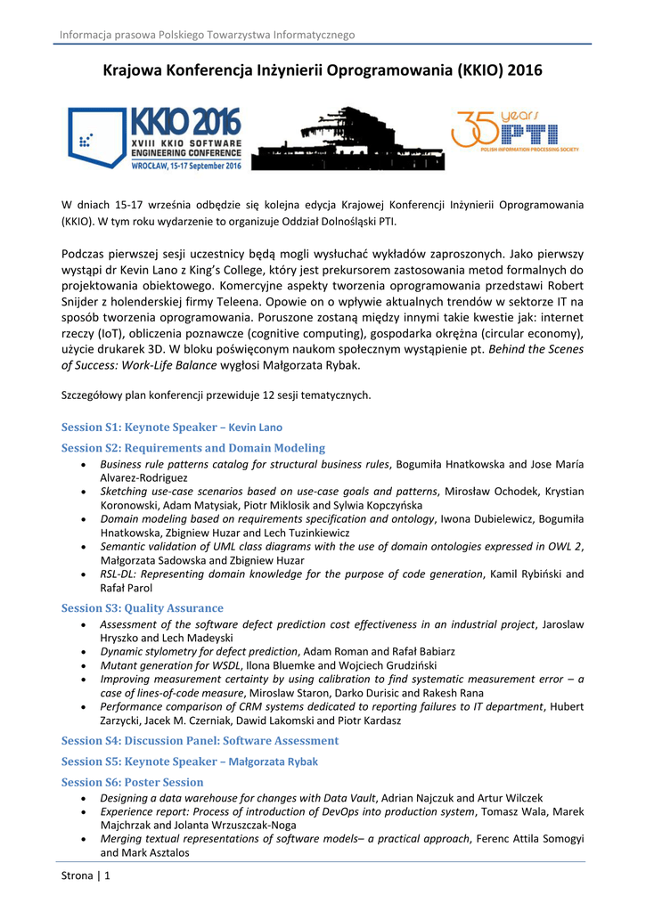 Informacja prasowa Polskiego Towarzystwa Informatycznego Krajowa Konferencja Inżynierii Oprogramowania (KKIO) 2016 W dniach 15-17 września odbędzie się kolejna edycja Krajowej Konferencji Inżynierii Oprogramowania (KKIO). W tym roku wydarzenie to organizuje Oddział Dolnośląski PTI. Podczas pierwszej sesji uczestnicy będą mogli wysłuchać wykładów zaproszonych. Jako pierwszy wystąpi dr Kevin Lano z King’s College, który jest prekursorem zastosowania metod formalnych do projektowania obiektowego. Komercyjne aspekty tworzenia oprogramowania przedstawi Robert Snijder z holenderskiej firmy Teleena. Opowie on o wpływie aktualnych trendów w sektorze IT na sposób tworzenia oprogramowania. Poruszone zostaną między innymi takie kwestie jak: internet rzeczy (IoT), obliczenia poznawcze (cognitive computing), gospodarka okrężna (circular economy), użycie drukarek 3D. W bloku poświęconym naukom społecznym wystąpienie pt. Behind the Scenes of Success: Work-Life Balance wygłosi Małgorzata Rybak. Szczegółowy plan konferencji przewiduje 12 sesji tematycznych. Session S1: Keynote Speaker – Kevin Lano Session S2: Requirements and Domain Modeling Business rule patterns catalog for structural business rules, Bogumiła Hnatkowska and Jose María Alvarez-Rodriguez Sketching use-case scenarios based on use-case goals and patterns, Mirosław Ochodek, Krystian Koronowski, Adam Matysiak, Piotr Miklosik and Sylwia Kopczyńska Domain modeling based on requirements specification and ontology, Iwona Dubielewicz, Bogumiła Hnatkowska, Zbigniew Huzar and Lech Tuzinkiewicz Semantic validation of UML class diagrams with the use of domain ontologies expressed in OWL 2, Małgorzata Sadowska and Zbigniew Huzar RSL-DL: Representing domain knowledge for the purpose of code generation, Kamil Rybiński and Rafał Parol Session S3: Quality Assurance Assessment of the software defect prediction cost effectiveness in an industrial project, Jaroslaw Hryszko and Lech Madeyski Dynamic stylometry for defect prediction, Adam Roman and Rafał Babiarz Mutant generation for WSDL, Ilona Bluemke and Wojciech Grudziński Improving measurement certainty by using calibration to find systematic measurement error – a case of lines-of-code measure, Miroslaw Staron, Darko Durisic and Rakesh Rana Performance comparison of CRM systems dedicated to reporting failures to IT department, Hubert Zarzycki, Jacek M. Czerniak, Dawid Lakomski and Piotr Kardasz Session S4: Discussion Panel: Software Assessment Session S5: Keynote Speaker – Małgorzata Rybak Session S6: Poster Session Designing a data warehouse for changes with Data Vault, Adrian Najczuk and Artur Wilczek Experience report: Process of introduction of DevOps into production system, Tomasz Wala, Marek Majchrzak and Jolanta Wrzuszczak-Noga Merging textual representations of software models– a practical approach, Ferenc Attila Somogyi and Mark Asztalos Strona | 1 Informacja prasowa Polskiego Towarzystwa Informatycznego Data flow analysis for code change propagation in Java programs, Grzegorz Kochański The use of web services architecture for engineering calculations based on the webMES platform, Piotr Jeruszka and Andrzej Grosser Toward agile data warehousing, Adrian Najczuk and Artur Wilczek Zbierane i przetwarzanie danych użytkowników do celów marketingowych, Aneta PoniszewskaMarańda and Jonatan Gostyński Zwinne szacowanie pracochłonności w projektach programistycznych – studium przypadków, Maciej Łabędzki, Patryk Promiński, Adam Rybicki, and Marcin Wolski Session S7: Case study – Semantyczna i syntaktyczna analiza treści w mediach społecznościowych Session S8: Keynote Speaker – Robert Snijder Session S9: Software Process Improvement Software engineering needs agile experimentation: A New "Practice and Supporting Tool, Lech Madeyski and Marcin Kawalerowicz An Industrial survey on business analysis problems and solutions, Piotr Marciniak and Aleksander Jarzębowicz Beyond software architecture knowledge management tools, Andrzej Zalewski A collaborative approach to developing a part-time PhD program in IT architecture with industry cooperation, Jan Werewka Session S10: Agile Transformations in IT Model of RUP processes maturity assessment in IT organizations, Włodzimierz Wysocki, Cezary Orłowski, Artur Ziółkowski and Grzegorz Bocewicz Trigger-based model to assess the readiness of IT organizations to agile transformation, Cezary Orłowski, Tomasz Deręgowski, Miłosz Kurzawski, Artur Ziółkowski and Bartosz Chrabski The reference model of tools adaptation in the perspective of technological agile transformation in IT organizations, Cezary Orłowski, Bartosz Chrabski, Artur Ziółkowski, Tomasz Deręgowski and Miłosz Kurzawski Building project and project team characteristic for creating hybrid management processes, Cezary Orłowski, Tomasz Deręgowski, Miłosz Kurzawski, Artur Ziółkowski and Bartosz Chrabski Session S11: System Architecture & Development Heterogeneous system architecture in education management software, Wiktor Zychla Service-Oriented Architecture for integration of information systems at data level, Aneta Poniszewska-Maranda and Patryk Wójcik Factors influencing user story estimations: an industrial interview and a conceptual model, Marek Majchrzak and Lech Madeyski Performance analysis of web application using MySQL, MongoDB and Redis databases, Krzysztof Miśtal, Ziemowit Nowak Session S12: Testing & Defect prediction Postgraduate Studies on software testing in Poland, Lucjan Stapp, Adam Roman and Maciej Chmielarz Software metrics in Boa large-scale software mining infrastructure: challenges and solutions, Agnieszka Patalas, Wojciech Cichowski, Michał Malinka, Wojciech Stępniak, Piotr Maćkowiak and Lech Madeyski How to improve linking between issues and commits for the sake of software defect prediction?, Tomasz Gawęda, Ewa Nestorowicz, Oskar Wołk, Lech Madeyski and Marek Majchrzak Defect prediction with