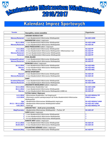 Termin Dyscyplina, nazwa zawodów AEROBIK REKREACYJNY Marzec/Kwiecień - I rzut Akademickich Mistrzostw Wielkopolski BADMINTON kobiet i mężczyzn 26.11.2016 - I rzut Akademickich Mistrzostw Wielkopolski Marzec/Kwiecień - II rzut Akademickich Mistrzostw Wielkopolski BIEGI PRZEŁAJOWE kobiet i mężczyzn 9.11.2016 - I rzut Akademickich Mistrzostw Wielkopolski 19.11.2016 - II rzut Akademickich Mistrzostw Wielkopolski i Mistrzostwa I Lat Marzec/Kwiecień - III rzut Akademickich Mistrzostw Wielkopolski Kwiecień - IV rzut Akademickich Mistrzostw Wielkopolski POOL BILARD Listopad/Grudzień - I rzut Akademickich Mistrzostw Wielkopolski Marzec/Kwiecień - II rzut Akademickich Mistrzostw Wielkopolski BOWLING kobiet i mężczyzn 26.11.2016 - I rzut Akademickich Mistrzostw Wielkopolski Marzec - II rzut Akademickich Mistrzostw Wielkopolski Maj - Puchar Rektora WSL BRYDŻ SPORTOWY Styczeń - I rzut Akademickich Mistrzostw Wielkopolski Marzec/Kwiecień - II rzut Akademickich Mistrzostw Wielkopolski DART Grudzień/Styczeń - I rzut Akademickich Mistrzostw Wielkopolski Marzec/Kwiecień - II rzut Akademickich Mistrzostw Wielkopolski ERGOMETR WIOŚLARSKI kobiet i mężczyzn 19.11.2016 - Mistrzostwa Studentów I Lat 30.11.2016 - I rzut Akademickich Mistrzostw Wielkopolski Marzec - II rzut Akademickich Mistrzostw Wielkopolski (1000 m) FUTSAL Kobiet i Mężczyzn 6.11.2016 - Mistrzostwa Studentów I Lat (mężczyzn) 3.12.2016 - Eliminacje uczelni zamiejscowych do finału Akademickich Mistrzostw Wielkopolski Liga - Akademickie Mistrzostwa Wielkopolski mężczyzn 24.11. i 30.11.2016 - Akademickie Mistrzostwa Wielkopolski kobiet 6.01.2017 - Finał Ligi JEŹDZIECTWO – skoki przez przeszkody Maj/Czerwiec - Akademickie Mistrzostwa Wielkopolski – Puchar UP JUDO kobiet i mężczyzn ? - I rzut Akademickich Mistrzostw Wielkopolski ? - II rzut Akademickich Mistrzostw Wielkopolski ? - III rzut Akademickich Mistrzostw Wielkopolski KARATE WKF kobiet i mężczyzn 27.11.2016 - I rzut Akademickich Mistrzostw Wielkopolski 26.03.2017 - II rzut Akademickich Mistrzostw Wielkopolski KOLARSTWO GÓRSKIE kobiet i mężczyzn Kwiecień/Maj - I rzut Akademickich Mistrzostw Wielkopolski Organizator KU AZS UAM KU AZS UAM KU AZS UE KU AZS PP KU AZS PP KU AZS PP KU AZS PP KU AZS PP KU AZS PP KU AZS WSL KU AZS WSL KU AZS WSL KU AZS UE KU AZS UE KU AZS UE KU AZS UAM KU AZS UAM KU AZS UP KU AZS UP KU AZS WSHiU/ PP PWSZ Leszno KU AZS WSHiU/ UAM KU AZS UP/ UAM KU AZS WSHiU/ PP KU AZS UP ? ? ? KU AZS UE KU AZS UE KU AZS PP 19.11.2016 Liga Liga Luty/ Marzec 19.11.2016 Liga Marzec Liga 26.10.2016 Kwiecień/Maj KOSZYKÓWKA KOBIET - Mistrzostwa studentów I Lat - I runda Akademickich Mistrzostw Wielkopolski - II runda Akademickich Mistrzostw Wielkopolski - Eliminacje Uczelni zamiejscowych KOSZYKÓWKA MĘŻCZYZN - Mistrzostwa Studentów I Lat - I runda Akademickich Mistrzostw Wielkopolski - Eliminacje uczelni zamiejscowych do Półfinału AMP - II runda Akademickich Mistrzostw Wielkopolski LEKKA ATLETYKA kobiet i mężczyzn - I rzut Akademickich Mistrzostw Wielkopolski - stadion - II rzut Akademickich Mistrzostw Wielkopolski - stadion i Mistrzostwa I Lat OŚ AZS OŚ AZS OŚ AZS PWSZ Leszno OŚ AZS OŚ AZS PWSZ Leszno OŚ AZS KU AZS PP KU AZS PP NARCIARSTWO ALPEJSKIE i SNOWBOARD kobiet i mężczyzn Luty - Akademickie Mistrzostwa Wielkopolski w narciarstwie Luty - Akademickie Mistrzostwa Wielkopolski w snowboardzie PIŁKA NOŻNA Liga - Akademickie Mistrzostwa Wielkopolski mężczyzn Marzec/Kwiecień - Akademickie Mistrzostwa Wielkopolski kobiet PIŁKA RĘCZNA KOBIET I MĘŻCZYZN Liga - Akademickie Mistrzostwa Wielkopolski w piłce ręcznej kobiet Liga - Akademickie Mistrzostwa Wielkopolski w piłce ręcznej mężczyzn PŁYWANIE kobiet i mężczyzn 19.11.2016 - Mistrzostwa I Lat 21.01.2017 - I rzut Drużynowych Akademickich Mistrzostw Wielkopolski 10.12.2016 - Puchar JM Rektora UAM Marzec - II rzut Drużynowych Akademickich Mistrzostw Wielkopolski SIATKÓWKA KOBIET 20.11.2016 - Mistrzostwa Studentek I Lat Liga - I runda Akademickich Mistrzostw Wielkopolski Liga - II runda Akademickich Mistrzostw Wielkopolski Luty/Marzec - Eliminacje uczelni zamiejscowych do Półfinału AMP SIATKÓWKA MĘŻCZYZN 20.11.2016 - Mistrzostwa Studentów I Lat Liga - I runda Akademickich Mistrzostw Wielkopolski Liga - II runda Akademickich Mistrzostw Wielkopolski Luty/Marzec - Eliminacje uczelni zamiejscowych do Półfinału AMP SIATKÓWKA PLAŻOWA kobiet i mężczyzn Kwiecień/Maj - Akademickie Mistrzostwa Wielkopolski kobiet Kwiecień/Maj - Akademickie Mistrzostwa Wielkopolski mężczyzn STREETBASKET kobiet i mężczyzn Maj/Czerwiec - Akademickie Mistrzostwa Wielkopolski kobiety Maj/Czerwiec - Akademickie Mistrzostwa Wielkopolski mężczyźni STRZELECTWO SPORTOWE kobiet i mężczyzn Marzec - I rzut Akademickich Mistrzostw Wielkopolski Kwiecień - II rzut Akademickich Mistrzostw Wielkopolski SQUASH kobiet i mężczyzn Styczeń - I rzut Akademickich Mistrzostw Wielkopolski Marzec/Kwiecień - II rzut Akademickich Mistrzostw Wielkopolski SZACHY 25.11.2016 - I rzut Akademickich Mistrzostw Wielkopolski w szachach aktywnych Grudzień/Styczeń - I rzut Akademickich Mistrzostw Wielkopolski w szachach błyskawicznych 9.12.2016 - I rzut Akademickich Mistrzostw Wielkopolski w szachach szybkich 10.03.2017 - II rzut Akademickich Mistrzostw Wielkopolski w szachach aktywnych Marzec/Kwiecień - II rzut Akademickich Mistrzostw Wielkopolski w szachach błyskawicznych 7.04.2017 - II rzut Akademickich Mistrzostw Wielkopolski w szachach szybkich TENIS STOŁOWY kobiet i mężczyzn 19.11.2016 - Mistrzostwa I Lat 17.12.2016 - Turniej I rundy Akademickich Mistrzostw Wielkopolski Kwiecień - Indywidualne Mistrzostwa Wielkopolski 18.03.2017 - Turniej II rundy Akademickich Mistrzostw Wielkopolski ? ? OŚ AZS OŚ AZS OŚ AZS OŚ AZS KU AZS UAM KU AZS UAM KU AZS UAM KU AZS UAM OŚ AZS/KU AZS UAM OŚ AZS OŚ AZS PWSZ Leszno OŚ AZS/KU AZS UAM OŚ AZS OŚ AZS PWSZ Leszno KU AZS UP/UM KU AZS UP/UM KU AZ