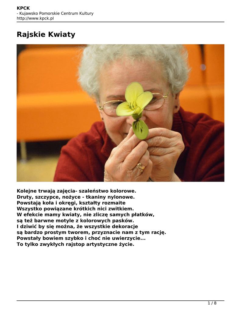 KPCK - Kujawsko Pomorskie Centrum Kultury http://www.kpck.pl Rajskie Kwiaty Kolejne trwają zajęcia- szaleństwo kolorowe. Druty, szczypce, nożyce - tkaniny nylonowe. Powstają koła i okręgi, kształty rozmaite Wszystko powiązane krótkich nici zwitkiem. W efekcie mamy kwiaty, nie zliczę samych płatków, są też barwne motyle z kolorowych pasków. I dziwić by się można, że wszystkie dekoracje są bardzo prostym tworem, przyznacie nam z tym rację. Powstały bowiem szybko i choć nie uwierzycie... To tylko zwykłych rajstop artystyczne życie. 1/8 KPCK - Kujawsko Pomorskie Centrum Kultury http://www.kpck.pl 2/8 KPCK - Kujawsko Pomorskie Centrum Kultury http://www.kpck.pl 3/8 KPCK - Kujawsko Pomorskie Centrum Kultury http://www.kpck.pl 4/8 KPCK - Kujawsko Pomorskie Centrum Kultury http://www.kpck.pl 5/8 KPCK - Kujawsko Pomorskie Centrum Kultury http://www.kpck.pl 6/8 KPCK - Kujawsko Pomorskie Centrum Kultury http://www.kpck.pl Metryczka newsu: 7/8 KPCK - Kujawsko Pomorskie Centrum Kultury http://www.kpck.pl Opublikował – Julian Waszak, dnia 25.01.2017 Kontakt – [email protected], tel. 52 585 15 01 Facebook – zapraszamy do polubienia PIMu na Facebooku Kalendarz – zapraszamy do subskrybowania wydarzeń PIMu Zdjęcia – zapraszamy do obejrzenia naszych albumów na Facebooku Filmy – zapraszamy do obejrzenia naszych filmów na Facebooku Polecamy – portal kulturawzasiegu.pl Zastrzeżenie – treści publikowane na (tej) stronie internetowej przez jej autorów w rozumieniu przepisów ustawy o prawie autorskim i prawach pokrewnych z dnia 4 lutego 1994 r. (t. j. Dz. U. z 2015 r., poz. 1923 z późn. zm.) podlegają ochronie przewidzianej w tej ustawie. Komentarze – informujemy, że nie ponosimy odpowiedzialności za treść zamieszczanych komentarzy. Dane dotyczące IP mogą być udostępniane prokuraturze, sądowi lub organom ścigania na ich wniosek. 8/8 Powered by TCPDF (www.tcpdf.org)