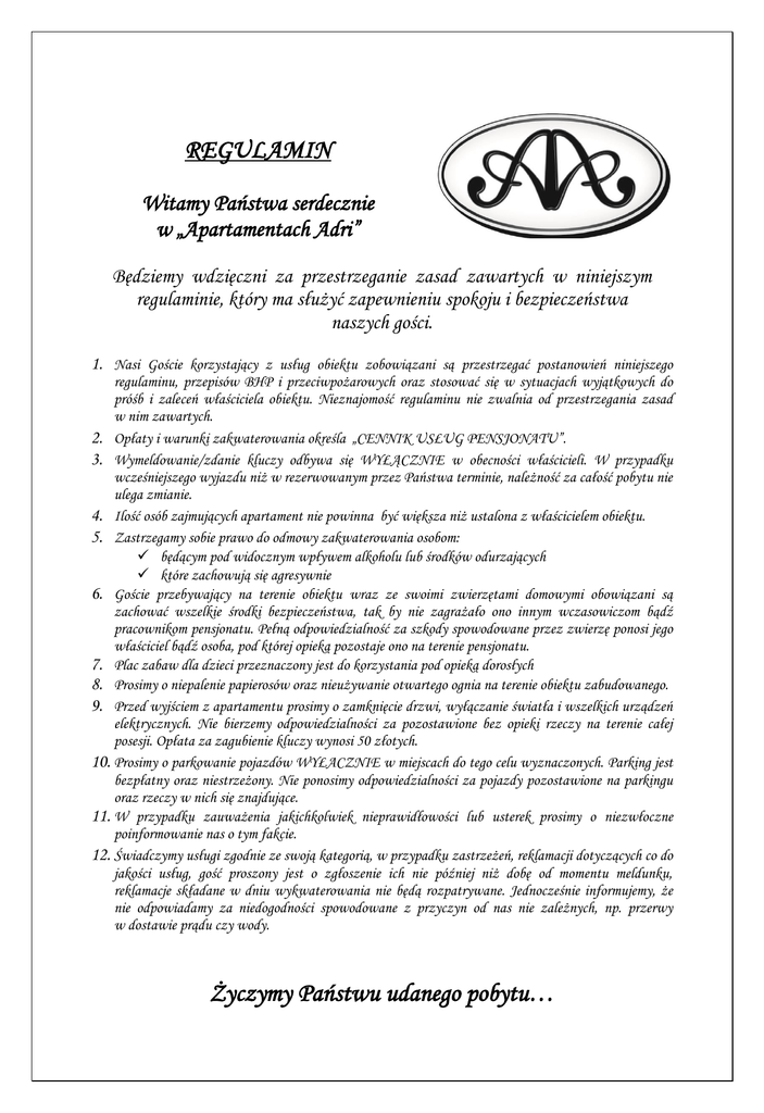 REGULAMIN Witamy Państwa serdecznie w „Apartamentach Adri” Będziemy wdzięczni za przestrzeganie zasad zawartych w niniejszym regulaminie, który ma służyć zapewnieniu spokoju i bezpieczeństwa naszych gości. 1. Nasi Goście korzystający z usług obiektu zobowiązani są przestrzegać postanowień niniejszego regulaminu, przepisów BHP i przeciwpożarowych oraz stosować się w sytuacjach wyjątkowych do próśb i zaleceń właściciela obiektu. Nieznajomość regulaminu nie zwalnia od przestrzegania zasad w nim zawartych. 2. Opłaty i warunki zakwaterowania określa „CENNIK USŁUG PENSJONATU”. 3. Wymeldowanie/zdanie kluczy odbywa się WYŁĄCZNIE w obecności właścicieli. W przypadku wcześniejszego wyjazdu niż w rezerwowanym przez Państwa terminie, należność za całość pobytu nie ulega zmianie. 4. Ilość osób zajmujących apartament nie powinna być większa niż ustalona z właścicielem obiektu. 5. Zastrzegamy sobie prawo do odmowy zakwaterowania osobom:  będącym pod widocznym wpływem alkoholu lub środków odurzających  które zachowują się agresywnie 6. Goście przebywający na terenie obiektu wraz ze swoimi zwierzętami domowymi obowiązani są zachować wszelkie środki bezpieczeństwa, tak by nie zagrażało ono innym wczasowiczom bądź pracownikom pensjonatu. Pełną odpowiedzialność za szkody spowodowane przez zwierzę ponosi jego właściciel bądź osoba, pod której opieką pozostaje ono na terenie pensjonatu. 7. Plac zabaw dla dzieci przeznaczony jest do korzystania pod opieką dorosłych 8. Prosimy o niepalenie papierosów oraz nieużywanie otwartego ognia na terenie obiektu zabudowanego. 9. Przed wyjściem z apartamentu prosimy o zamknięcie drzwi, wyłączanie światła i wszelkich urządzeń elektrycznych. Nie bierzemy odpowiedzialności za pozostawione bez opieki rzeczy na terenie całej posesji. Opłata za zagubienie kluczy wynosi 50 złotych. 10. Prosimy o parkowanie pojazdów WYŁACZNIE w miejscach do tego celu wyznaczonych. Parking jest bezpłatny oraz niestrzeżony. Nie ponosimy odpowiedzialności za pojazdy pozostawione na parkingu oraz rzeczy w nich się znajdujące. 11. W przypadku zauważenia jakichkolwiek nieprawidłowości lub usterek prosimy o niezwłoczne poinformowanie nas o tym fakcie. 12. Świadczymy usługi zgodnie ze swoją kategorią, w przypadku zastrzeżeń, reklamacji dotyczących co do jakości usług, gość proszony jest o zgłoszenie ich nie później niż dobę od momentu meldunku, reklamacje składane w dniu wykwaterowania nie będą rozpatrywane. Jednocześnie informujemy, że nie odpowiadamy za niedogodności spowodowane z przyczyn od nas nie zależnych, np. przerwy w dostawie prądu czy wody. Życzymy Państwu udanego pobytu…