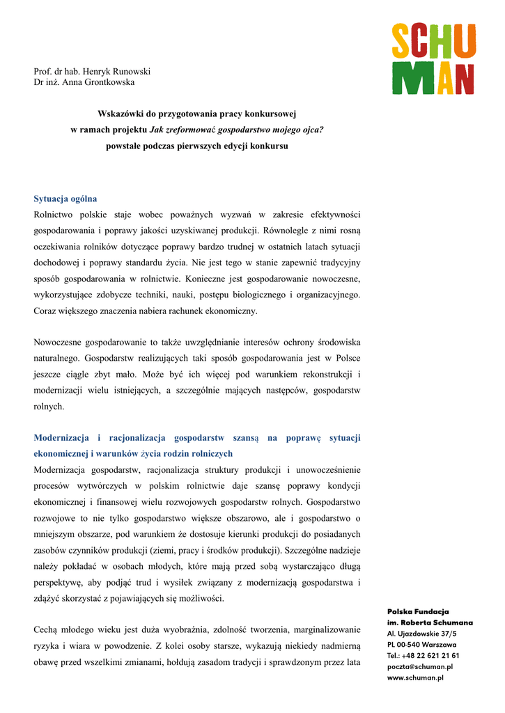 Prof. dr hab. Henryk Runowski Dr inż. Anna Grontkowska Wskazówki do przygotowania pracy konkursowej w ramach projektu Jak zreformować gospodarstwo mojego ojca? powstałe podczas pierwszych edycji konkursu Sytuacja ogólna Rolnictwo polskie staje wobec poważnych wyzwań w zakresie efektywności gospodarowania i poprawy jakości uzyskiwanej produkcji. Równolegle z nimi rosną oczekiwania rolników dotyczące poprawy bardzo trudnej w ostatnich latach sytuacji dochodowej i poprawy standardu życia. Nie jest tego w stanie zapewnić tradycyjny sposób gospodarowania w rolnictwie. Konieczne jest gospodarowanie nowoczesne, wykorzystujące zdobycze techniki, nauki, postępu biologicznego i organizacyjnego. Coraz większego znaczenia nabiera rachunek ekonomiczny. Nowoczesne gospodarowanie to także uwzględnianie interesów ochrony środowiska naturalnego. Gospodarstw realizujących taki sposób gospodarowania jest w Polsce jeszcze ciągle zbyt mało. Może być ich więcej pod warunkiem rekonstrukcji i modernizacji wielu istniejących, a szczególnie mających następców, gospodarstw rolnych. Modernizacja i racjonalizacja gospodarstw szansą na poprawę sytuacji ekonomicznej i warunków życia rodzin rolniczych Modernizacja gospodarstw, racjonalizacja struktury produkcji i unowocześnienie procesów wytwórczych w polskim rolnictwie daje szansę poprawy kondycji ekonomicznej i finansowej wielu rozwojowych gospodarstw rolnych. Gospodarstwo rozwojowe to nie tylko gospodarstwo większe obszarowo, ale i gospodarstwo o mniejszym obszarze, pod warunkiem że dostosuje kierunki produkcji do posiadanych zasobów czynników produkcji (ziemi, pracy i środków produkcji). Szczególne nadzieje należy pokładać w osobach młodych, które mają przed sobą wystarczająco długą perspektywę, aby podjąć trud i wysiłek związany z modernizacją gospodarstwa i zdążyć skorzystać z pojawiających się możliwości. Cechą młodego wieku jest duża wyobraźnia, zdolność tworzenia, marginalizowanie ryzyka i wiara w powodzenie. Z kolei osoby starsze, wykazują niekiedy nadmierną obawę przed wszelkimi zmianami, hołdują zasadom tradycji i sprawdzonym przez lata wzorcom i praktykom. Tak zróżnicowane postawy i podejścia do gospodarowania na roli są często źródłem swoistego konfliktu pokoleń na wsi i wielu rodzinnych nieporozumień. Sytuację tę należy zmieniać poprzez próbę łączenia doświadczeń i obaw przed ryzykiem występujących u osób starszych (rodziców) z wyobraźnią, potrzebą tworzenia i lekceważeniem zagrożeń charakterystycznych dla wieku młodego. Być może warto wspólnie zastanowić się jak zmienić gospodarstwo rodzinne. Gdyby jednak takie wspólne podejście nie było możliwe, osoby młode już z pewnym fachowym przygotowaniem koniecznie powinni zaproponować rodzicom nową wizję gospodarowania i podjąć próby przekonania o swoich racjach. Taka idea przyświeca organizowanemu konkursowi „Jak zreformować gospodarstwo mojego ojca?”. Nowe wyobrażenie o gospodarstwie musi nawiązywać do zasad gospodarki rynkowej i troski o środowisko naturalne. To także gospodarstwo nowoczesne pod każdym względem. Cechy gospodarki rynkowej Gospodarka rynkowa to presja na dobre, efektywne gospodarowanie. To rosnąca konkurencja i dominacja silnych. To otwarte drzwi dla dobrych i najlepszych, a zamykające się możliwości dla słabych i mało sprawnych. To wreszcie rynek dla produktów wysokiej jakości i bariera dla produktów nie spełniających wymaganych standardów. To szansa dla aktywnych i z dużymi aspiracjami, a zagrożenie dla preferujących „spokojne życie”. W której grupie chciałbyś widzieć siebie? Wśród ludzi „skazanych” na sukces, czy na porażkę? Spróbuj swoich sił, przygotuj wizję nowoczesnego gospodarstwa swoich Rodziców. Czym jest nowoczesne gospodarstwo rolne? Nowoczesne gospodarstwo rolne to takie które: wykorzystuje dobrze swoje naturalne warunki i predyspozycje do prowadzenia określonego rodzaju, struktury i wielkości produkcji, prowadzi kierunki produkcji odpowiadające zamiłowaniu i zainteresowaniu oraz przygotowaniu fachowemu rolnika w dostosowaniu do warunków wewnętrznych (glebowych, klimatycznych, rozłogu i ukształtowania terenu, zasobów pracy itp.) i zewnętrznych gospodarstwa (rynki zbytu i zaopatrzenia, konkurencja, sieć komunikacyjna itp.); najlepiej robić to co lubimy, na czym się znamy i w dostosowaniu do istniejących warunków, jednak pod warunkiem, że zapewnia to oczekiwany efekt finansowy, posiada nowoczesne budynki i niezbędne wyposażenie w maszyny i urządzenia do produkcji. Celowo podkreślamy niezbędne wyposażenie, a nie im więcej maszyn, tym lepiej. Maszyny są bowiem coraz droższe i bardziej kosztowne w eksploatacji. Po co więc tracić dochody, skoro można je przeznaczyć na inne cele. Warto też myśleć o zespołowym wykorzystaniu droższych maszyn lub skorzystać z usługi, np. sąsiada, stosuje technologie produkcji zapewniające niskie koszty i wysoką jakość produktów. Warto zainteresować się tzw. integrowanymi metodami produkcji, uwzględnia interesy ochrony środowiska naturalnego i to nie tylko w samym gospodarstwie rolnym, ale i gospodarstwie domowym. Ważna jest, np. prawidłowa gospodarka wodnościekowa, budowa szczelnych zbiorników na gnojówkę lub gnojowicę, płyt obornikowych, szamb, prawidłowe składowanie i stosowanie środków ochrony roślin, zapewnia godziwy dochód z pracy i gwarantuje wygospodarowanie minimum czasu wolnego rolnikowi i członkom jego rodziny. Jak zbudować wizję (plan, projekt) nowoczesnego gospodarstwa? Punktem wyjścia do nakreślenia nowego kształtu gospodarstwa jest analiza jego stanu obecnego, zakończona analizą jego słabych i mocnych stron oraz szans i zagrożeń wynikających z otoczenia. Odpowiadamy tu na pytanie: jak jest i dlaczego? Przekształcając gospodarstwo należy wykorzystać jego mocne strony i znaleźć sposoby na