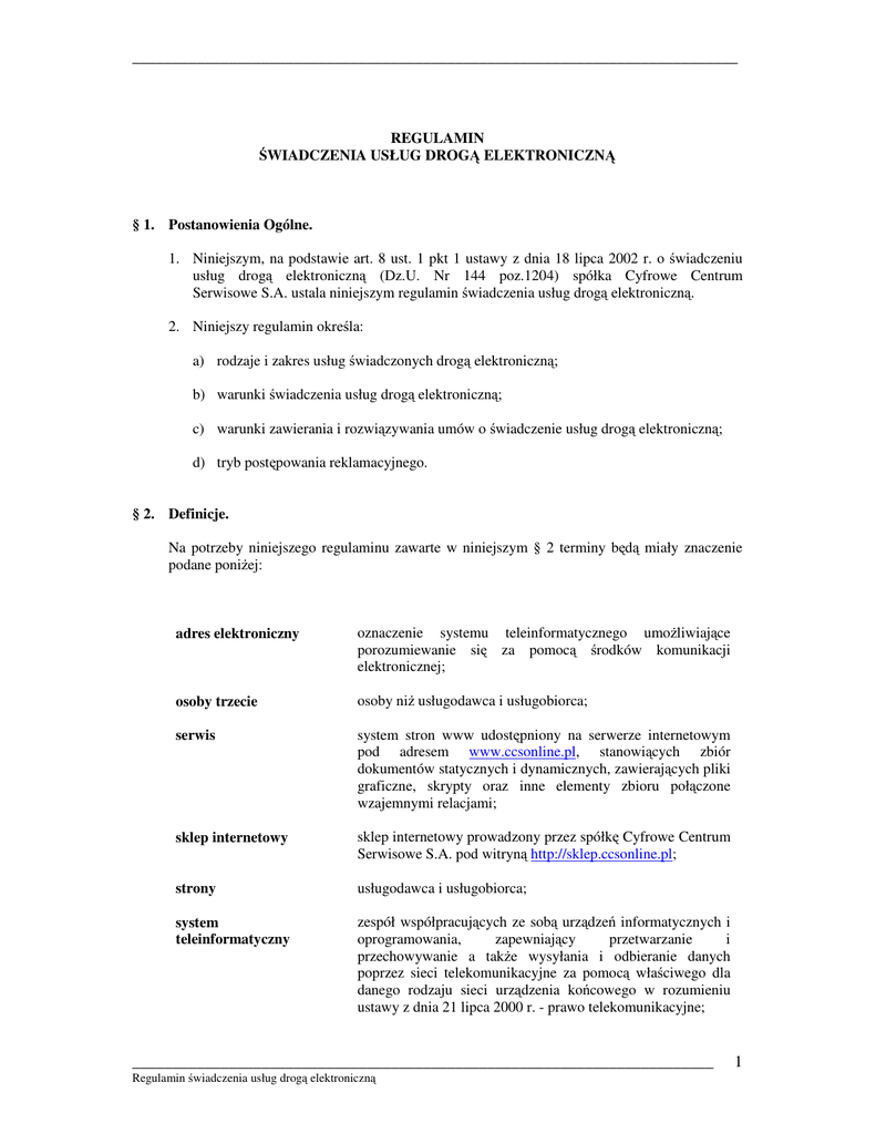 ___________________________________________________________________________ REGULAMIN ŚWIADCZENIA USŁUG DROGĄ ELEKTRONICZNĄ § 1. Postanowienia Ogólne. 1. Niniejszym, na podstawie art. 8 ust. 1 pkt 1 ustawy z dnia 18 lipca 2002 r. o świadczeniu usług drogą elektroniczną (Dz.U. Nr 144 poz.1204) spółka Cyfrowe Centrum Serwisowe S.A. ustala niniejszym regulamin świadczenia usług drogą elektroniczną. 2. Niniejszy regulamin określa: a) rodzaje i zakres usług świadczonych drogą elektroniczną; b) warunki świadczenia usług drogą elektroniczną; c) warunki zawierania i rozwiązywania umów o świadczenie usług drogą elektroniczną; d) tryb postępowania reklamacyjnego. § 2. Definicje. Na potrzeby niniejszego regulaminu zawarte w niniejszym § 2 terminy będą miały znaczenie podane poniżej: adres elektroniczny oznaczenie systemu teleinformatycznego umożliwiające porozumiewanie się za pomocą środków komunikacji elektronicznej; osoby trzecie osoby niż usługodawca i usługobiorca; serwis system stron www udostępniony na serwerze internetowym pod adresem www.ccsonline.pl, stanowiących zbiór dokumentów statycznych i dynamicznych, zawierających pliki graficzne, skrypty oraz inne elementy zbioru połączone wzajemnymi relacjami; sklep internetowy sklep internetowy prowadzony przez spółkę Cyfrowe Centrum Serwisowe S.A. pod witryną http://sklep.ccsonline.pl; strony usługodawca i usługobiorca; system teleinformatyczny zespół współpracujących ze sobą urządzeń informatycznych i oprogramowania, zapewniający przetwarzanie i przechowywanie a także wysyłania i odbieranie danych poprzez sieci telekomunikacyjne za pomocą właściwego dla danego rodzaju sieci urządzenia końcowego w rozumieniu ustawy z dnia 21 lipca 2000 r. - prawo telekomunikacyjne; ________________________________________________________________________ Regulamin świadczenia usług drogą elektroniczną 1 ___________________________________________________________________________ środki komunikacji elektronicznej rozwiązania techniczne, w tym urządzenia teleinformatyczne i współpracujące z nimi narzędzia programowe, umożliwiające indywidualne porozumiewanie się na odległość przy wykorzystaniu transmisji danych między systemami teleinformatycznym, a w szczególności pocztę elektroniczną; świadczenie usługi drogą elektroniczną wykonanie usługi świadczonej bez jednoczesnej obecności stron (na odległość), poprzez przekaz danych na indywidualne żądanie usługobiorcy, przesyłanej i otrzymywanej za pomocą urządzeń do elektronicznego przetwarzania, włącznie z kompresją cyfrową i przechowywania danych, która jest w całości nadawana, odbierana lub transmitowana za pomocą sieci telekomunikacyjnej w rozumieniu ustawy z dnia 16 lipca 2004 r. – prawo telekomunikacyjne; usługi usługi świadczone drogą elektroniczną; usługodawca Cyfrowe Centrum Serwisowe S.A. z siedzibą w Warszawie, adres : ul. Taneczna 18 C (kod pocztowy : 02-829), wpisana do rejestru przedsiębiorców prowadzonego przez Sąd Rejonowy dla m.st. Warszawy w Warszawie XIII wydział gospodarczy krajowego rejestru sądowego pod numerem KRS 0000253995, numer NIP: 951-19-78-674, numer Regon: 016321051, numer GIOŚ: E0002111WZ. § 3. Rodzaje i zakres usług świadczonych drogą elektroniczną. 1. Usługodawca świadczy następujące usługi: a) usługi informacyjne; b) usługi komunikacyjne; c) usługi w zakresie organizacji sprzedaży produktów przy wykorzystaniu sklepu internetowego. 2. Usługi są świadczone przy wykorzystaniu serwisu. § 4. Zakres usług informacyjnych. 1. Usługi informacyjne polegają na udostępnianiu na indywidualne żądanie usługobiorcy informacji umieszczonych w ramach serwisu poprzez wyświetlenie strony o określonym adresie URL, zawierającej indywidualnie żądane przez usługobiorcę dane informacyjne. 2. W ramach usług informacyjnych wyróżnia się w szczególności: a) usługi, w ramach których usługobiorca uzyskuje ogólne informacje dotyczące usługodawcy i profilu jego działalności, oferowanych przez usługodawcę stanowisk pracy a także informacje osobach wskazanych przez usługodawcę do kontaktu; korzystanie z powołanych w niniejszym punkcie usług zapewniają specjalistyczne zakładki w ramach serwisu w tym zakładki „O nas”, „Dystrybucja”, „Serwis”, „Praca”, „Punkty Serwisowe”. „n”, „Kontakt”; ________________________________________________________________________ Regulamin świadczenia usług drogą elektroniczną 2 ___________________________________________________________________________ b) usługi, w ramach których usługobiorca będący partnerem biznesowym usługodawcy w zakresie prowadzonej działalności serwisowej może uzyskiwać od usługodawcy komunikaty i procedury oraz dokumentację techniczną; możliwość korzystania z powołanych komunikatów, procedur oraz dokumentacji, zapisanych w formie elektronicznej następuje po zalogowaniu się za pośrednictwem funkcji „dla Partnerów”, znajdującej się w zakładce „Punkty Serwisowe”; c) usługi, w ramach których usługobiorca będący klientem serwisu prowadzonego przez usługodawcę, uzyskuje dostęp do informacji o statusie naprawy sprzętu oddanego do serwisu usługodawcy; możliwość korzystania z powołanych w niniejszym punkcie usług zapewnia funkcjonalność zakładki „status naprawy”; d) usługi, w ramach których usługobiorca, będący klientem serwisu prowadzonego przez usługodawcę, uzyskuje dostęp do dokumentacji zdjęciowej naprawianego sprzętu, o ile takowa dokumentacja została wykonana; możliwość korzystania z powołanych w niniejszym punkcie usług zapewnia funkcjonalność zakładki „dokumentacja zdjęciowa”. § 5. Zakres usług komunikacyjnych. 1. Usługi komunikacyjne polegają na umożliwieniu na indywidualne żądanie usługobiorcy komunikacji z odpowiednim działem usługodawcy. 2. W ramach usług ko