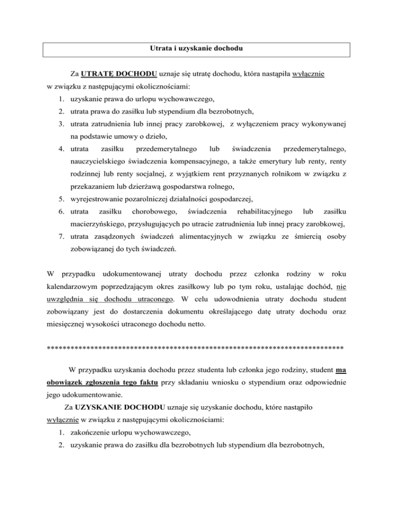 Utrata i uzyskanie dochodu Za UTRATĘ DOCHODU uznaje się utratę dochodu, która nastąpiła wyłącznie w związku z następującymi okolicznościami: 1. uzyskanie prawa do urlopu wychowawczego, 2. utrata prawa do zasiłku lub stypendium dla bezrobotnych, 3. utrata zatrudnienia lub innej pracy zarobkowej, z wyłączeniem pracy wykonywanej na podstawie umowy o dzieło, 4. utrata zasiłku przedemerytalnego lub świadczenia przedemerytalnego, nauczycielskiego świadczenia kompensacyjnego, a także emerytury lub renty, renty rodzinnej lub renty socjalnej, z wyjątkiem rent przyznanych rolnikom w związku z przekazaniem lub dzierżawą gospodarstwa rolnego, 5. wyrejestrowanie pozarolniczej działalności gospodarczej, 6. utrata zasiłku chorobowego, świadczenia rehabilitacyjnego lub zasiłku macierzyńskiego, przysługujących po utracie zatrudnienia lub innej pracy zarobkowej, 7. utrata zasądzonych świadczeń alimentacyjnych w związku ze śmiercią osoby zobowiązanej do tych świadczeń. W przypadku udokumentowanej utraty dochodu przez członka rodziny w roku kalendarzowym poprzedzającym okres zasiłkowy lub po tym roku, ustalając dochód, nie uwzględnia się dochodu utraconego. W celu udowodnienia utraty dochodu student zobowiązany jest do dostarczenia dokumentu określającego datę utraty dochodu oraz miesięcznej wysokości utraconego dochodu netto. *************************************************************************** W przypadku uzyskania dochodu przez studenta lub członka jego rodziny, student ma obowiązek zgłoszenia tego faktu przy składaniu wniosku o stypendium oraz odpowiednie jego udokumentowanie. Za UZYSKANIE DOCHODU uznaje się uzyskanie dochodu, które nastąpiło wyłącznie w związku z następującymi okolicznościami: 1. zakończenie urlopu wychowawczego, 2. uzyskanie prawa do zasiłku dla bezrobotnych lub stypendium dla bezrobotnych, 3. uzyskanie zatrudnienia lub innej pracy zarobkowej, z wyłączeniem pracy wykonywanej na podstawie umowy o dzieło, 4. uzyskanie zasiłku przedemerytalnego lub świadczenia przedemerytalnego, nauczycielskiego świadczenia kompensacyjnego, a także emerytury lub renty, renty rodzinnej lub renty socjalnej, z wyjątkiem rent przyznanych rolnikom w związku z przekazaniem lub dzierżawą gospodarstwa rolnego, 5. rozpoczęcie pozarolniczej działalności gospodarczej, 6. uzyskanie zasiłku chorobowego, świadczenia rehabilitacyjnego lub zasiłku macierzyńskiego, przysługujących po utracie zatrudnienia lub innej pracy zarobkowej. W przypadku uzyskania dochodu przez członka rodziny w roku kalendarzowym poprzedzającym okres zasiłkowy, ustalając dochód członka rodziny, uzyskany w tym roku dochód dzieli się przez liczbę miesięcy, w których ten dochód został ten został osiągnięty, jeżeli dochód ten jest uzyskiwany w dniu ustalania prawa do stypendium. W celu udowodnienia tego faktu student winien dostarczyć dokument określający wysokość dochodu netto uzyskanego przez członka rodziny oraz liczbę miesięcy, w których dochód był osiągany. W przypadku uzyskania dochodu przez członka rodziny po roku kalendarzowym poprzedzającym okres zasiłkowy, dochód ustala się na podstawie dochodu powiększonego o kwotę uzyskanego dochodu z miesiąca następującego po miesiącu, w którym dochód został osiągnięty, jeżeli dochód ten jest uzyskiwany w dniu ustalania prawa do stypendium. W celu udowodnienia tego faktu student winien dostarczyć dokument określający wysokość dochodu netto uzyskanego przez członka rodziny z miesiąca następującego po miesiącu, w którym dochód został osiągnięty. Zmiana warunków zatrudnienia nie jest nową pracą, a więc nie jest to też uzyskanie dochodu (np. wzrost wynagrodzenia, zwiększenie wymiaru etatu), ani też utrata dochodu (np. zmniejszenie wynagrodzenia, zmniejszenie wymiaru etatu). *przez dochód netto należy rozumieć przychód pomniejszony o koszty uzyskania przychodu, składki na ubezpieczenia społeczne nie zaliczone do kosztów uzyskania przychodu, składki na ubezpieczenia zdrowotne, podatek należny