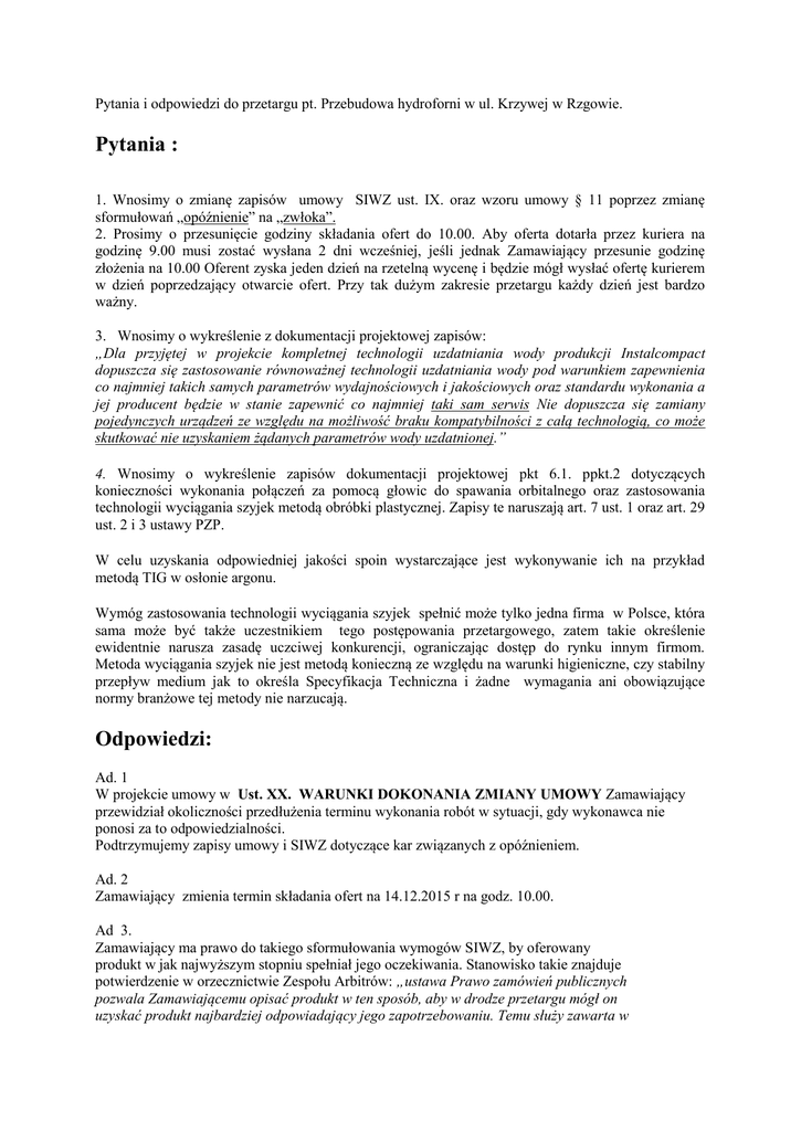 Pytania i odpowiedzi do przetargu pt. Przebudowa hydroforni w ul. Krzywej w Rzgowie. Pytania : 1. Wnosimy o zmianę zapisów umowy SIWZ ust. IX. oraz wzoru umowy § 11 poprzez zmianę sformułowań „opóźnienie” na „zwłoka”. 2. Prosimy o przesunięcie godziny składania ofert do 10.00. Aby oferta dotarła przez kuriera na godzinę 9.00 musi zostać wysłana 2 dni wcześniej, jeśli jednak Zamawiający przesunie godzinę złożenia na 10.00 Oferent zyska jeden dzień na rzetelną wycenę i będzie mógł wysłać ofertę kurierem w dzień poprzedzający otwarcie ofert. Przy tak dużym zakresie przetargu każdy dzień jest bardzo ważny. 3. Wnosimy o wykreślenie z dokumentacji projektowej zapisów: „Dla przyjętej w projekcie kompletnej technologii uzdatniania wody produkcji Instalcompact dopuszcza się zastosowanie równoważnej technologii uzdatniania wody pod warunkiem zapewnienia co najmniej takich samych parametrów wydajnościowych i jakościowych oraz standardu wykonania a jej producent będzie w stanie zapewnić co najmniej taki sam serwis Nie dopuszcza się zamiany pojedynczych urządzeń ze względu na możliwość braku kompatybilności z całą technologią, co może skutkować nie uzyskaniem żądanych parametrów wody uzdatnionej.” 4. Wnosimy o wykreślenie zapisów dokumentacji projektowej pkt 6.1. ppkt.2 dotyczących konieczności wykonania połączeń za pomocą głowic do spawania orbitalnego oraz zastosowania technologii wyciągania szyjek metodą obróbki plastycznej. Zapisy te naruszają art. 7 ust. 1 oraz art. 29 ust. 2 i 3 ustawy PZP. W celu uzyskania odpowiedniej jakości spoin wystarczające jest wykonywanie ich na przykład metodą TIG w osłonie argonu. Wymóg zastosowania technologii wyciągania szyjek spełnić może tylko jedna firma w Polsce, która sama może być także uczestnikiem tego postępowania przetargowego, zatem takie określenie ewidentnie narusza zasadę uczciwej konkurencji, ograniczając dostęp do rynku innym firmom. Metoda wyciągania szyjek nie jest metodą konieczną ze względu na warunki higieniczne, czy stabilny przepływ medium jak to określa Specyfikacja Techniczna i żadne wymagania ani obowiązujące normy branżowe tej metody nie narzucają. Odpowiedzi: Ad. 1 W projekcie umowy w Ust. XX. WARUNKI DOKONANIA ZMIANY UMOWY Zamawiający przewidział okoliczności przedłużenia terminu wykonania robót w sytuacji, gdy wykonawca nie ponosi za to odpowiedzialności. Podtrzymujemy zapisy umowy i SIWZ dotyczące kar związanych z opóźnieniem. Ad. 2 Zamawiający zmienia termin składania ofert na 14.12.2015 r na godz. 10.00. Ad 3. Zamawiający ma prawo do takiego sformułowania wymogów SIWZ, by oferowany produkt w jak najwyższym stopniu spełniał jego oczekiwania. Stanowisko takie znajduje potwierdzenie w orzecznictwie Zespołu Arbitrów: „ustawa Prawo zamówień publicznych pozwala Zamawiającemu opisać produkt w ten sposób, aby w drodze przetargu mógł on uzyskać produkt najbardziej odpowiadający jego zapotrzebowaniu. Temu służy zawarta w ustawie konstrukcja specyfikacji istotnych warunków zamówienia” (sygn. akt UZP/ZO/0521/05). Zamawiający nie przychyla się do wniosku i podtrzymuje zapisy w SIWZ że nie dopuszcza się zmiany wybranych pojedynczych elementów urządzeń. Ad . 4 Intencją Zamawiającego jest wykonanie wysokiego standardu wykonania oraz eliminacji osadzania się zanieczyszczeń w miejscach rozgałęziania oraz stabilnego przepływu medium. Połączenia stali nierdzewnej wykonane w technologii kształtowania szyjek przewyższają inne metody wykonania rozgałęzień, dlatego właśnie przyjęty w dokumentacji technicznej sposób obróbki plastycznej musi zostać zachowany(to zwężki, trójniki, króćce, kolana itp. wykonane ze stali nierdzewnej). Metoda ta stosowana jest w przemyśle farmaceutycznym, spożywczym, chemicznym w związku z tym jest wiele firm, które tę metodę stosują m.in Wilo Polska, Bartosz. Pytania : Pytanie 1 Z jakiego materiału należy wykonać zbiorniki zestawów aeracji i filtracji ? Odp: - wykonanie ze stali nierdzewnej typ 304 Pytanie 2. Jaki zestaw pompy płucznej należy skalkulować do wyceny (w projekcie pojawiają się dwa typy)? Odp: Zestaw pompy płucznej TP 125-130/4/5,5 kW lub równoważny Pytanie 3. W opisie technicznym SUW Gospodarz w dziale „Technologia montażu zestawów technologicznych” opisany jest sposób wykonania połączeń rurociągów wodnych w budynku -Czy Zamawiający ze względu na obniżenie kosztów dopuszcza wykonanie połączeń rurociągów metodą obróbki skrawaniem na budowie ? Odp: Wykonanie połączeń wykonać zgodnie z projektem to jest : rozgałęzienia rur wykonać w technologii wyciągania szyjek metodą obróbki plastycznej a połączenia za pomocą zamkniętych głowic do spawania orbitalnego. Orurowanie urządzeń technologii w budynku SUW należy wykonać w warunkach stabilnej produkcji- Nie dopuszcza się spawania na obiekcie Pytanie 4 W kosztorysie branży urządzeń technologicznych wpisane jest "trawienie i pasywacja powierzchni wykonanych ze stali kwasoodpornej". W dalszej cześć kosztorysu brakuje jednak pozycji gdzie można by to pozycję uwzględnić. Proszę o wskazanie pozycji w kosztorysie gdzie należy wycenić trawienie i pasywacje. Odp: Przy wycenie materiału. Pytanie 5 W rozdziale I SIWZ pkt 18 Zamawiający dopuszcza możliwość zaproponowania urządzeń równoważnych – prosimy o wyspecyfikowanie jakie dokumenty powinny być dołączone do oceny technicznej oferty w przypadku zaproponowania urządzeń zamiennych: Wszyscy oferenci w celu oceny technicznej oferty już na etapie przetargu są zobowiązani załączyć do oferty : a) karty katalogowe zestawów technologicznych z dokładnymi wymiarami i opisem technicznym; b) atesty PZH na kompletne zestawy technologiczne: hydroforowego, aeracji filtracji, pompy płucznej, dmuchawy, rozdzielni pneumatycznej należy. Nie dopuszcza się stosowania ates