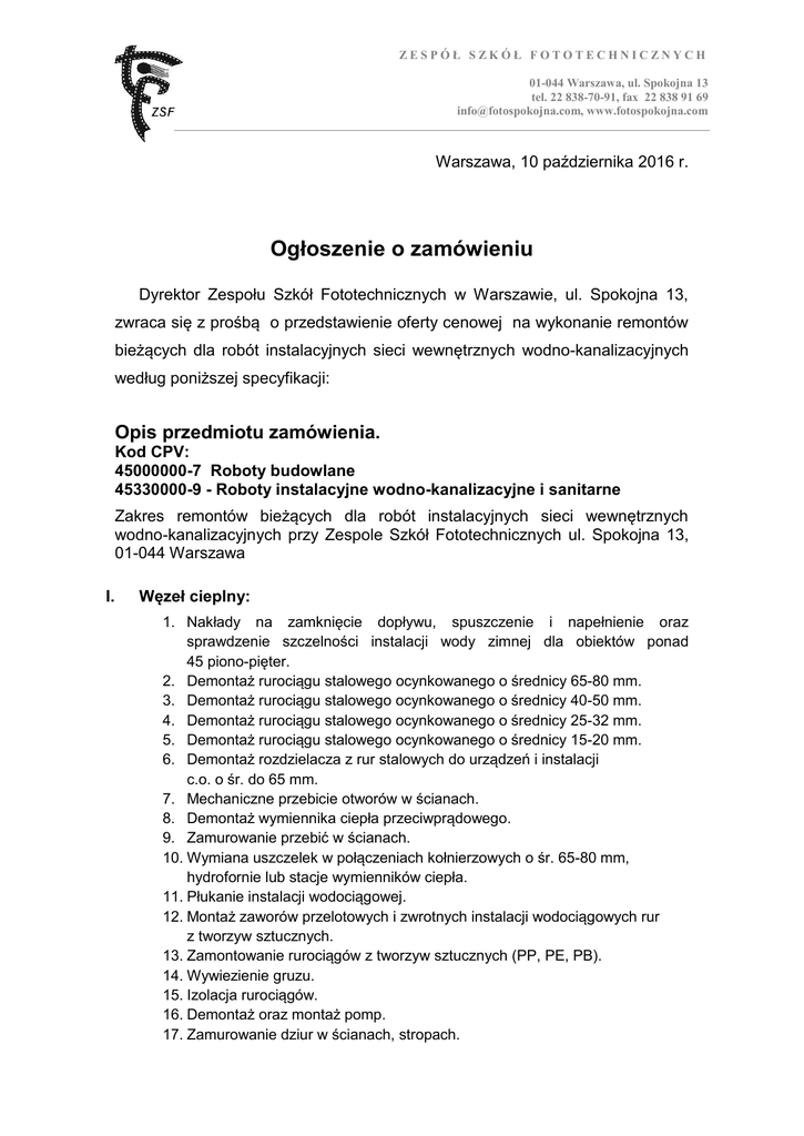 ZESPÓŁ SZKÓŁ FOTOTECHNICZNYCH 01-044 Warszawa, ul. Spokojna 13 tel. 22 838-70-91, fax 22 838 91 69 [email protected], www.fotospokojna.com Warszawa, 10 października 2016 r. Ogłoszenie o zamówieniu Dyrektor Zespołu Szkół Fototechnicznych w Warszawie, ul. Spokojna 13, zwraca się z prośbą o przedstawienie oferty cenowej na wykonanie remontów bieżących dla robót instalacyjnych sieci wewnętrznych wodno-kanalizacyjnych według poniższej specyfikacji: Opis przedmiotu zamówienia. Kod CPV: 45000000-7 Roboty budowlane 45330000-9 - Roboty instalacyjne wodno-kanalizacyjne i sanitarne Zakres remontów bieżących dla robót instalacyjnych sieci wewnętrznych wodno-kanalizacyjnych przy Zespole Szkół Fototechnicznych ul. Spokojna 13, 01-044 Warszawa I. Węzeł cieplny: 1. Nakłady na zamknięcie dopływu, spuszczenie i napełnienie oraz sprawdzenie szczelności instalacji wody zimnej dla obiektów ponad 45 piono-pięter. 2. Demontaż rurociągu stalowego ocynkowanego o średnicy 65-80 mm. 3. Demontaż rurociągu stalowego ocynkowanego o średnicy 40-50 mm. 4. Demontaż rurociągu stalowego ocynkowanego o średnicy 25-32 mm. 5. Demontaż rurociągu stalowego ocynkowanego o średnicy 15-20 mm. 6. Demontaż rozdzielacza z rur stalowych do urządzeń i instalacji c.o. o śr. do 65 mm. 7. Mechaniczne przebicie otworów w ścianach. 8. Demontaż wymiennika ciepła przeciwprądowego. 9. Zamurowanie przebić w ścianach. 10. Wymiana uszczelek w połączeniach kołnierzowych o śr. 65-80 mm, hydrofornie lub stacje wymienników ciepła. 11. Płukanie instalacji wodociągowej. 12. Montaż zaworów przelotowych i zwrotnych instalacji wodociągowych rur z tworzyw sztucznych. 13. Zamontowanie rurociągów z tworzyw sztucznych (PP, PE, PB). 14. Wywiezienie gruzu. 15. Izolacja rurociągów. 16. Demontaż oraz montaż pomp. 17. Zamurowanie dziur w ścianach, stropach. ZESPÓŁ SZKÓŁ FOTOTECHNICZNYCH 01-044 Warszawa, ul. Spokojna 13 tel. 22 838-70-91, fax 22 838 91 69 [email protected], www.fotospokojna.com II. Wymiana rur wodociągowych zasilających hydrant w budynku głównym szkoły oraz w piwnicy w budynku laboratorium. 1. Demontaż rurociągu stalowego ocynkowanego o śr. 65-80 mm. 2. Demontaż skrzynek hydrantowych wnękowych. 3. Demontaż hydrantu ściennego. 4. Demontaż zaworu przelotowego lub zwrotnego o śr. 40-50 mm. 5. Demontaż i montaż rurociągów stalowych ocynkowanych do hydrantów. 6. Montaż nowych szafek hydrantowych. 7. Montaż nowego hydrantu. 8. Przebicia otworów w ścianach. 9. Wywiezienie gruzu. 10. Zamurowanie dziur w ścianach i stropach. 11. Malowanie ścian po przebiciach. III. Wymiana rurociągów bytowych w całym budynku: 1. Demontaż rur stalowych ocynkowanych. 2. Montaż rurociągów z tworzyw sztucznych. 3. Montaż zaworów przelotowych i zwrotnych. 4. Wykucie otworów. 5. Zabetonowanie otworów. 6. Wykucie bruzd poziomych. 7. Zabetonowanie bruzd poziomych. 8. Wymiana baterii umywalkowych. 9. Wymiana umywalek porcelanowych bez wsporników z syfonem z tworzywa. 10. Wymiana płytek okładzinowych, ściennych, kamionkowych i ceramicznych 30x30 cm układanych na kleju o powierzchni do 1 m2 w jednym miejscu. 11. Próba szczelności instalacji wodociągowych z rur tworzyw sztucznych. 12. Płukanie instalacji wodociągowej. 13. Izolacja rurociągów otulinami Thermaflex. 14. Wywiezienie gruzu. IV. Wymiana rurociągów bytowych w piwnicy budynku laboratoryjnego. 1. Demontaż rurociągu stalowego ocynkowanego. 2. Mechaniczne przebicie otworów. 3. Demontaż wymiennika ciepła przeciwprądowego. 4. Zamurowanie przebić w ścianach 5. Próba szczelności instalacji wodociągowych z rur tworzyw sztucznych. 6. Płukanie instalacji wodociągowej. 7. Montaż zaworów przelotowych i zwrotnych rur z tworzyw sztucznych. 8. Montaż rurociągów z tworzyw sztucznych (PP, PE, PB) 9. Wywiezienie gruzu. 10. Izolacja rurociągów otulinami Thermaflex ZESPÓŁ SZKÓŁ FOTOTECHNICZNYCH 01-044 Warszawa, ul. Spokojna 13 tel. 22 838-70-91, fax 22 838 91 69 [email protected], www.fotospokojna.com V. Wymiana pionów w budynku laboratorium. 1. 2. 3. 4. 5. 6. 7. Demontaż rurociągu stalowego ocynkowanego. Mechaniczne przebicie otworów. Zamurowanie przebić w ścianach. Montaż rurociągów z tworzyw sztucznych. Próba szczelności wodociągowych rur z tworzyw sztucznych. Płukanie instalacji wodociągowej. Wywiezienie gruzu. Przewidywany termin wykonania usługi do 09.12.2016 roku. Prosimy o podanie scalonego kosztu materiałów i robocizny wykonania w/w remontu w ujętych wyżej 5-ciu obszarach. Oferty należy składać w terminie do 26 października 2016 roku: w sekretariacie szkoły (Warszawa, ul. Spokojna 13 - I piętro p. 214) via e-mail ([email protected]) Osoby do kontaktu: 1. Grażyna Dobrzyńska-Klepacz Dyrektor Zespołu Szkół Fototechnicznych 48 22 838 70 91 2. Szczegółowe informacje: Krzysztof Jędrzejewski Specjalista ds. technicznych w ZSF 48 22 838 70 91