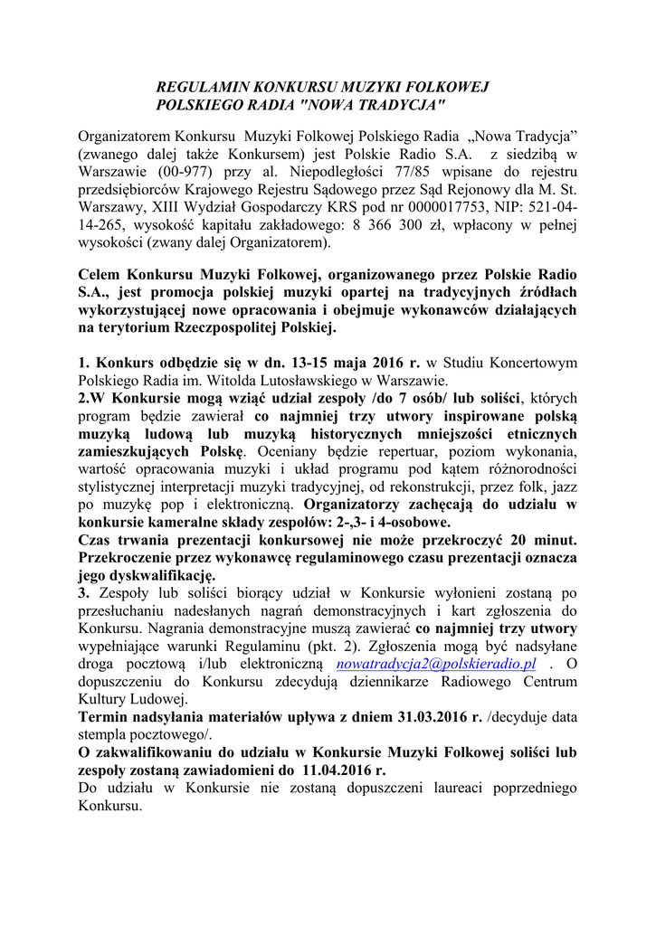 REGULAMIN KONKURSU MUZYKI FOLKOWEJ POLSKIEGO RADIA "NOWA TRADYCJA" Organizatorem Konkursu Muzyki Folkowej Polskiego Radia „Nowa Tradycja” (zwanego dalej także Konkursem) jest Polskie Radio S.A. z siedzibą w Warszawie (00-977) przy al. Niepodległości 77/85 wpisane do rejestru przedsiębiorców Krajowego Rejestru Sądowego przez Sąd Rejonowy dla M. St. Warszawy, XIII Wydział Gospodarczy KRS pod nr 0000017753, NIP: 521-0414-265, wysokość kapitału zakładowego: 8 366 300 zł, wpłacony w pełnej wysokości (zwany dalej Organizatorem). Celem Konkursu Muzyki Folkowej, organizowanego przez Polskie Radio S.A., jest promocja polskiej muzyki opartej na tradycyjnych źródłach wykorzystującej nowe opracowania i obejmuje wykonawców działających na terytorium Rzeczpospolitej Polskiej. 1. Konkurs odbędzie się w dn. 13-15 maja 2016 r. w Studiu Koncertowym Polskiego Radia im. Witolda Lutosławskiego w Warszawie. 2.W Konkursie mogą wziąć udział zespoły /do 7 osób/ lub soliści, których program będzie zawierał co najmniej trzy utwory inspirowane polską muzyką ludową lub muzyką historycznych mniejszości etnicznych zamieszkujących Polskę. Oceniany będzie repertuar, poziom wykonania, wartość opracowania muzyki i układ programu pod kątem różnorodności stylistycznej interpretacji muzyki tradycyjnej, od rekonstrukcji, przez folk, jazz po muzykę pop i elektroniczną. Organizatorzy zachęcają do udziału w konkursie kameralne składy zespołów: 2-,3- i 4-osobowe. Czas trwania prezentacji konkursowej nie może przekroczyć 20 minut. Przekroczenie przez wykonawcę regulaminowego czasu prezentacji oznacza jego dyskwalifikację. 3. Zespoły lub soliści biorący udział w Konkursie wyłonieni zostaną po przesłuchaniu nadesłanych nagrań demonstracyjnych i kart zgłoszenia do Konkursu. Nagrania demonstracyjne muszą zawierać co najmniej trzy utwory wypełniające warunki Regulaminu (pkt. 2). Zgłoszenia mogą być nadsyłane droga pocztową i/lub elektroniczną [email protected] . O dopuszczeniu do Konkursu zdecydują dziennikarze Radiowego Centrum Kultury Ludowej. Termin nadsyłania materiałów upływa z dniem 31.03.2016 r. /decyduje data stempla pocztowego/. O zakwalifikowaniu do udziału w Konkursie Muzyki Folkowej soliści lub zespoły zostaną zawiadomieni do 11.04.2016 r. Do udziału w Konkursie nie zostaną dopuszczeni laureaci poprzedniego Konkursu. 4. Konkurs, rejestrowany przez Polskie Radio S.A., będzie się odbywać 13 i 14 maja 2016r. od godz.16. Prezentacje konkursowe oceniane będą przez jury, złożone z muzyków i dziennikarzy muzycznych, powołane przez Dyrektora Programu 2 Polskiego Radia S.A. Koncert laureatów odbędzie się 15 maja. Laureaci zobowiązani są do udziału w koncercie finałowym transmitowanym przez Program 2 Polskiego Radia S.A. 5. Jury po wysłuchaniu programów konkursowych przyzna Grand Prix ufundowaną przez Ministra Kultury i Dziedzictwa Narodowego oraz nagrody regulaminowe fundowane przez Polskie Radio. Wysokość kwoty przeznaczonej na nagrody zostanie ogłoszona do dnia 13 maja 2016r. Jedna z nagród będzie Specjalną Nagrodą im. Czesława Niemena przyznaną zespołowi lub soliście za wyróżniającą kreację artystyczną. W przypadku dużej różnorodności stylistycznej wykonawców biorących udział w konkursie jury może przyznać nagrody w kategoriach: muzyka rekonstruowana, muzyka inspirowana tradycją (etno-jazz, muzyka klezmerska itp.) oraz folk-rock/nowe brzmienia. Decyzję o tworzeniu kategorii podejmuje jury. Wyróżniający się solista- instrumentalista otrzyma nagrodę „Złote Gęśle” ufundowaną przez Program 2 Polskiego Radia. 6. Podczas Konkursu Muzyki Folkowej jury przyzna nagrodę specjalną za najbardziej twórcze nawiązanie do nagrań archiwalnych opublikowanych na płytach z serii „Muzyka Źródeł”. 7. Organizator zapewnia dopuszczonym do Konkursu zespołom lub solistom nocleg podczas trwania Festiwalu. 8. Zgłoszenie do Konkursu jest równoznaczne ze zgodą na bezpłatną rejestrację i emisję radiową przesłuchań konkursowych i koncertu laureatów. Wykonawcy uczestniczący w przesłuchaniach konkursowych/kierownik zespołu zgadzają się, aby Polskie Radio S.A w sposób nieograniczony pod względem czasu i przestrzeni rozporządzało i korzystało ze wszystkich artystycznych wykonań dokonanych w trakcie koncertów konkursowych i koncertu laureatów, w całości i we fragmentach, na następujących polach eksploatacji: a) utrwalenia dowolną technika audialną; b) zwielokrotniania dla celów dokumentacyjnych i nadawczych; c) publiczne udostępnianie w taki sposób, aby każdy mógł mieć dostęp do artystycznego wykonania w miejscu i czasie przez siebie wybranym (w tym wprowadzenia do pamięci komputera i do sieci typu Internet); d) nadawania za pomocą przekazów radiowych przez stacje przewodowe lub bezprzewodowe, naziemne lub satelitarne, z zastrzeżeniem, że artyści wykonawcy zachowują prawo do opłat za nadania powtórkowe płatnych przez nadawców za pośrednictwem właściwych organizacji zbiorowego zarządzania prawami pokrewnymi. e) zwielokrotniania w. w. wykonań w promocyjnych wydawnictwach fonograficznych Polskiego Radia S.A. f) rozpowszechnianie w zagranicznych rozgłośniach radiowych działających w ramach Europejskiej Unii Radiowej (EBU). W przypadku skierowania wobec Organizatora roszczeń przez osobę trzecią z tytułu naruszenia jakichkolwiek jej praw w związku z dokonanym zgłoszeniem do Konkursu wykonawca/kierownik zespołu zobowiązuje się, że podejmie wszelkie działania w celu oddalenia tych roszczeń, a także że pokryje koszty i szkody z nimi związane oraz że wstąpi w miejsce Organizatora do toczących się postępowań sądowych lub w braku takiej możliwości przystąpić do postępowania po stronie Organizatora. W przypadku zgłoszenia do Konkursu dokonanego przez kierownika zespołu oświadcza on, że posiada zgody wykonawców na udział