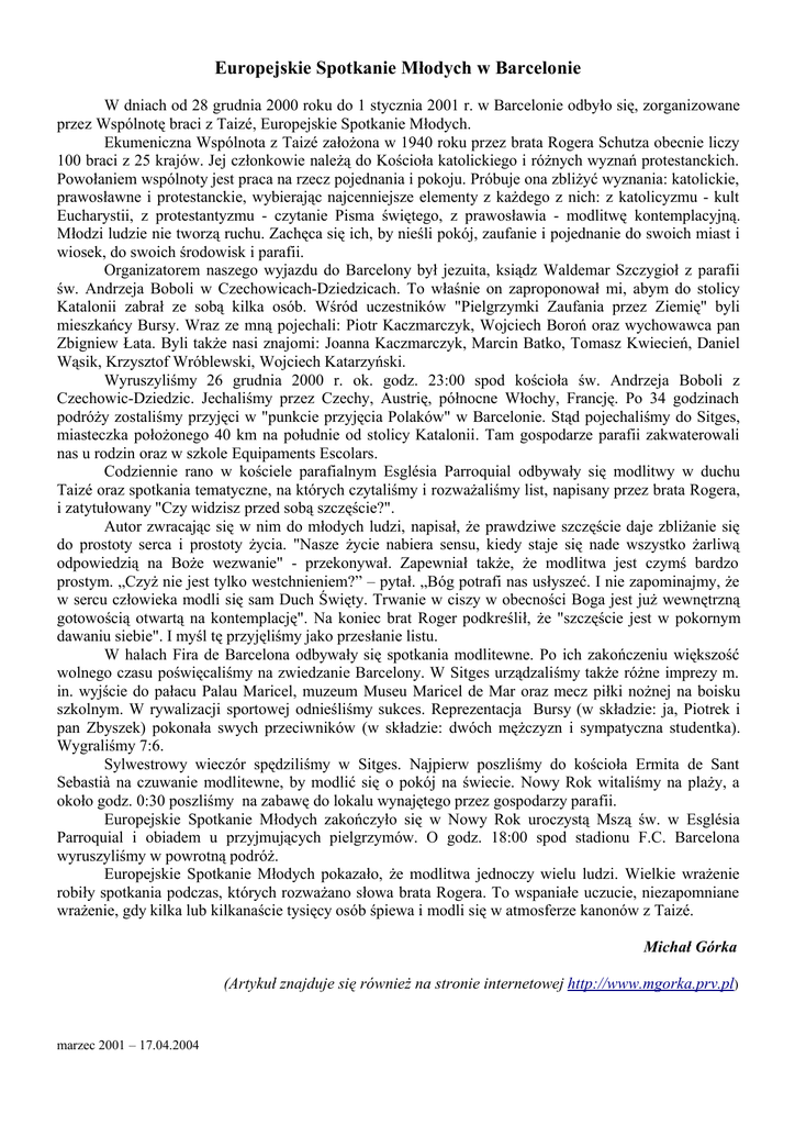 Europejskie Spotkanie Młodych w Barcelonie W dniach od 28 grudnia 2000 roku do 1 stycznia 2001 r. w Barcelonie odbyło się, zorganizowane przez Wspólnotę braci z Taizé, Europejskie Spotkanie Młodych. Ekumeniczna Wspólnota z Taizé założona w 1940 roku przez brata Rogera Schutza obecnie liczy 100 braci z 25 krajów. Jej członkowie należą do Kościoła katolickiego i różnych wyznań protestanckich. Powołaniem wspólnoty jest praca na rzecz pojednania i pokoju. Próbuje ona zbliżyć wyznania: katolickie, prawosławne i protestanckie, wybierając najcenniejsze elementy z każdego z nich: z katolicyzmu - kult Eucharystii, z protestantyzmu - czytanie Pisma świętego, z prawosławia - modlitwę kontemplacyjną. Młodzi ludzie nie tworzą ruchu. Zachęca się ich, by nieśli pokój, zaufanie i pojednanie do swoich miast i wiosek, do swoich środowisk i parafii. Organizatorem naszego wyjazdu do Barcelony był jezuita, ksiądz Waldemar Szczygioł z parafii św. Andrzeja Boboli w Czechowicach-Dziedzicach. To właśnie on zaproponował mi, abym do stolicy Katalonii zabrał ze sobą kilka osób. Wśród uczestników "Pielgrzymki Zaufania przez Ziemię" byli mieszkańcy Bursy. Wraz ze mną pojechali: Piotr Kaczmarczyk, Wojciech Boroń oraz wychowawca pan Zbigniew Łata. Byli także nasi znajomi: Joanna Kaczmarczyk, Marcin Batko, Tomasz Kwiecień, Daniel Wąsik, Krzysztof Wróblewski, Wojciech Katarzyński. Wyruszyliśmy 26 grudnia 2000 r. ok. godz. 23:00 spod kościoła św. Andrzeja Boboli z Czechowic-Dziedzic. Jechaliśmy przez Czechy, Austrię, północne Włochy, Francję. Po 34 godzinach podróży zostaliśmy przyjęci w "punkcie przyjęcia Polaków" w Barcelonie. Stąd pojechaliśmy do Sitges, miasteczka położonego 40 km na południe od stolicy Katalonii. Tam gospodarze parafii zakwaterowali nas u rodzin oraz w szkole Equipaments Escolars. Codziennie rano w kościele parafialnym Església Parroquial odbywały się modlitwy w duchu Taizé oraz spotkania tematyczne, na których czytaliśmy i rozważaliśmy list, napisany przez brata Rogera, i zatytułowany "Czy widzisz przed sobą szczęście?". Autor zwracając się w nim do młodych ludzi, napisał, że prawdziwe szczęście daje zbliżanie się do prostoty serca i prostoty życia. "Nasze życie nabiera sensu, kiedy staje się nade wszystko żarliwą odpowiedzią na Boże wezwanie" - przekonywał. Zapewniał także, że modlitwa jest czymś bardzo prostym. „Czyż nie jest tylko westchnieniem?” – pytał. „Bóg potrafi nas usłyszeć. I nie zapominajmy, że w sercu człowieka modli się sam Duch Święty. Trwanie w ciszy w obecności Boga jest już wewnętrzną gotowością otwartą na kontemplację". Na koniec brat Roger podkreślił, że "szczęście jest w pokornym dawaniu siebie". I myśl tę przyjęliśmy jako przesłanie listu. W halach Fira de Barcelona odbywały się spotkania modlitewne. Po ich zakończeniu większość wolnego czasu poświęcaliśmy na zwiedzanie Barcelony. W Sitges urządzaliśmy także różne imprezy m. in. wyjście do pałacu Palau Maricel, muzeum Museu Maricel de Mar oraz mecz piłki nożnej na boisku szkolnym. W rywalizacji sportowej odnieśliśmy sukces. Reprezentacja Bursy (w składzie: ja, Piotrek i pan Zbyszek) pokonała swych przeciwników (w składzie: dwóch mężczyzn i sympatyczna studentka). Wygraliśmy 7:6. Sylwestrowy wieczór spędziliśmy w Sitges. Najpierw poszliśmy do kościoła Ermita de Sant Sebastià na czuwanie modlitewne, by modlić się o pokój na świecie. Nowy Rok witaliśmy na plaży, a około godz. 0:30 poszliśmy na zabawę do lokalu wynajętego przez gospodarzy parafii. Europejskie Spotkanie Młodych zakończyło się w Nowy Rok uroczystą Mszą św. w Església Parroquial i obiadem u przyjmujących pielgrzymów. O godz. 18:00 spod stadionu F.C. Barcelona wyruszyliśmy w powrotną podróż. Europejskie Spotkanie Młodych pokazało, że modlitwa jednoczy wielu ludzi. Wielkie wrażenie robiły spotkania podczas, których rozważano słowa brata Rogera. To wspaniałe uczucie, niezapomniane wrażenie, gdy kilka lub kilkanaście tysięcy osób śpiewa i modli się w atmosferze kanonów z Taizé. Michał Górka (Artykuł znajduje się również na stronie internetowej http://www.mgorka.prv.pl) marzec 2001 – 17.04.2004