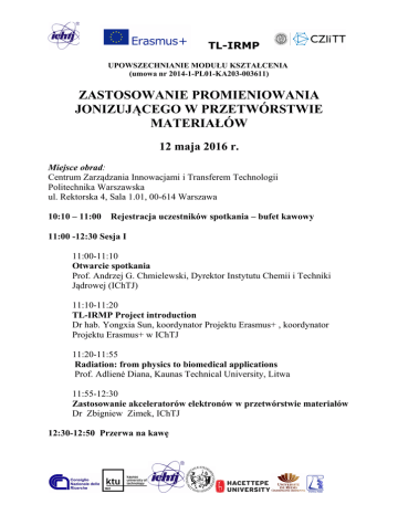 TL-IRMP UPOWSZECHNIANIE MODUŁU KSZTAŁCENIA (umowa nr 2014-1-PL01-KA203-003611) ZASTOSOWANIE PROMIENIOWANIA JONIZUJĄCEGO W PRZETWÓRSTWIE MATERIAŁÓW 12 maja 2016 r. Miejsce obrad: Centrum Zarządzania Innowacjami i Transferem Technologii Politechnika Warszawska ul. Rektorska 4, Sala 1.01, 00-614 Warszawa 10:10 – 11:00 Rejestracja uczestników spotkania – bufet kawowy 11:00 -12:30 Sesja I 11:00-11:10 Otwarcie spotkania Prof. Andrzej G. Chmielewski, Dyrektor Instytutu Chemii i Techniki Jądrowej (IChTJ) 11:10-11:20 TL-IRMP Project introduction Dr hab. Yongxia Sun, koordynator Projektu Erasmus+ , koordynator Projektu Erasmus+ w IChTJ 11:20-11:55 Radiation: from physics to biomedical applications Prof. Adlienė Diana, Kaunas Technical University, Litwa 11:55-12:30 Zastosowanie akceleratorów elektronów w przetwórstwie materiałów Dr Zbigniew Zimek, IChTJ 12:30-12:50 Przerwa na kawę TL-IRMP 12:50-14:00 Sesja II 12:50-13:25 Od nauki do technologii – sieciowane radiacyjnie polimery Dr hab. Grażyna Przybytniak, IChTJ 13:25-14:00 Radiacyjne przetwórstwo materiałów – nanotechnologie Prof. Andrzej G. Chmielewski, IChTJ 14:00-14:45 Przerwa na lunch 14:45-15:50 Sesja III 14:45 -15:00 Bachelor of Science study programme in Faculty of Applied Chemistry and Materials Science Prof. Ioan CALINESCU, Dean of the Faculty: "Applied Chemistry and Materials Science” (FACMS), University Politehnica of Bucharest, Rumunia 15:00-15:15 M.Sc. and Ph.D. students education programme in Faculty of Applied Chemistry and Materials Science Prof. Vasile Lavric, Director of Doctoral School: "Applied Chemistry and Materials Science", University Politehnica of Bucharest, Rumunia 15:15-15:30 Internationalization study programme in Xi’an Jiaotong University Prof. Zhaolin Gu, Excutive dean of School of Human settlements and Civil Engineering, Xi’an Jiaotong University, Chiny 15:30 – 16:00 Dyskusja 16:00 Zakończenie spotkania