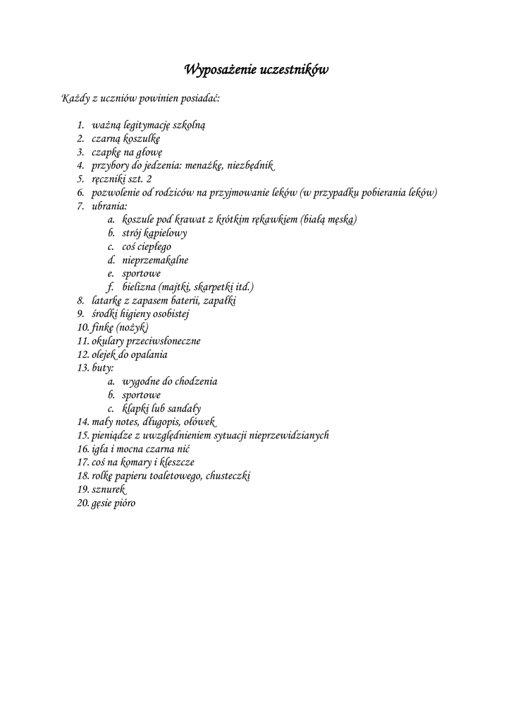 Wyposażenie uczestników Każdy z uczniów powinien posiadać: 1. 2. 3. 4. 5. 6. 7. ważną legitymację szkolną czarną koszulkę czapkę na głowę przybory do jedzenia: menażkę, niezbędnik ręczniki szt. 2 pozwolenie od rodziców na przyjmowanie leków (w przypadku pobierania leków) ubrania: a. koszule pod krawat z krótkim rękawkiem (białą męską) b. strój kąpielowy c. coś ciepłego d. nieprzemakalne e. sportowe f. bielizna (majtki, skarpetki itd.) 8. latarkę z zapasem baterii, zapałki 9. środki higieny osobistej 10. finkę (nożyk) 11. okulary przeciwsłoneczne 12. olejek do opalania 13. buty: a. wygodne do chodzenia b. sportowe c. klapki lub sandały 14. mały notes, długopis, ołówek 15. pieniądze z uwzględnieniem sytuacji nieprzewidzianych 16. igła i mocna czarna nić 17. coś na komary i kleszcze 18. rolkę papieru toaletowego, chusteczki 19. sznurek 20. gęsie pióro