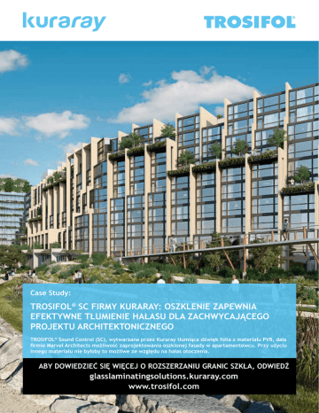 Case Study: TROSIFOL® SC firmy Kuraray: oszklenie zapewnia efektywne tłumienie hałasu dla zachwycającego projektu architektonicznego TROSIFOL® Sound Control (SC), wytwarzana przez Kuraray tłumiąca dźwięk folia z materiału PVB, dała firmie Marvel Architects możliwość zaprojektowania oszklonej fasady w apartamentowcu. Przy użyciu innego materiału nie byłoby to możliwe ze względu na hałas otoczenia. Aby dowiedzieć się więcej o rozszerzaniu granic szkła, odwiedź glasslaminatingsolutions.kuraray.com www.trosifol.com TROSIFOL® SC firmy Kuraray: oszklenie zapewnia efektywne tłumienie hałasu dla zachwycającego projektu architektonicznego Dzielnica Brooklyn Heights, w pobliżu niedawno przebudowanego wybrzeża o długości jednej mili, które wchodzi w skład 34-hektarowego Brooklyn Bridge Park – tutaj stoi budynek Pierhouse. Mieści apartamenty liczące od jednej do pięciu sypialni. Ma dwie fasady. Jedna z nich powtarza tradycyjny wygląd budynków z brązowego kamienia, tak bardzo powszechny w Brooklynie. Druga fasada odznacza się wielkimi oszklonymi powierzchniami, które każdemu apartamentowi zapewniają niezrównany widok na nowojorski port i na park. Uprzemysłowione społeczeństwo jest świadkiem wzrostu, niemal podwojenia gęstości ruchu na drogach, w powietrzu i na torach w ciągu minionych dwudziestu lat. W efekcie uciążliwość hałasu dla populacji dramatycznie wzrosła z powodu zwiększonej gęstości zasiedlenia oraz zabudowywania terenów zrekultywowanych i terenów wewnątrz miast. Do projektantów i architektów docierają coraz mocniejsze apele o stosowanie rozwiązań wyciszających dźwięki przenikające do budynków, aby skutki problemów powodowanych przez hałas można było utrzymać w akceptowalnych granicach. W wyniku tych apeli, jak również w następstwie znaczącego rozszerzenia użytkowania szkła do celów konstrukcyjnych i estetycznych, szczególnie ważne stało się prawidłowe projektowanie oszklonych powierzchni dla budynków, które będą narażone na wyższe natężenia hałasu. Dennis Vermeulen, dyrektor firmy Marvel Architects, mówi o budynku Pierhouse: - Lokalizacja tego projektu oznaczała, że musieliśmy uwzględnić różnorodne zewnętrzne źródła hałasu. W przypadku apartamentów skierowanych na East River i Brooklyn Bridge Park hałas dociera z działalności w parku, w tym z koncertów muzycznych, a także od śmigłowców przelatujących w kierunku do i z Dolnego Manhattanu. Od strony Brooklynu musieliśmy zmierzyć się z hałasem ruchu kołowego na Brooklyn Queens Expressway i z hałasem przemysłowym z rejonu zwanego DUMBO (skrót od Down Under the Manhattan Bridge Overpass – pod wiaduktem mostu Manhattan Bridge). Podstawowym celem naszego projektu była minimalizacja hałasu przy jednoczesnym zapewnieniu maksymalnej ilości światła. TROSIFOL® SC jest jedyną szeroko dostępną jednowarstwową folią tłumiącą dźwięk. Materiał ten w aspekcie danych technicznych, wykonawstwa i estetyki dał projektantom z Marvel Architects oraz laminatorom (firma JE Berkowitz) i wykonawcom oszklenia (firma Alubon) więcej korzyści niż oszklenie z wielowarstwowymi foliami dźwiękochłonnymi. Budynek Pierhouse podlega licznym przepisom budowlanym. Na przykład elewacja i oszklenie muszą spełniać wymagania New York City Bulding Code, a zagadnienia zużycia energii są regulowane przez New York City Energy Conservation Code. Dla wielu obszarów New York City istnieją wymagania dla parametrów akustycznych, opracowane na podstawie „E designation zoning”, czyli map uciążliwości i zagrożeń środowiskowych, które leżą w gestii New York City Office of Environmental Remediation. Dla opisywanego przedsięwzięcia podwyższenie właściwości akustycznych wykonano z własnej inicjatywy. Wymagania dla redukcji hałasu oparto na wielkościach określonych przez Outside Inside Transmission Class (OITC). Parametry te są podobne do Weighted Sound Reduction Index (Rw), który stosowany jest w Unii Europejskiej i w całej reszcie świata. Wielkości zawarte w OITC mają na celu zapewnienie pojedynczego wskaźnika klasyfikującego dla okien i drzwi wystawionych na hałas powodowany przez środki transportu (samoloty, samochody, pociągi) jak również na hałas z innych źródeł na niskich i średnich częstotliwościach. Kategoria OITC określana jest na podstawie właściwości akustycznych w zakresie od 80 Hz do 4000 Hz, natomiast wskaźnik Rw dla zakresu od 100 Hz do 3150 Hz. TROSIFOL® SC firmy Kuraray: oszklenie zapewnia efektywne tłumienie hałasu dla zachwycającego projektu architektonicznego Materiał TROSIFOL® SC jest używany w wielu zastosowaniach izolacyjnych, łączy znakomite tłumienie dźwięku ze wszystkimi zaletami konwencjonalnej folii TROSIFOL® PVB. Nawet w pojedynczych laminowanych panelach ze szkła bezpiecznego folia TROSIFOL® SC ujawnia swoje nadzwyczajne właściwości ochronne. W porównaniu do zastosowania standardowej folii PVB użycie materiału TROSIFOL® SC jest wstanie poprawić tłumienie o 3 dB. Lance Bischoff, dyrektor techniczny ds. akustyki, hałasu i wibracji w firmie konsultanckiej AKRF, wykonał ocenę wpływu środowiska w aspekcie tłumienia dźwięku dla projektu Pierhouse. Oprócz wykonywania badań nad hałasem w różnych przedsięwzięciach, AKRF wspomaga architektów oraz konsultantów do spraw elewacji w doborze oszklenia pod względem akustycznym w celu spełnienia wymagań OITC. Wykonuje również na rzecz właściciela lub zespołu projektowego niezależne badania laboratoryjne, które są świadectwem wykonania pomiarów akustycznych na makietach. Oprócz współczynnika przepuszczalności światła równego 88% oraz niskiego współczynnika zażółcenia, TROSIFOL® SC spełnia wszystkie wymagania norm EN 14449 i EN ISO 12543-4, a poprzez to zapewnia długi okres użytkowania. Jednowarstwowa budowa folii ułatwia laminatorom pracę w porównaniu do
