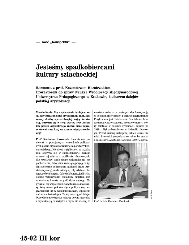 — Gość „Konspektu” — Jesteśmy spadkobiercami kultury szlacheckiej Rozmowa z prof. Kazimierzem Karolczakiem, Prorektorem do spraw Nauki i Współpracy Mie˛dzynarodowej Uniwersytetu Pedagogicznego w Krakowie, badaczem dziejów polskiej arystokracji Prof. Kazimierz Karolczak: Niestety nie, ponieważ w powojennych warunkach politycznych polska arystokracja utraciła podstawy bytu materialnego. Nie ulega wa˛tpliwości, że to, jaka˛ role˛ odgrywa sie˛ w społeczeństwie, wynika w znacznej mierze z możliwości finansowych. Nie wystarczy samo dobre wykształcenie czy pochodzenie, żeby mieć znacza˛ca˛ pozycje˛ w życiu społeczno-politycznym jakiegoś kraju. Arystokracja odgrywała wioda˛ca˛ role˛ właśnie dlatego, że była bogata. Człowiek bogaty, jeśli tylko dobrze wykorzystuje posiadany maja˛tek, jest zauważalny i może uczynić dużo dobrego. Na pytanie, czy współcześnie arystokracja ma szanse˛, żeby znowu pokazać sie˛ w polityce (np. zagranicznej) lub w życiu kulturalnym, odpowiem natomiast twierdza˛co. To sie˛ zreszta˛ już dzieje. Oczywiście nie wszyscy kojarza˛ pewne nazwiska z arystokracja˛, w zwia˛zku z czym nie wiemy, że 45-02 III kor niektóre osoby z tzw. wyższych sfer funkcjonuja˛ w polskich instytucjach i polityce zagranicznej. Przykładem jest działalność Stanisława Jana Andrzeja Czartoryskiego, obecnie emeryta, który zaistniał w polskiej dyplomacji dopiero po 1989 r. Był ambasadorem w Holandii i Norwegii. Przed zmiana˛ ustrojowa˛ takich szans nie miał. Prowadził gospodarstwo rolne, bo musiał z czegoś żyć. Arystokracja przed 1989 r., a zwła- fot. M. Kania Marcin Kania: Czy współcześnie istnieje szansa, aby świat polskiej arystokracji, taki, jaki znamy choćby sprzed drugiej wojny światowej, odrodził sie˛ w swej dawnej świetności? Czy polska arystokracja znowu może reprezentować nasz kraj na arenie mie˛dzynarodowej? Prof. dr hab. Kazimierz Karolczak 6 — Gość „Konspektu” — szcza w latach pie˛ćdziesia˛tych, miała utrudniony doste˛p do wyższych uczelni. Ludzi z „dobrym nazwiskiem” władze PRL-u z założenia traktowały gorzej. A działalność polskiej arystokracji przed 1989 r. na emigracji? Przecież wydaje sie˛, że ludzie ci mieli wie˛ksze możliwości na zachodzie Europy? Członkowie polskiej arystokracji, którzy znaleźli sie˛ po drugiej wojnie światowej w Europie Zachodniej, mieli możliwości dwojakiego rodzaju. Była garstka bardzo bogatej arystokracji, która przez lata gromadziła za granica˛ fortuny. Taki maja˛tek posiadali Braniccy, później Reyowie. Do nich należało Montrésor – miejscowość położona w Regionie Centralnym Francji, w departamencie Indre-et-Loire. Braniccy zreszta˛ wspomagali po wojnie inne rodziny arystokratyczne. Gdy dziś odwiedzimy Montrésor, odnajdziemy tam spora˛ liczbe˛ potomków polskiej arystokracji. Przyjeżdżali oni do tego miasta jak do enklawy polskości na obczyźnie. Tam kupowali domki (nie pałace czy zamki) i zaczynali nowe życie, w nowej rzeczywistości. Tak jak inni emigranci szukali pracy. Przyjaźnie˛ sie˛ z Jackiem Kajem Grocholskim herbu Syrokomla, którego stryj w eleganckim, acz znoszonym garniturze we˛drował po Londynie w poszukiwaniu zaje˛cia, co uznawano za osobliwość, a on naprawde˛ nie miał z czego żyć. Czym on zreszta˛ mógł zaimponować zachodniej arystokracji, jeśli nie posiadał możliwości finansowych? Nawet tym, którzy już przed wojna˛ parali sie˛ dyplomacja˛, nie było łatwo odnaleźć sie˛ na gruncie dyplomacji zachodniej. Udawało sie˛ to cze˛sto dopiero drugiemu pokoleniu, urodzonemu, wychowanemu i wykształconemu już na obczyźnie. Atutem arystokratycznych emigrantów była znajomość je˛zyka polskiego, a przede wszystkim – dobra orientacja w realiach polskich, czyli znajomość tego, co działo sie˛ za Żelazna˛ Kurtyna˛. Mieli ła˛czność z krajem. Zauważamy czasem, że przyjeżdżaja˛cy do nas ambasador nosi swojsko brzmia˛ce nazwisko, na przykład Rey. Także wśród przedstawicieli wielkich korporacji zachodnich, które weszły do Polski po Konspekt 1/2013 (46) 1989 r., znajdujemy osoby o brzmia˛cych z polska nazwiskach. Na pocza˛tku lat dziewie˛ćdziesia˛tych szefem PTK Centertel był Edward Mier-Je˛drzejowicz, który przybył z Londynu. Na czele Fundacji Orange stane˛ła Jadwiga Czartoryska, która przyjechała z Paryża. Takich przykładów możemy znaleźć jeszcze mnóstwo. Innym sposobem odnajdywania sie˛ polskich arystokratów za granica˛ były i sa˛ mariaże. Madeleine Nowina Konopka z Montrésor, wnuczka właścicieli podkrakowskiego Głogoczowa, wyszła za ma˛ż za Ferdinanda Degenfelda von Schönburg, pochodza˛cego z wielkiej niemieckiej arystokracji (jego matka˛ jest ksie˛żniczka Wilhelmina Windisch-Grätz). Oznacza to, że potomkini rodu Dzieduszyckich (jej matka˛ jest Helena Dzieduszycka) weszła do arystokracji niemieckiej przez małżeństwo. Mieszka w starym zamczysku w Bawarii, ale sama jednak nie odgrywa wie˛kszej roli w życiu towarzyskim tamtejszej arystokracji. Chca˛c przekazać swoim dorastaja˛cym dzieciom troche˛ wiedzy o dokonaniach przodków, namawia mnie na odbycie w tym roku wspólnej podróży po śladach Dzieduszyckich na dzisiejszej Ukrainie. Inny przykład: naste˛pca tronu Belgii Filip Koburg, ksia˛że˛ Brabancji, poślubił w 1999 r. Matylde˛ d’Udekem d’Acoz, która jest najstarszym z pie˛ciorga dzieci hrabiego Patricka d’Udekem d’Acoz i hrabiny Anny Komorowskiej, wnuczki Adama Zygmunta Sapiehy. Za sprawa˛ tego małżeństwa w duńskiej rodzinie królewskiej pojawiła sie˛ domieszka polskiej krwi arystokratycznej. Czy potomkowie arystokracji w Polsce moga˛ dzisiaj coś znaczyć? Myśle˛, że tak. Dzieje sie˛ tak, ponieważ ci, którzy wracaja˛ do ojczyzny, szukaja˛ swoich korzeni. Przykładem jest chociażby Edward Mier-Je˛drzejowicz z Zaczernia, którego żona˛ jest Krystyna Bnińska